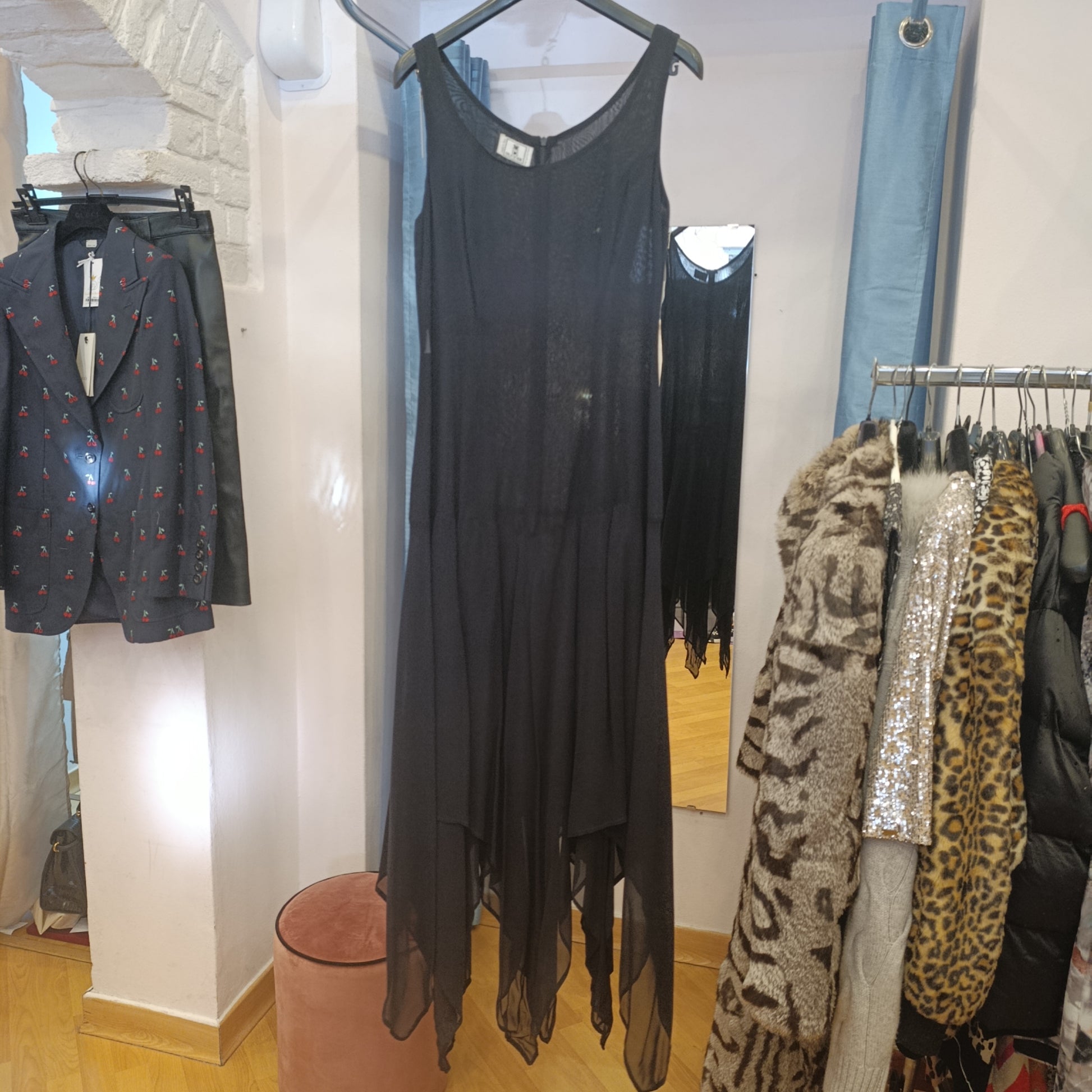 Abito blu notte smanicato con taglio gonna molto particolare e morbido.