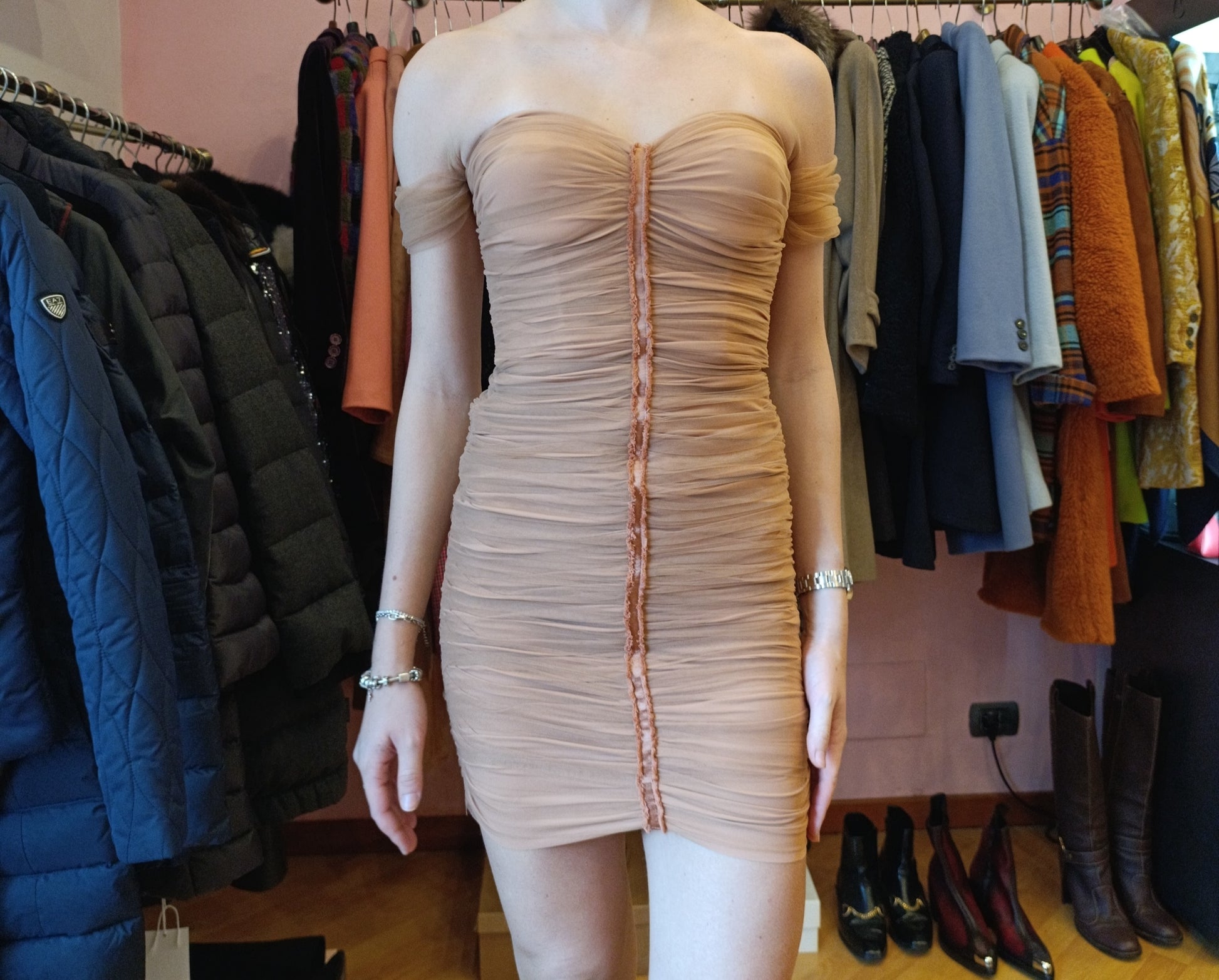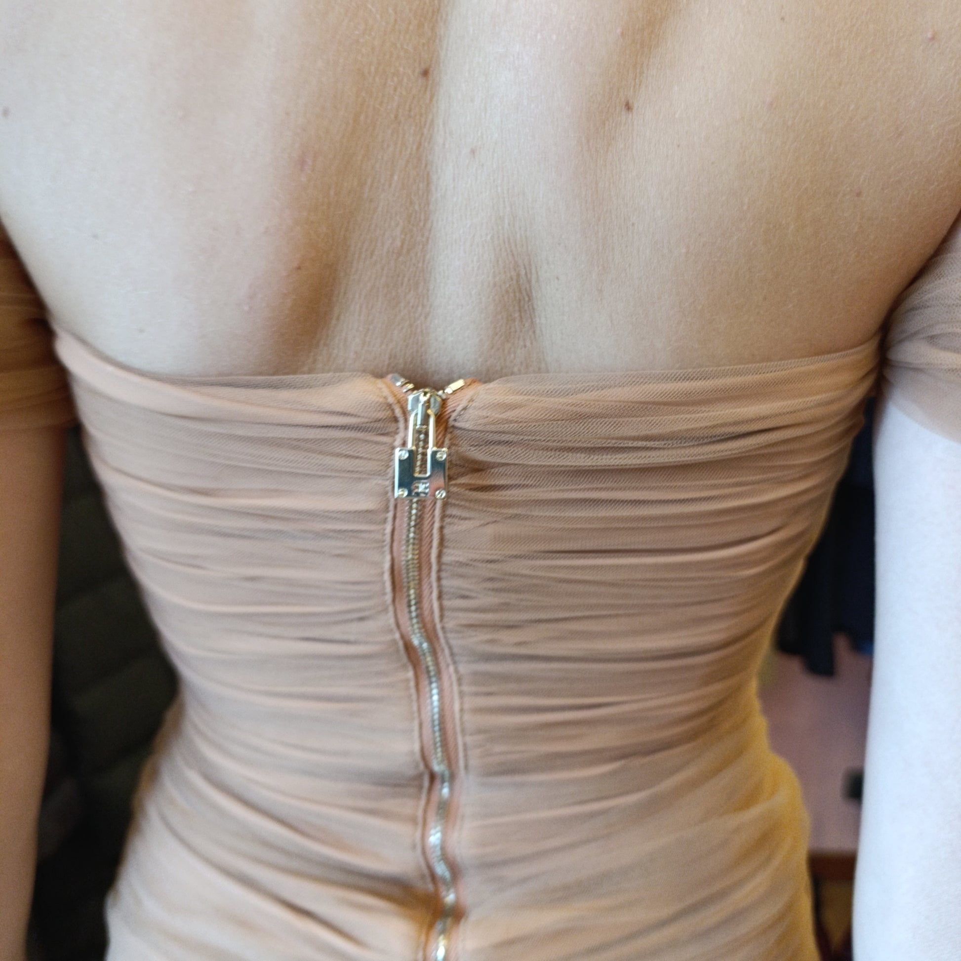 Ha tutta l'arricciatura fronte e retro all'abito in tulle colore cipria bellissimo.