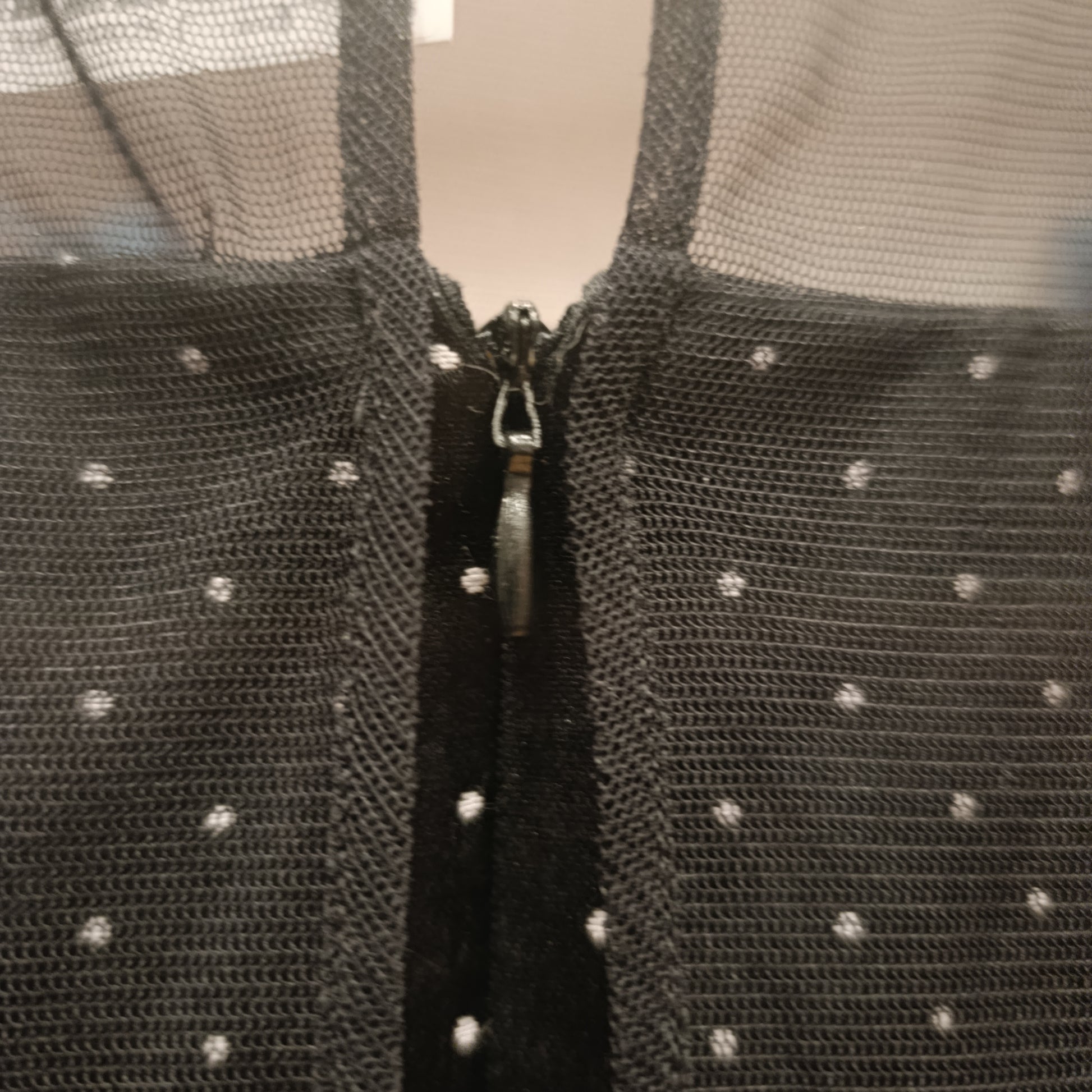 Capo molto lavorato e particolare, la parte delle maniche e dello scollo è in trasparenza, parte del seno a pois, e gonna ampia a strati con fantasia floreale.
