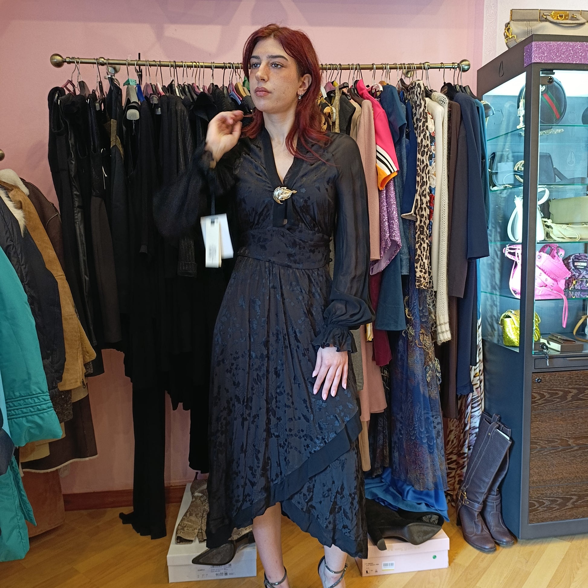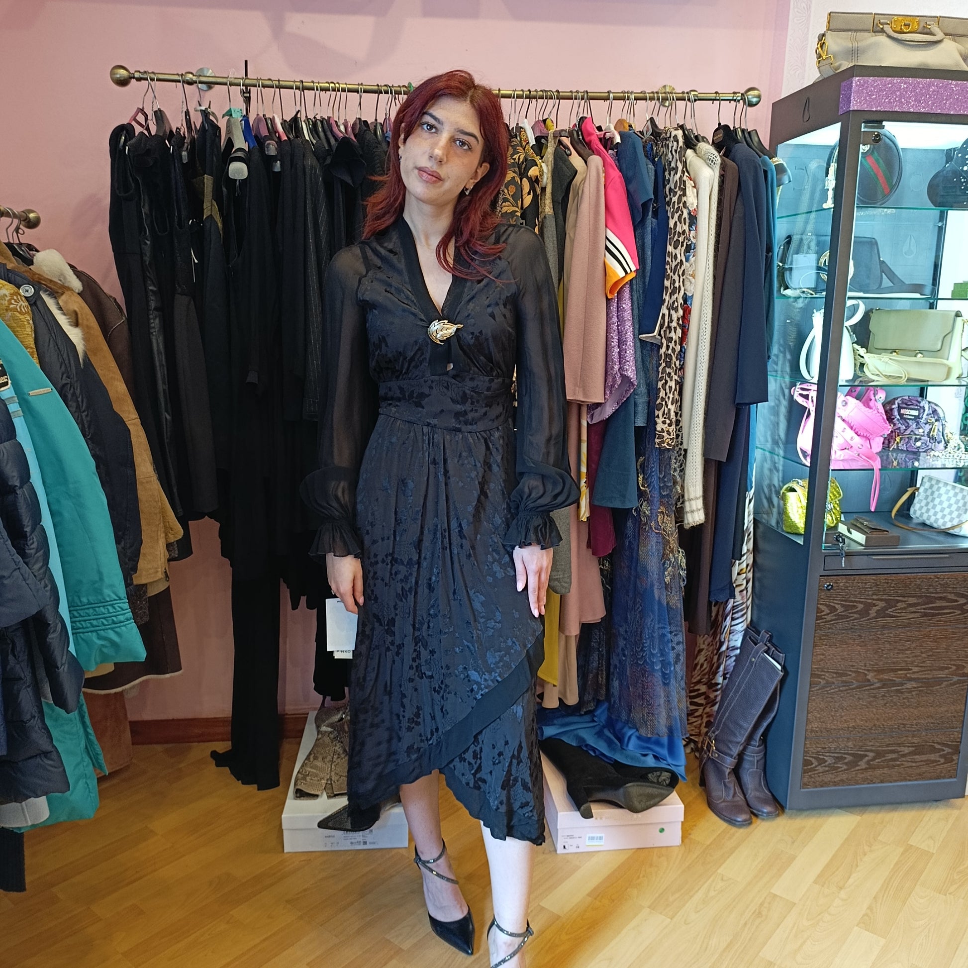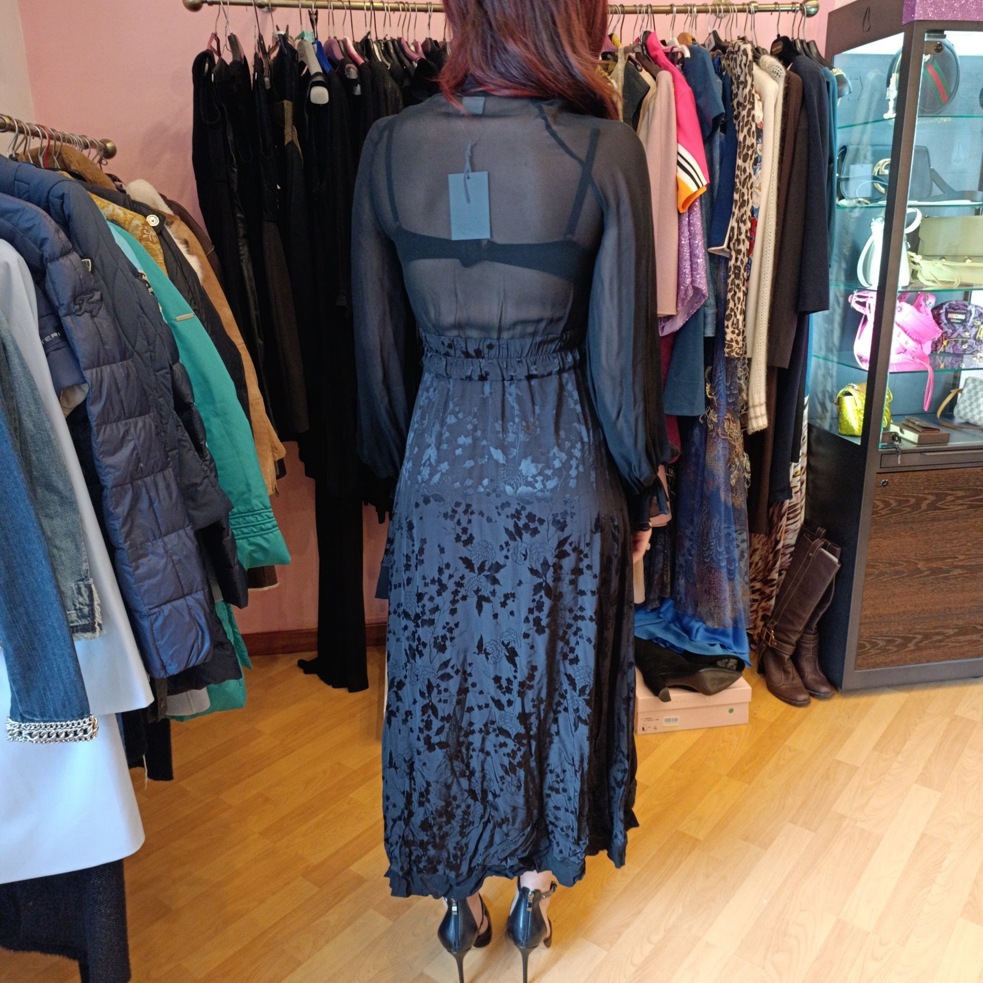 Abito Pinko nero con trama lucida fiorata tg 40, chiusura a portafoglio, manica lunga con trasparenze nuovo con cartellino lunghezza midi