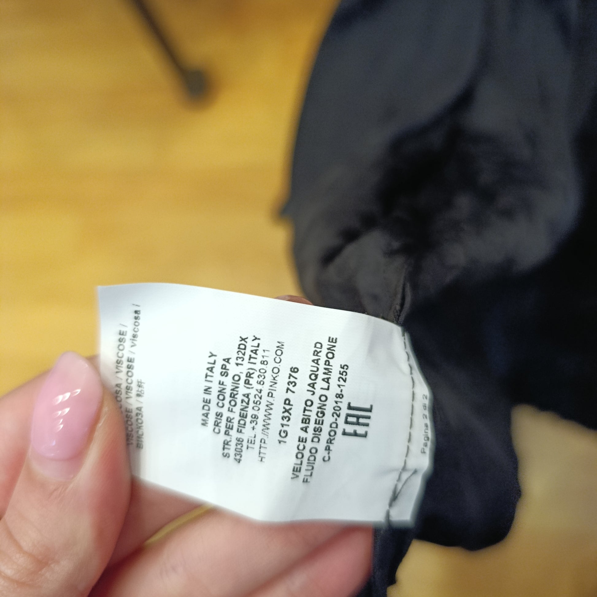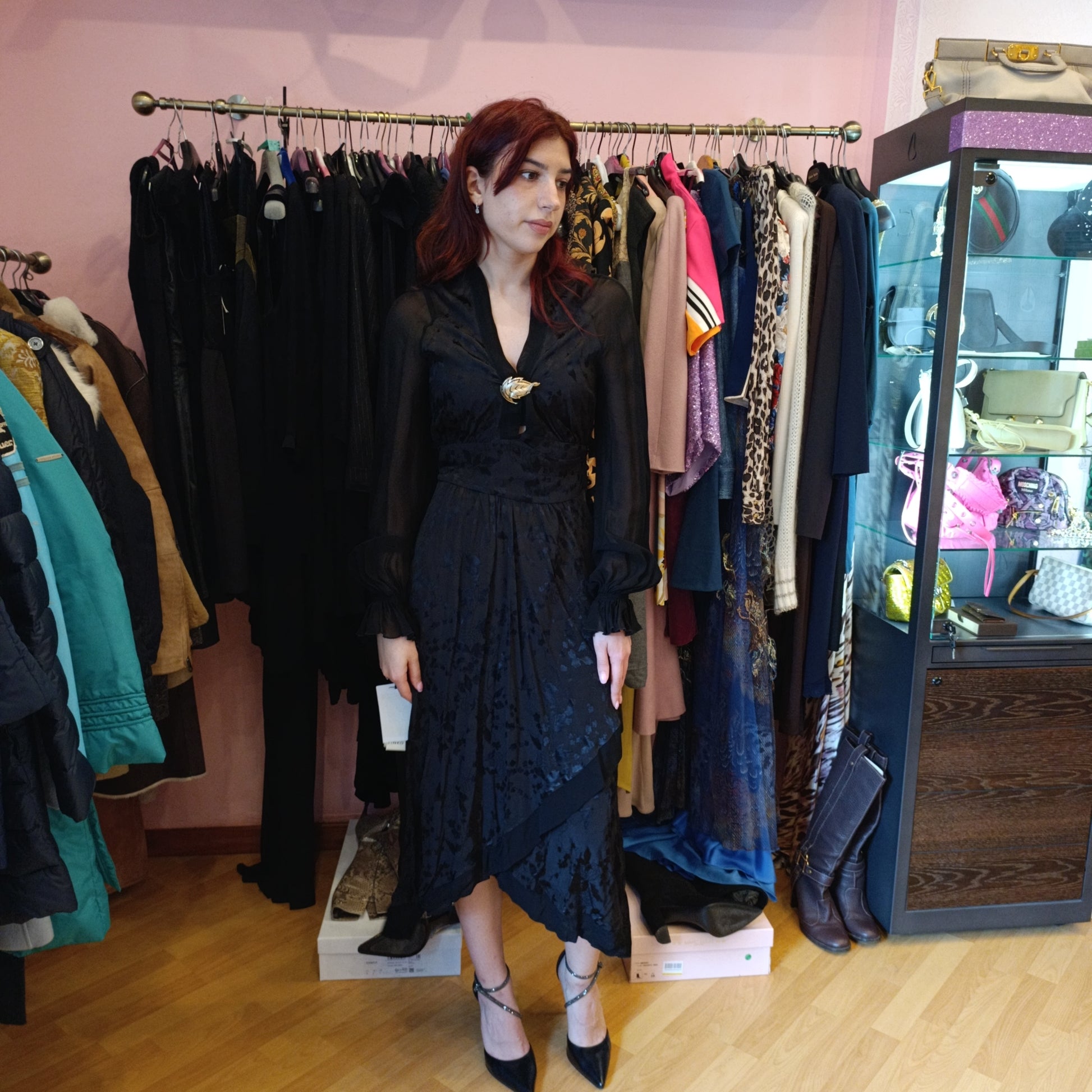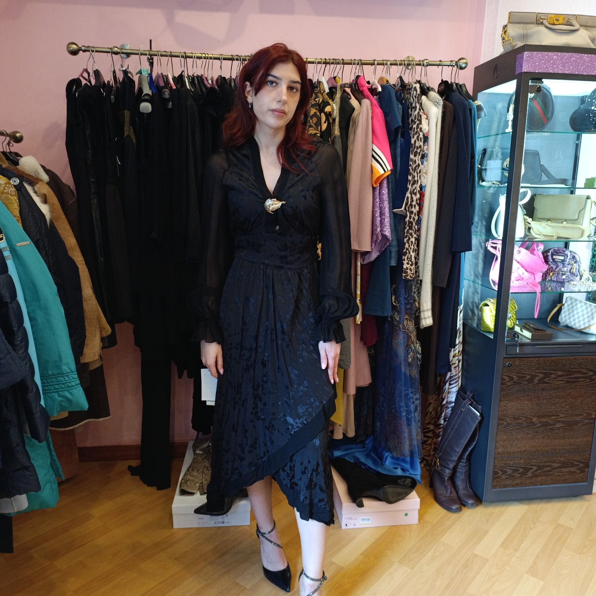 Abito Pinko nero con trama lucida fiorata tg 40, chiusura a portafoglio, manica lunga con trasparenze nuovo con cartellino lunghezza midi