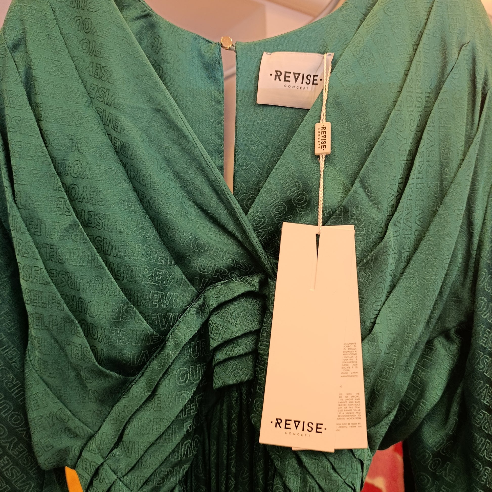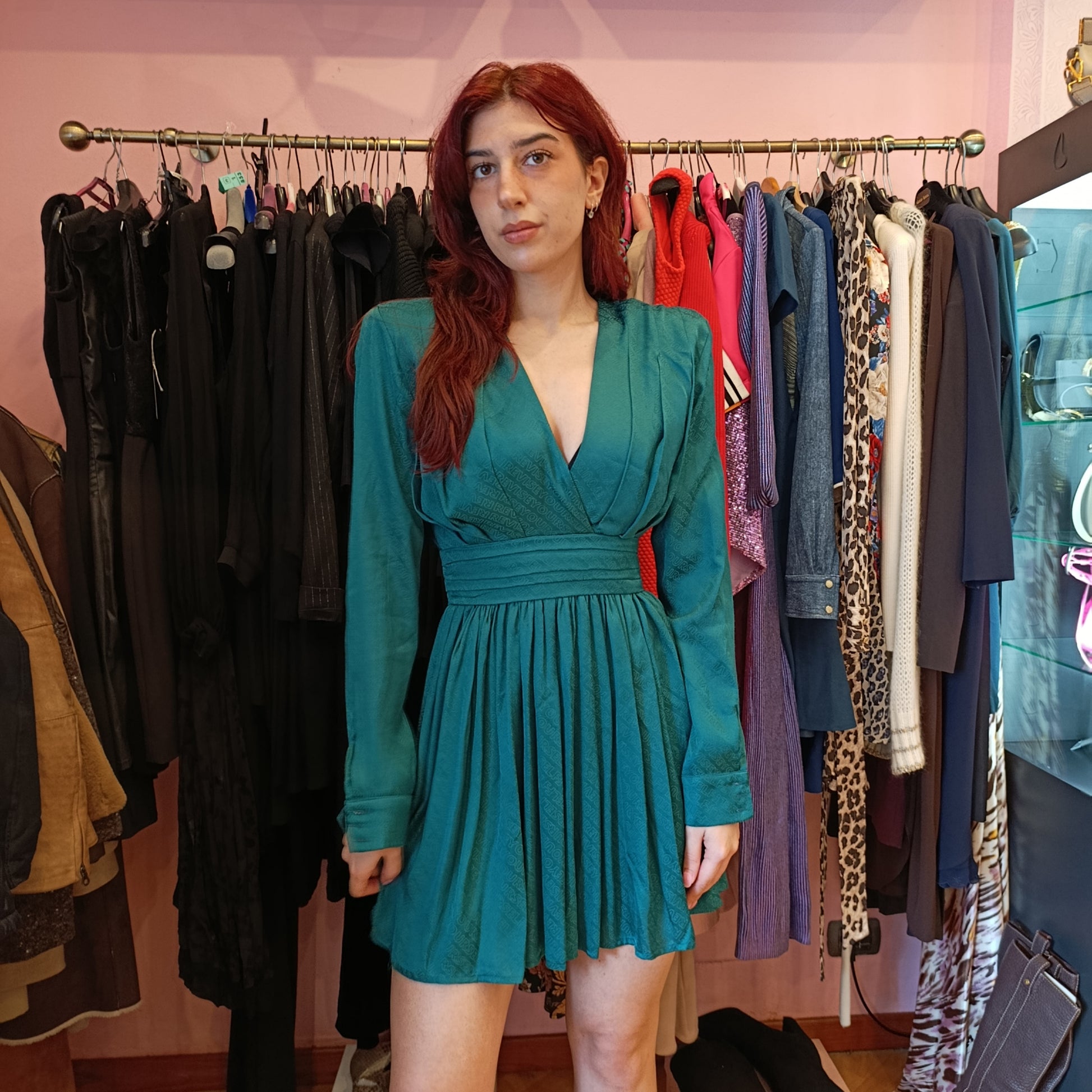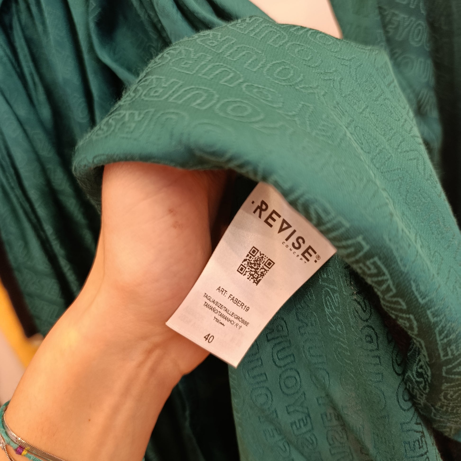 Abito revise nuovo con cartellino tg 40 in colorazione verde smeraldo a manica lunga, schiena scoperta, spalline imboitte e tessuto monogram del brand