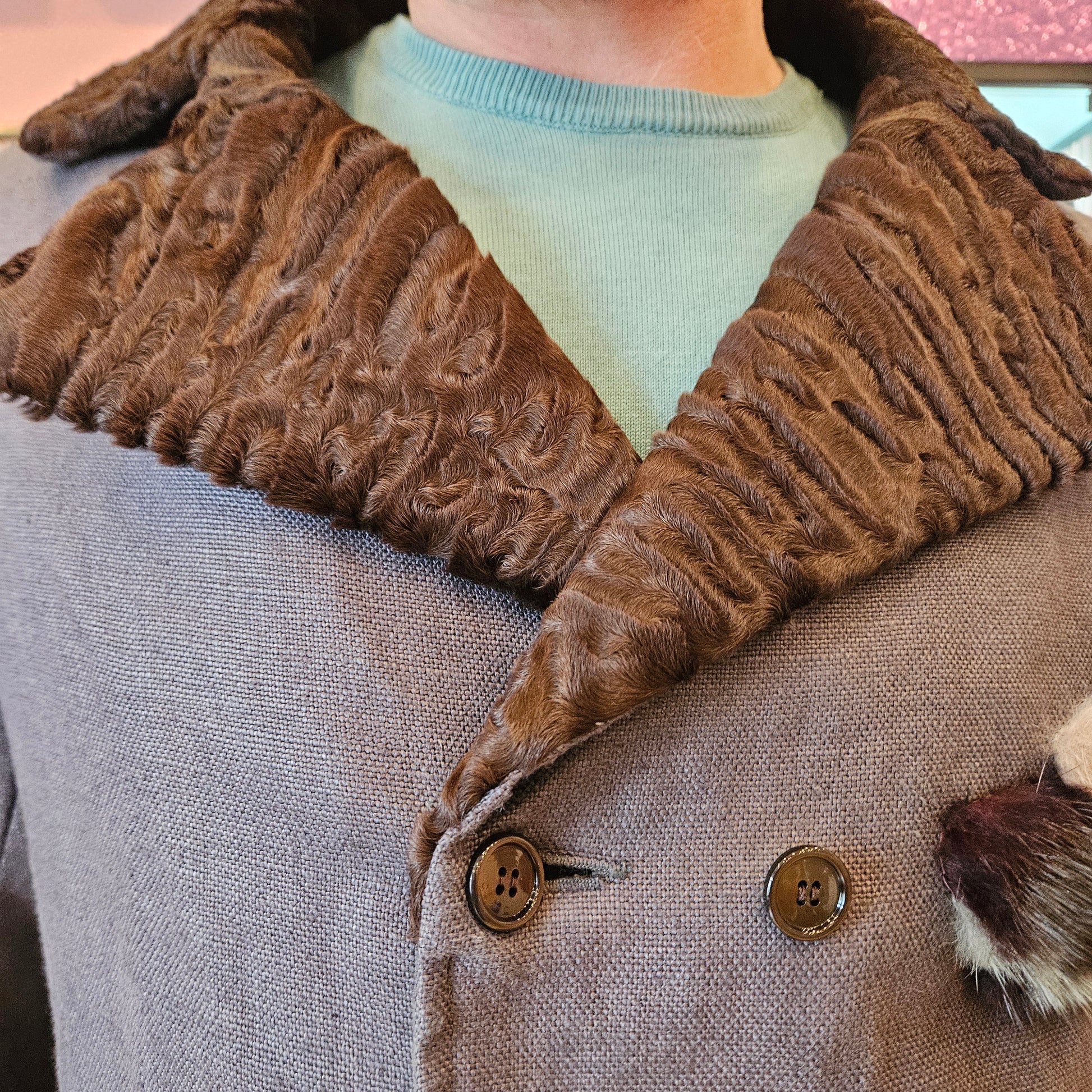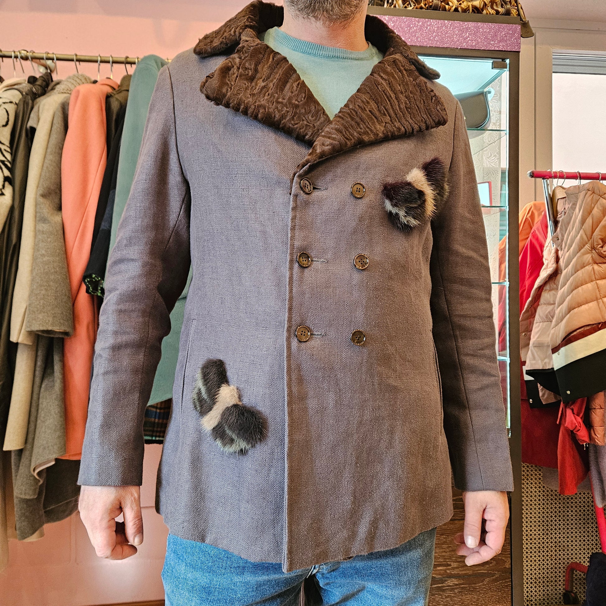 Blazer di sartoria milanese in lana con inserti in visone e agnello, doppio petto