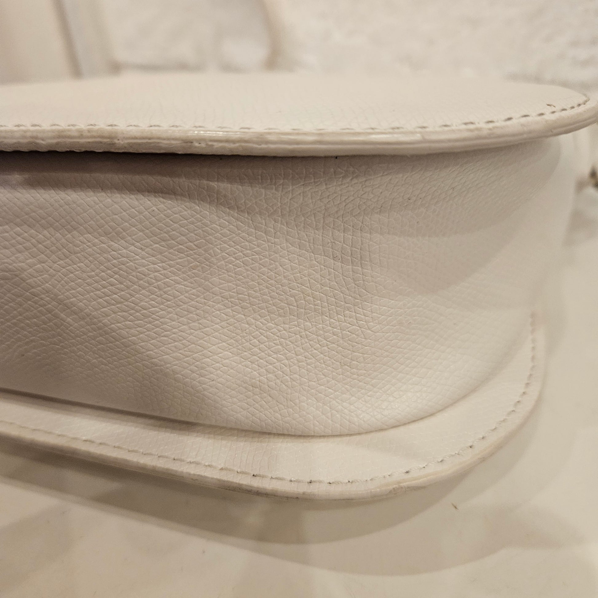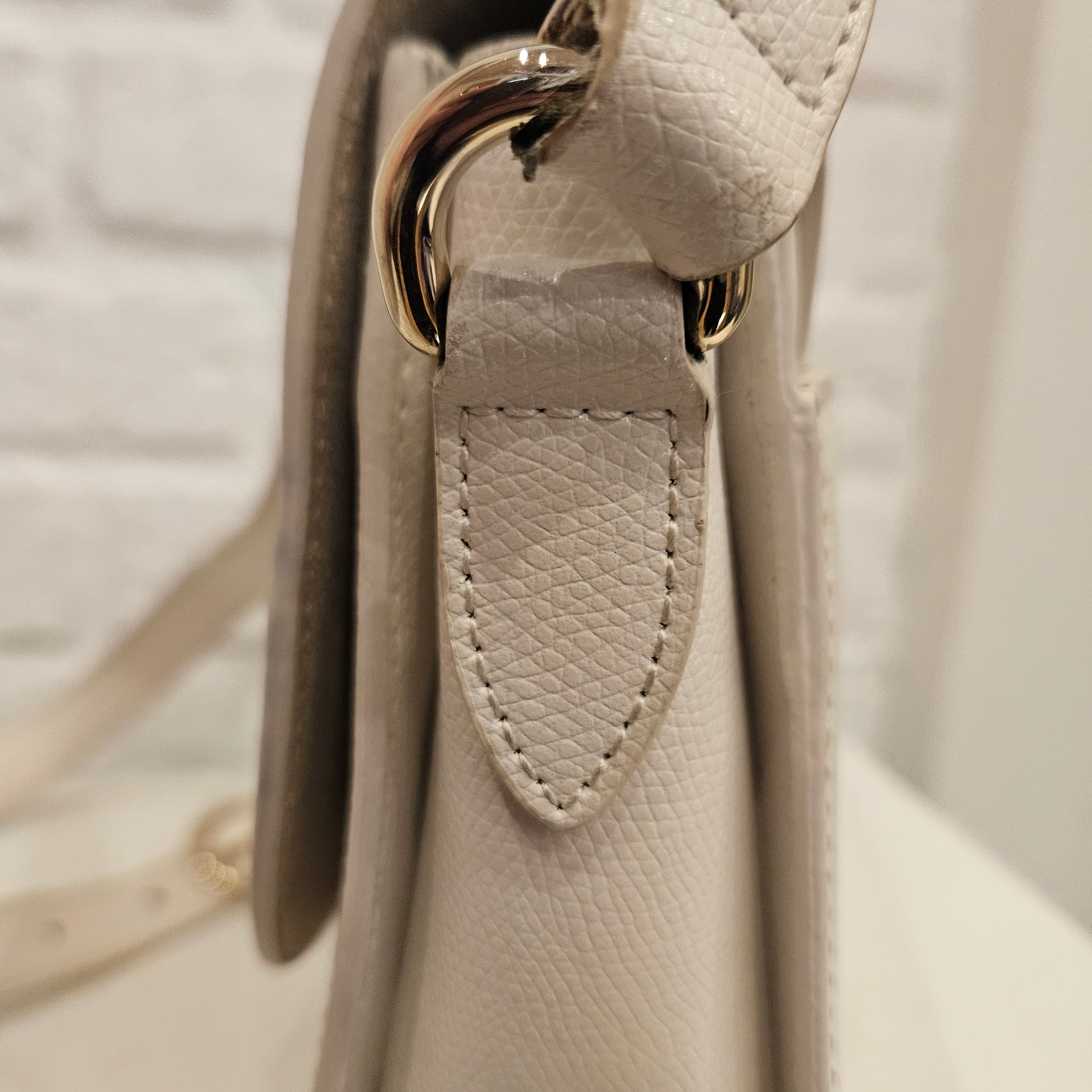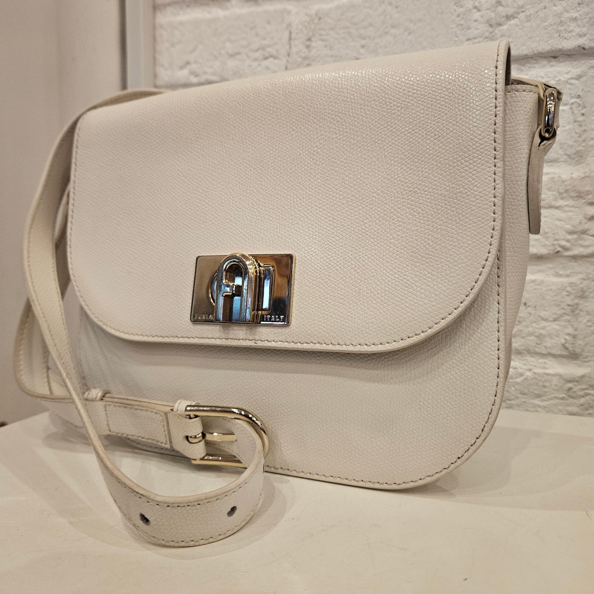 Borsa a tracolla Furla in pelle bianca con chiusura a patta e dettagli metallici dorati, borsa in buone condizioni segnialoamo segni dovuti all'uso all'interno della chiusura dove é presente una parte di oelle scamosciata, e segni sulle fibbie di chiusura