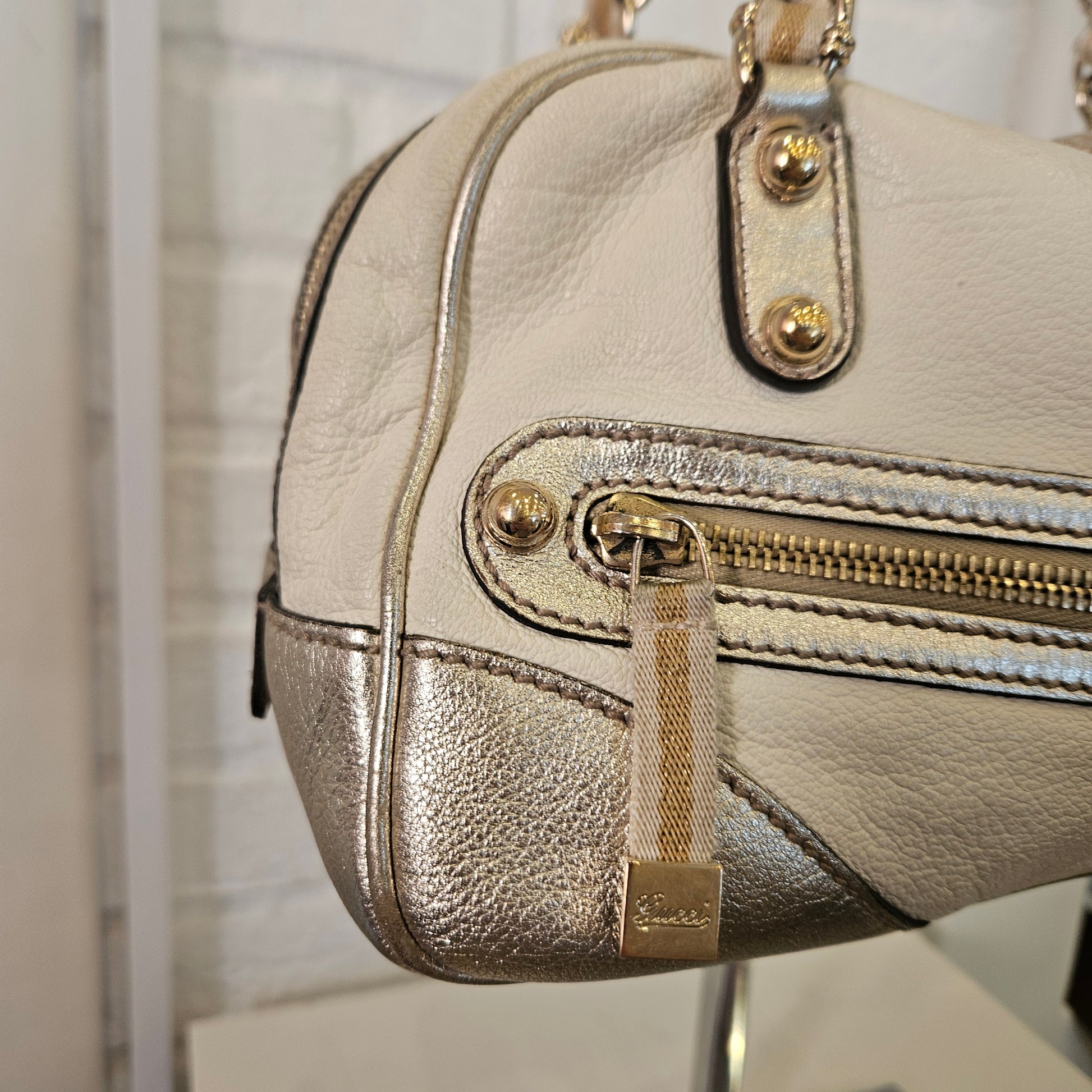 Borsa Bauletto Gucci vintage in buone condizioni, in pelle colorazione beige e dorata , articolo in buone condizioni presenta qualche segno dovuto all'utilizzo come segni sui bordi e alla base.