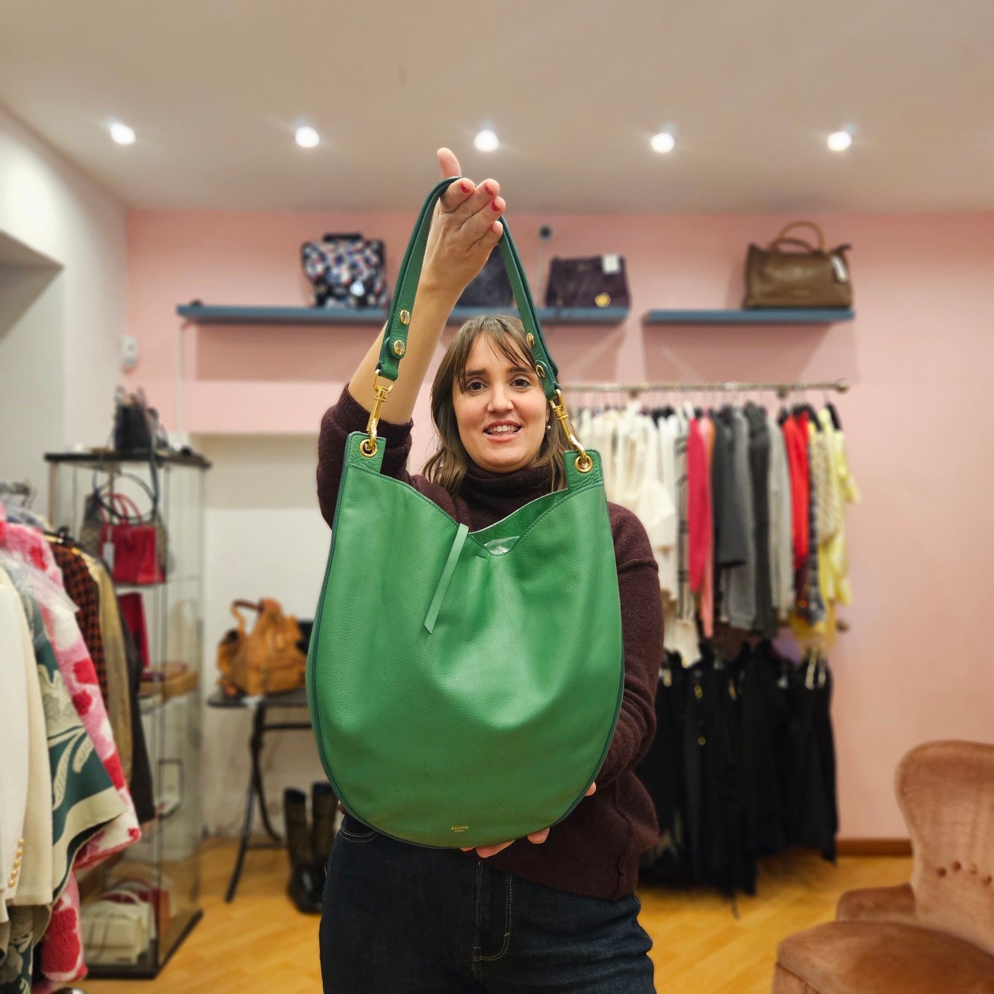 Con manico da portare a spalla o a tracolla regolabile con bottoni a clip dorati che la rendono pratica e comoda