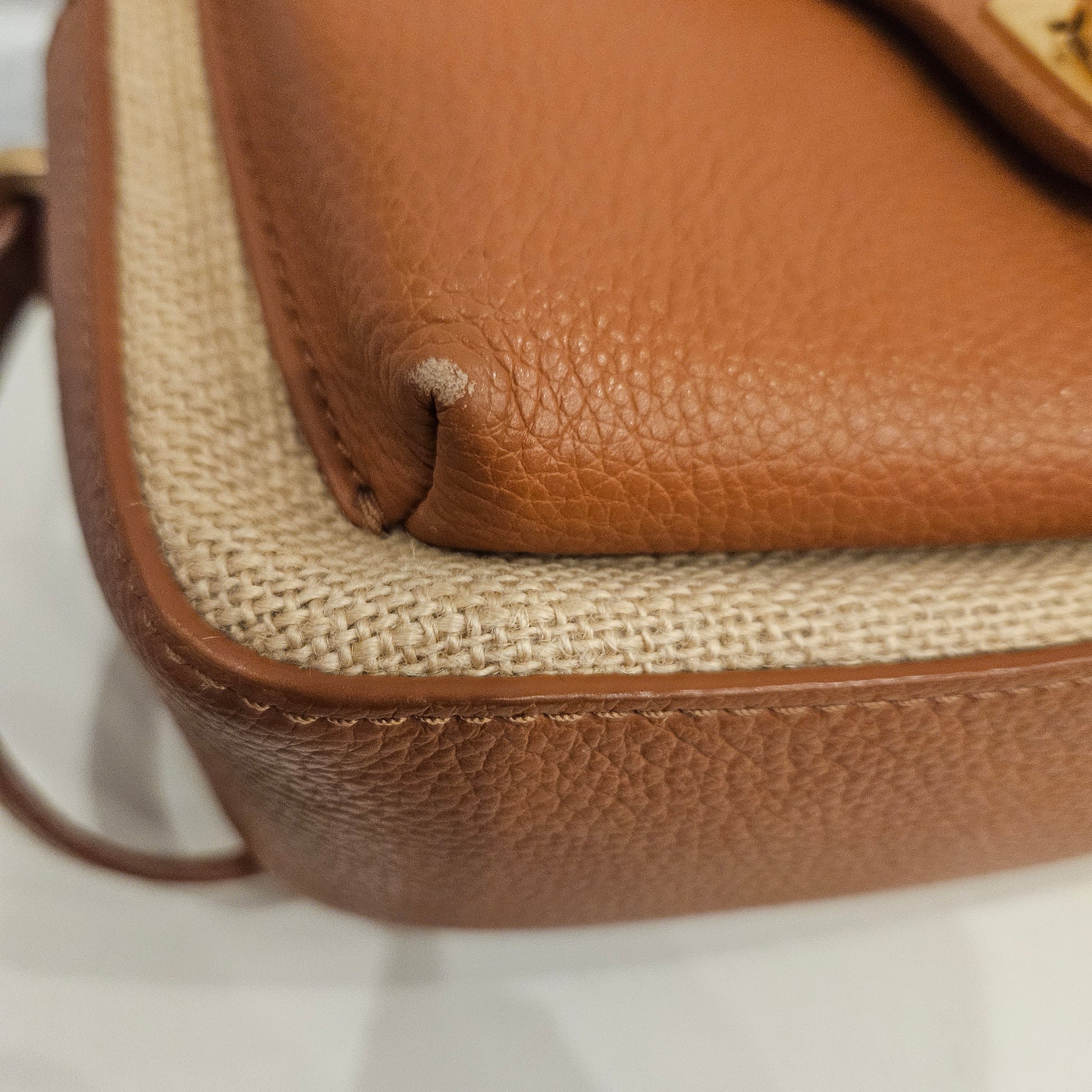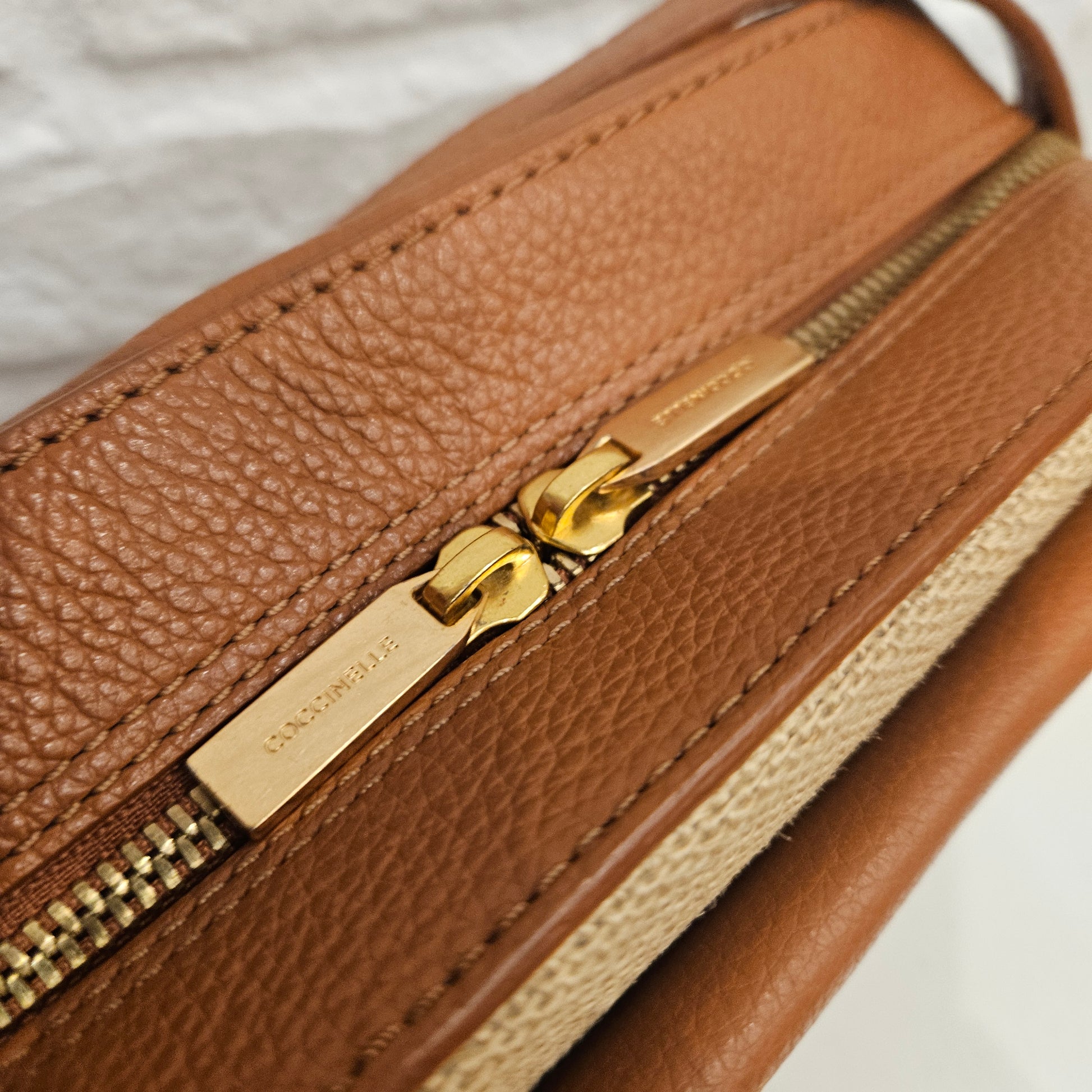 Borsa Coccinelle in pelle marrone e tela con tracolla, chiusura a zip centrale e tasca con chiusura metallica dorata.