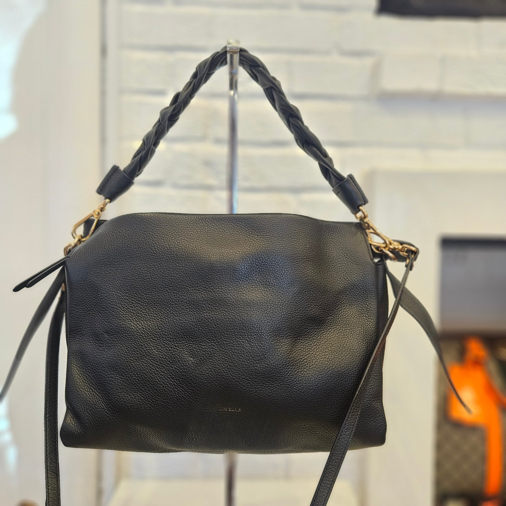 Borsa Coccinelle in morbida pelle nera e dettagli metallici dorati, interno suddiviso in tre scomparti di cui quello centrale con chiusura a zip e gli altri due con chiusura magnetica, dotata di manico intrecciato removibile e tracolla anch'esso removibile.