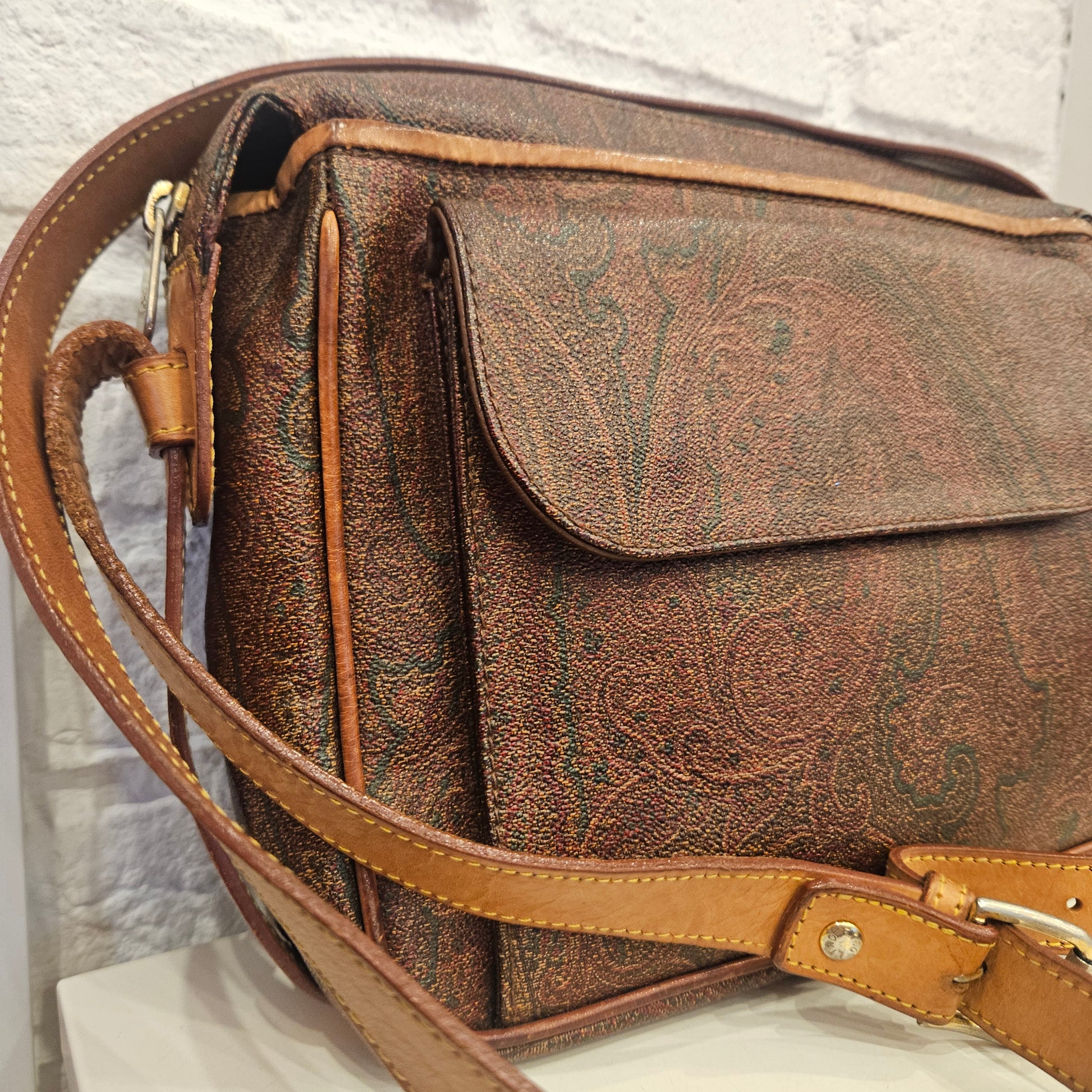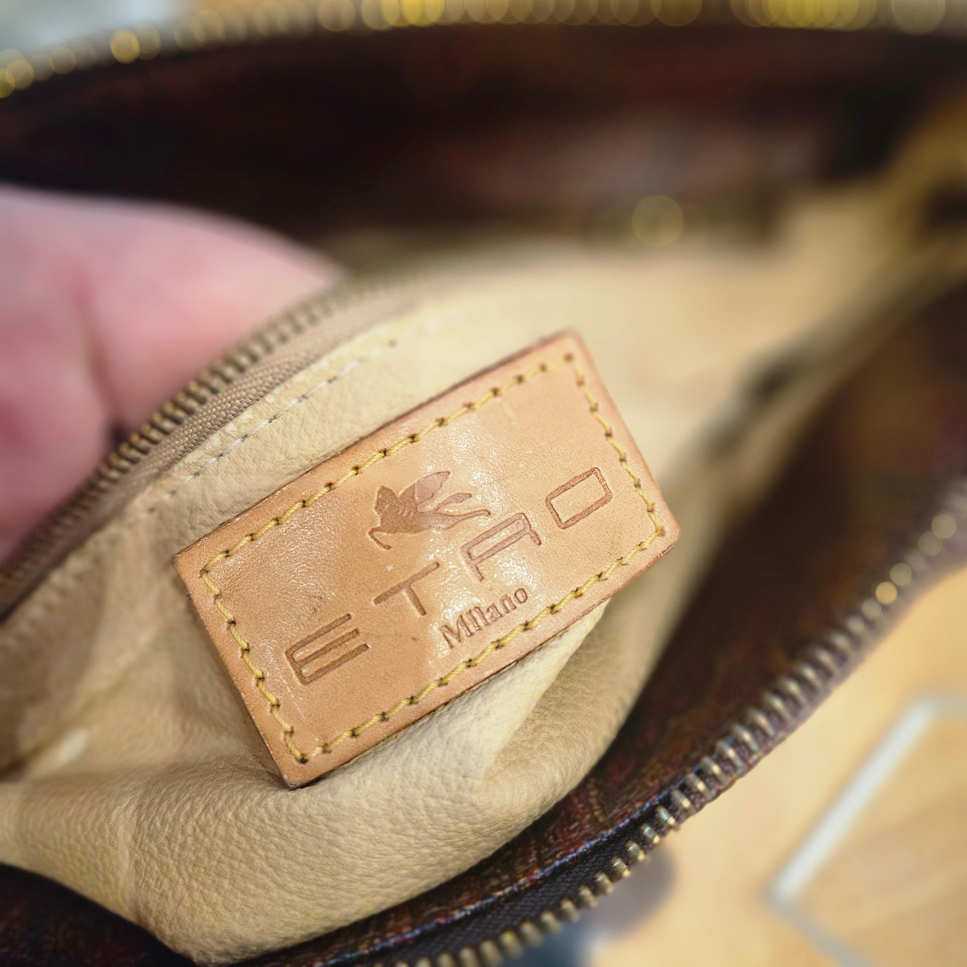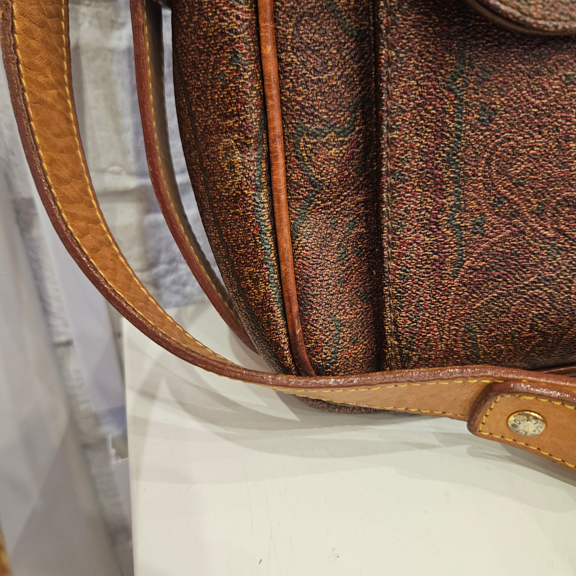Borsa a tracolla Etro nella classica colorazione del brand, inserti in pelle marrone e tasca frontale e una tasca interna. La borsa é in ottime condizioni non presenta particolari segni dovuti all'utilizzo, segnaliamo alcune macchie sugli inserti in pelle marrone alla base e sulla tracolla. Interno in ottime condizioni ma leggermente appiccicoso