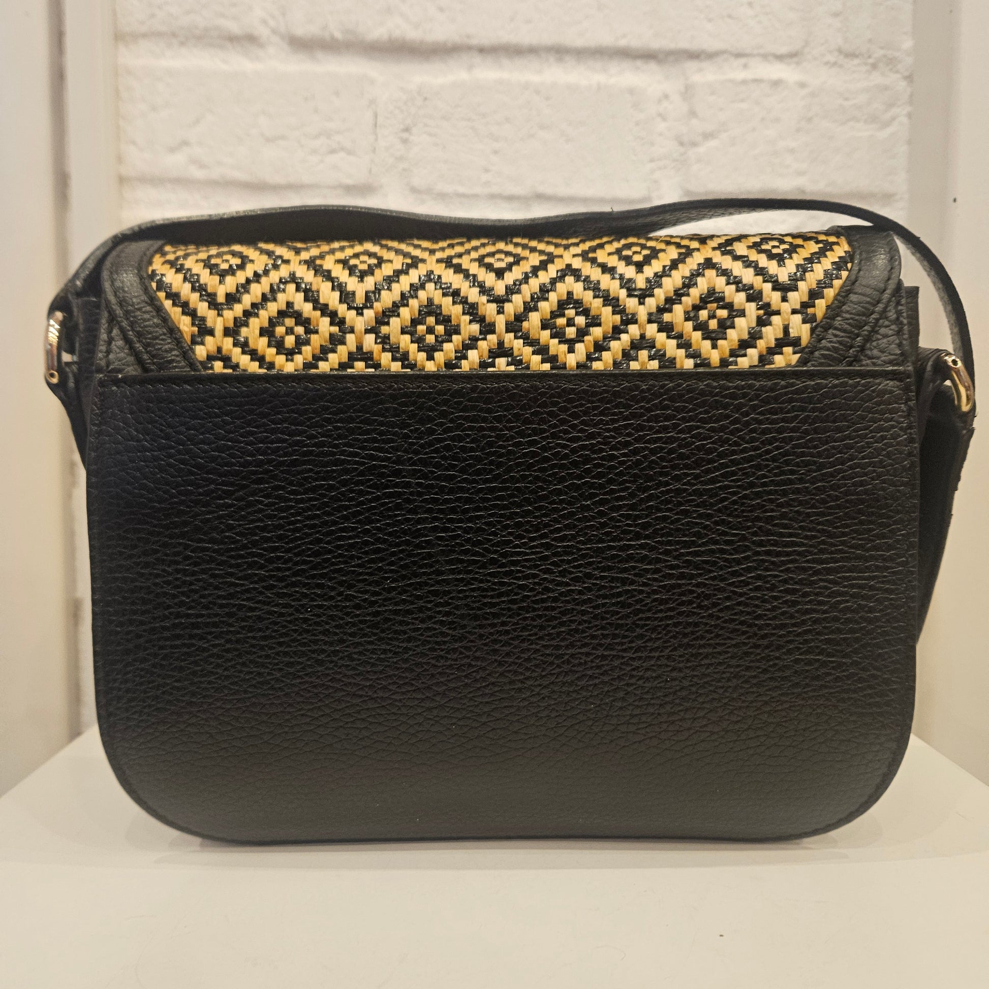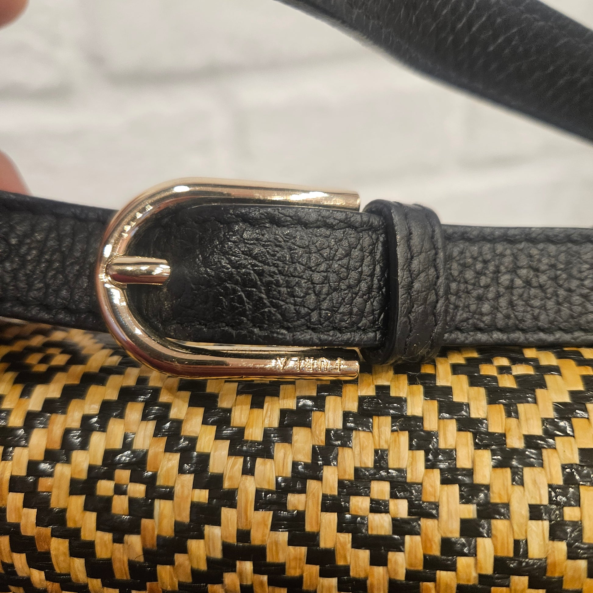 Borsa a tracolla Furla in pelle nera e rivestimento in midollino, borsa con chiusura a patta e logo dorato frontale e tasca posteriore, interno in tessuto con due tasche interne.