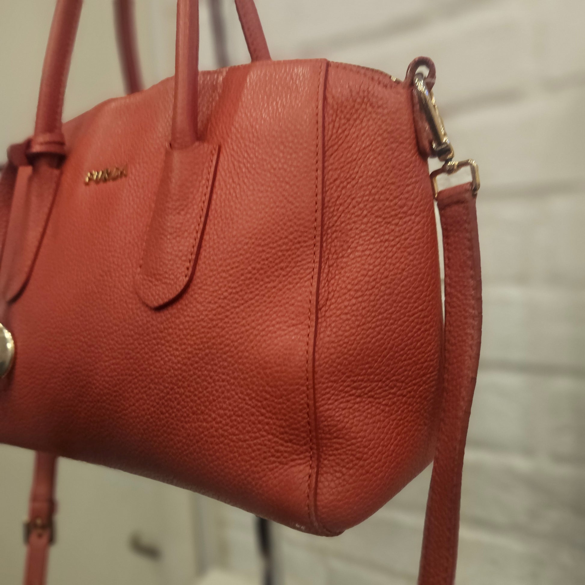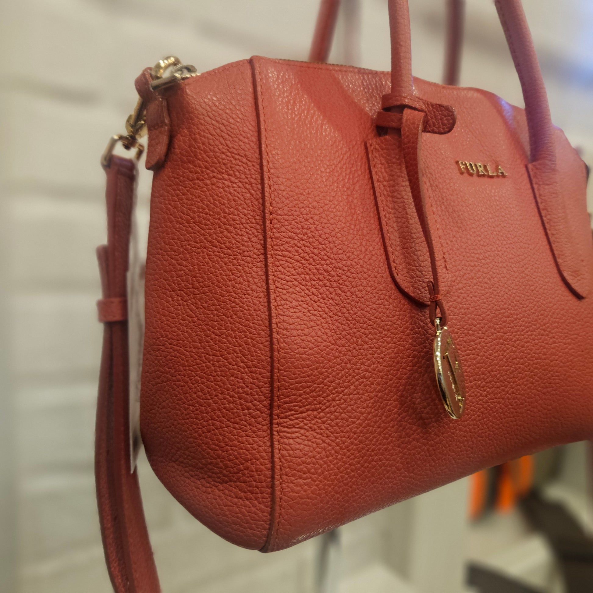 Borsa Furla in oelle colorazione salmone, dotata di manici tracolla (removibile) e dustbag, la borsa é in ottime condizioni non presenta particolari segni dovuti all'uso e al tempo. Leggerissima sbucciatura su un angolo alla base (visibile in foto)