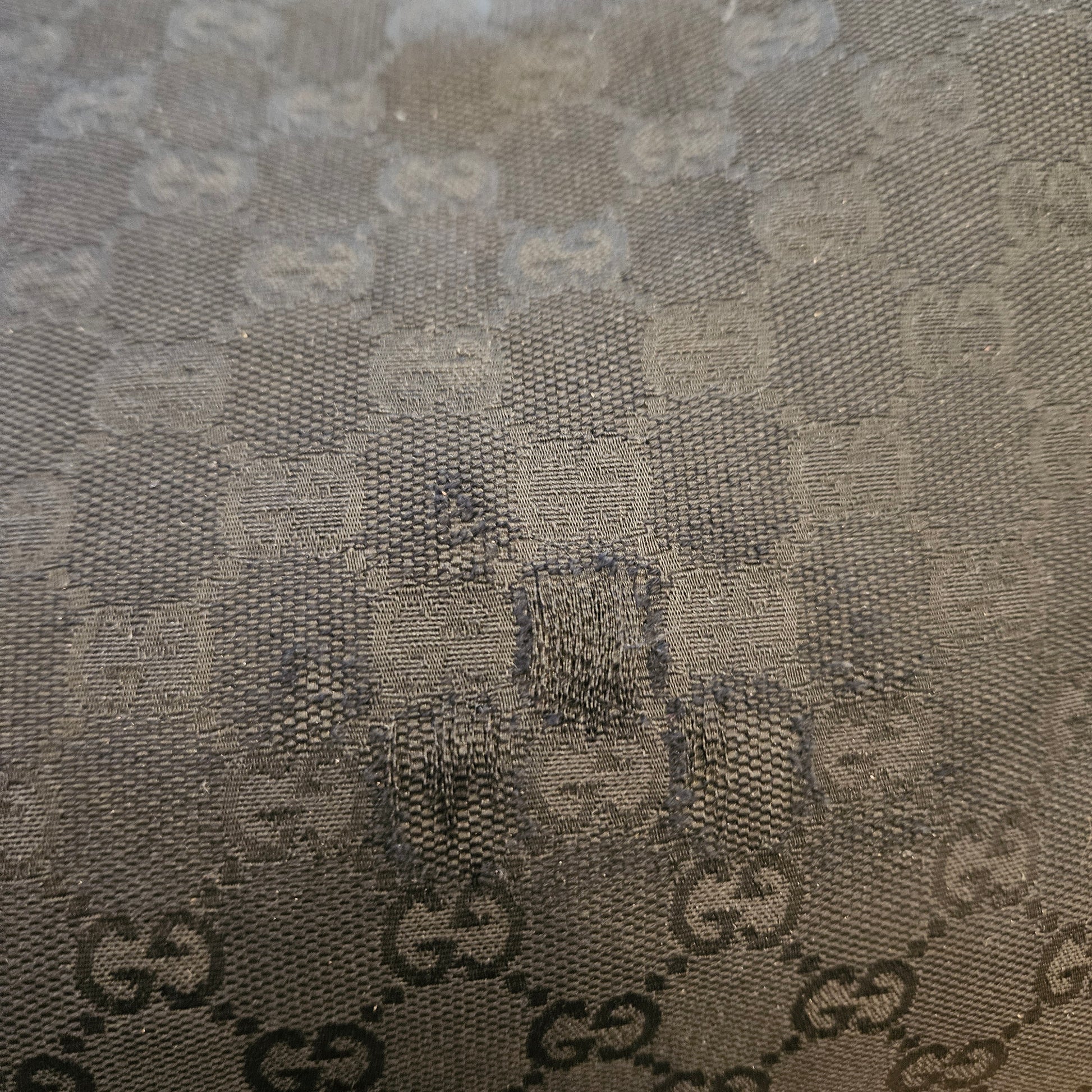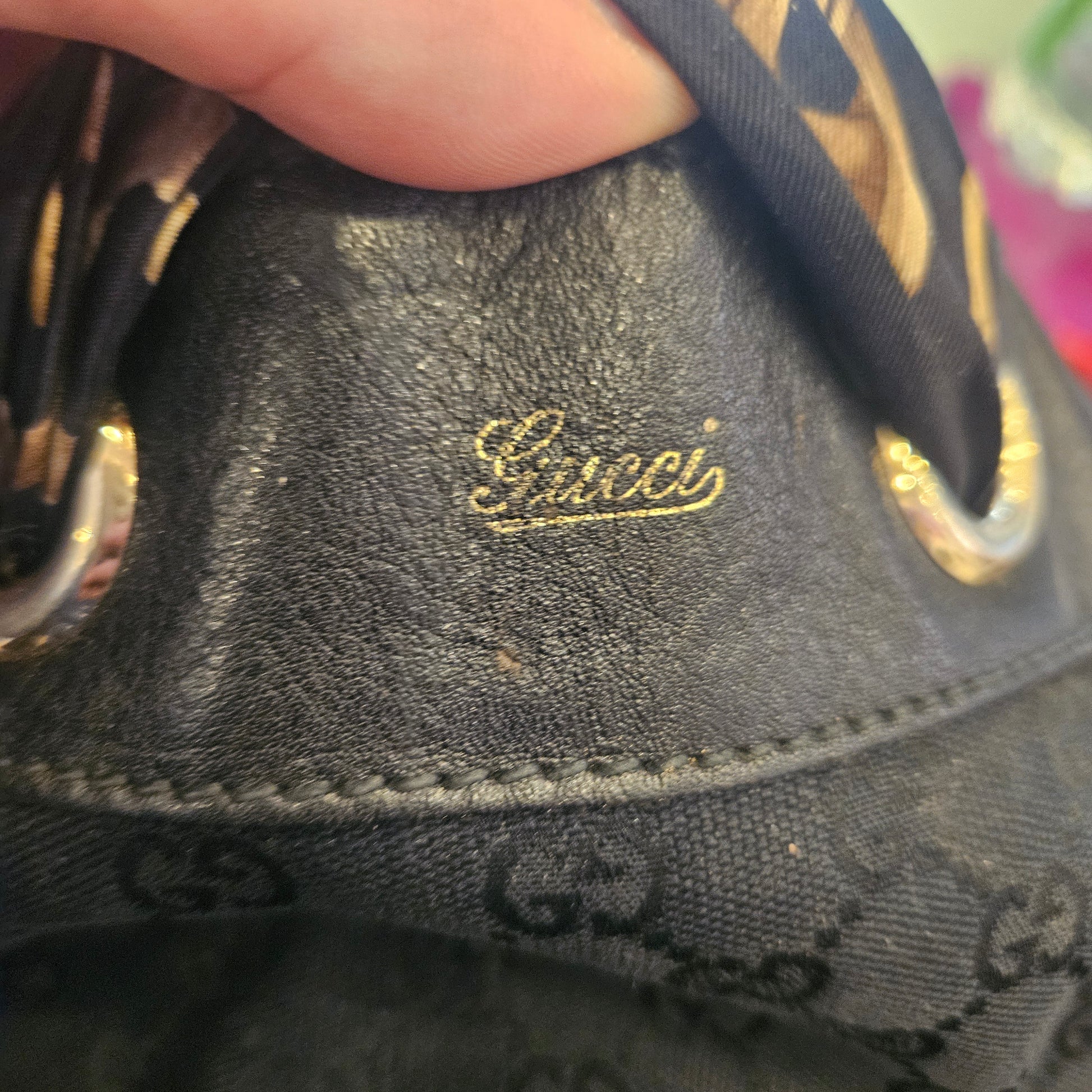 Borsa Gucci a secchiello in tela nera e inserti in pelle, la borsa presenta diversi segni dovuti all'uso e al tempo, come bordi sbucciati e alcuni punti della tela consumata. La borsa é corredata di un foulard Gucci.
