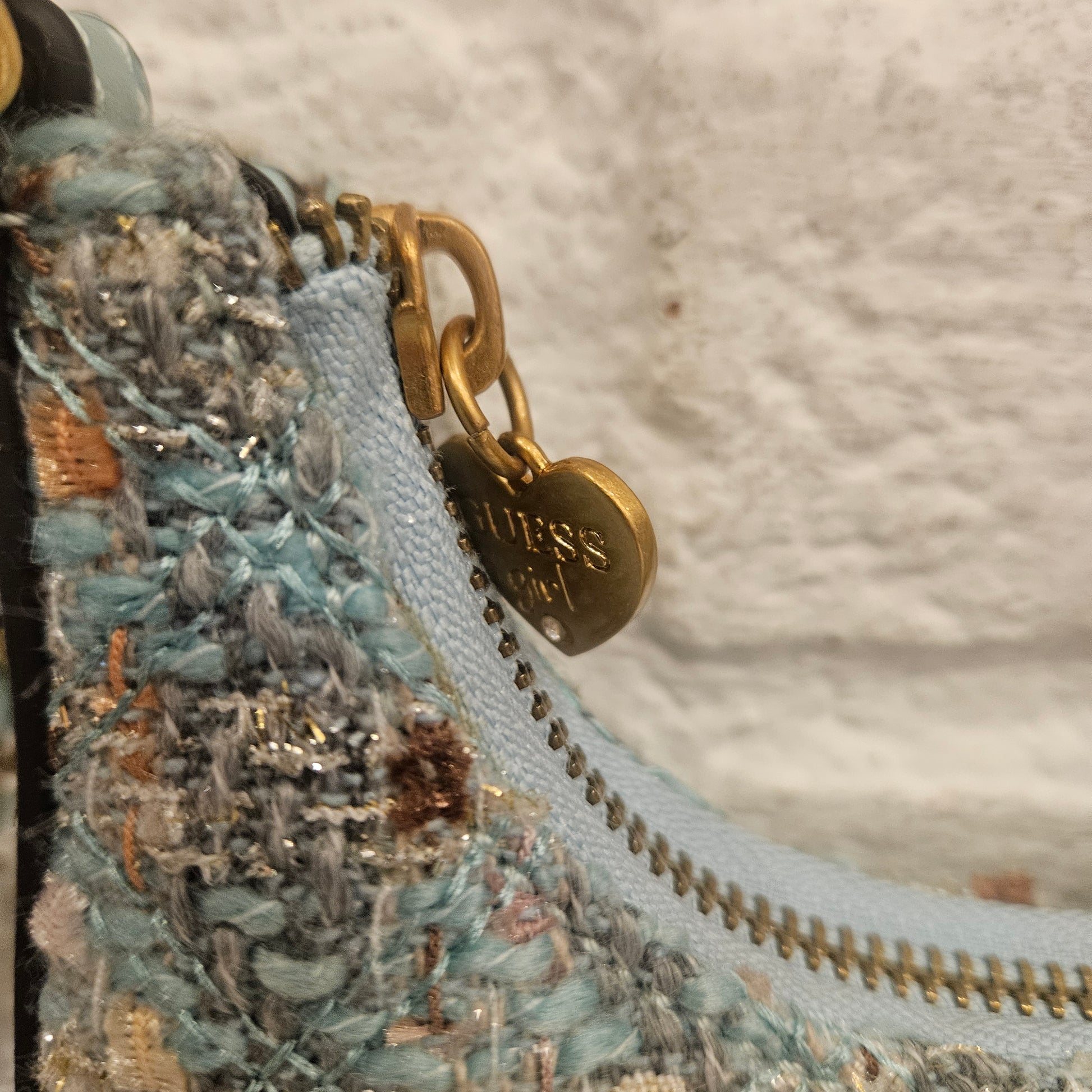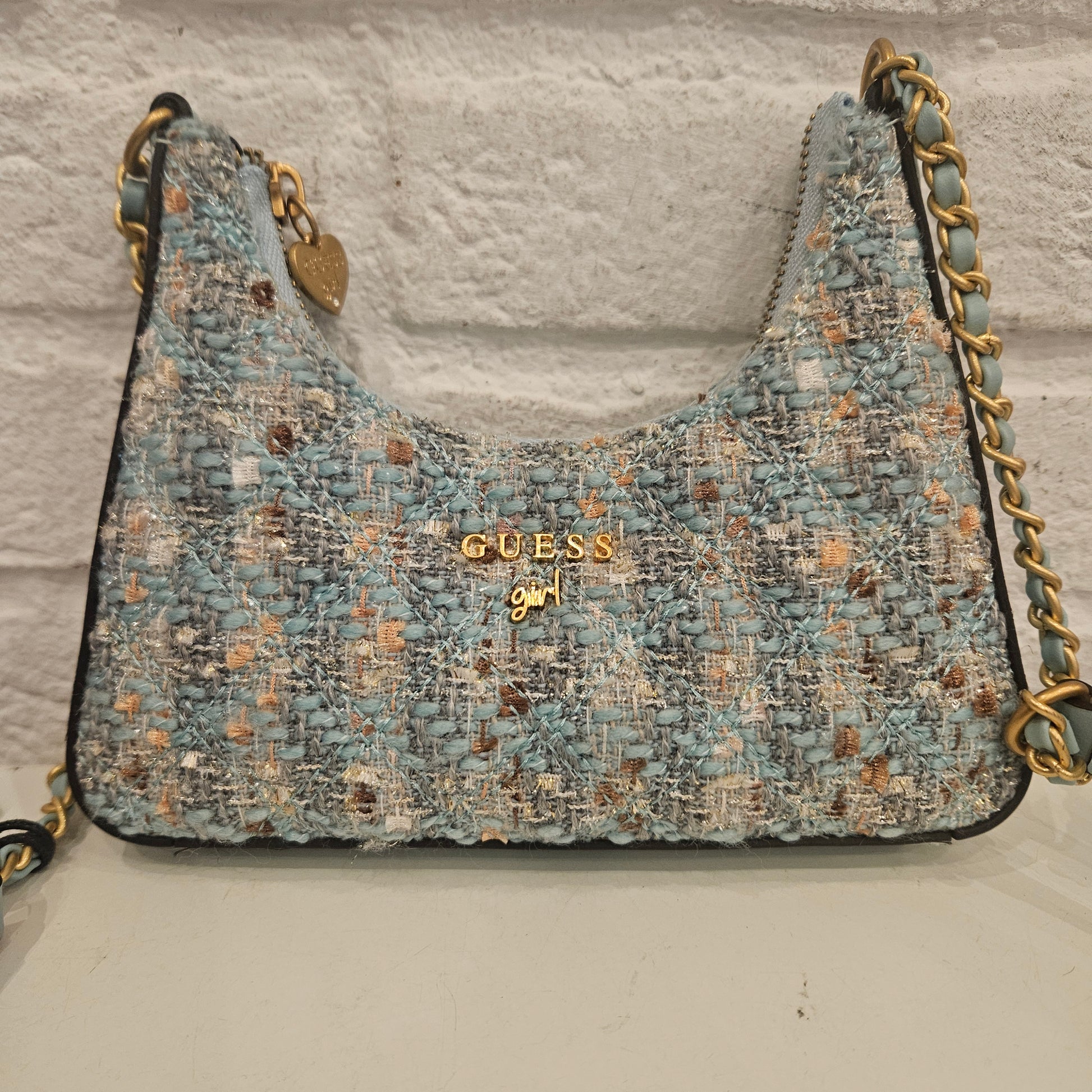 Borsa Guess Girl in tweed in colorazione turchese, borsetta a tracolla in condizioni pari al nuovo. Ottima per occasioni speciali