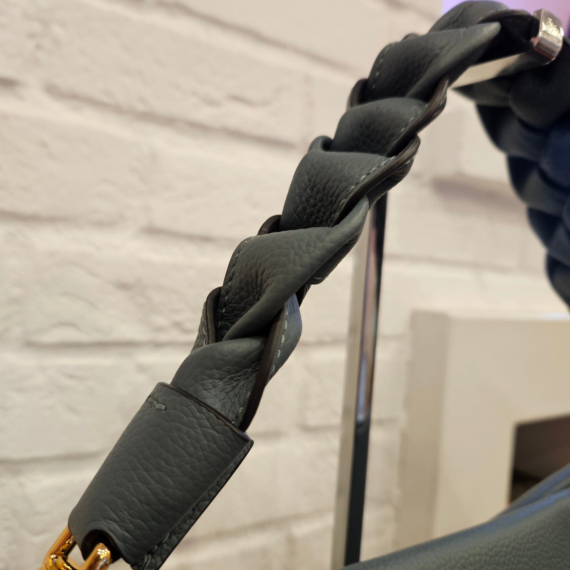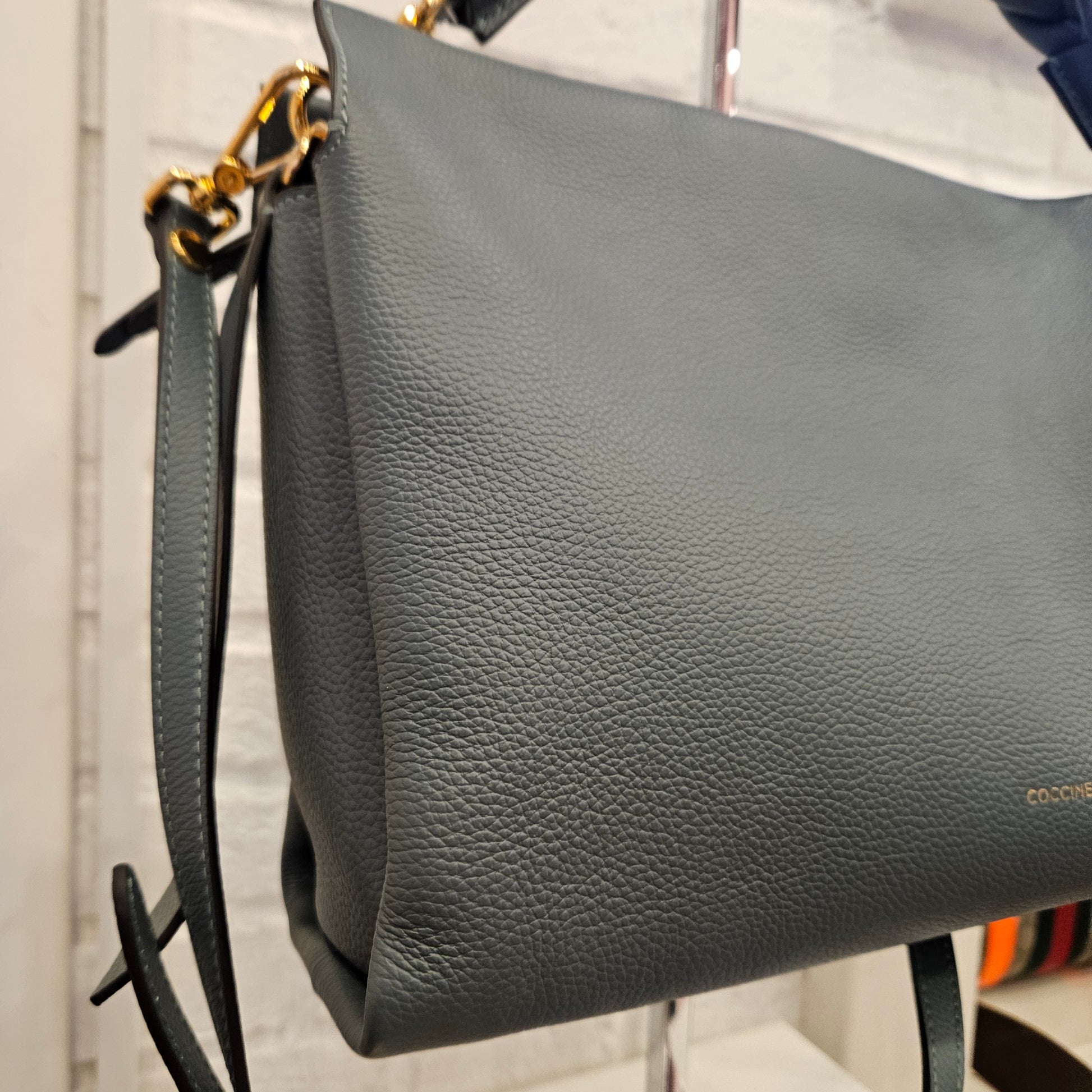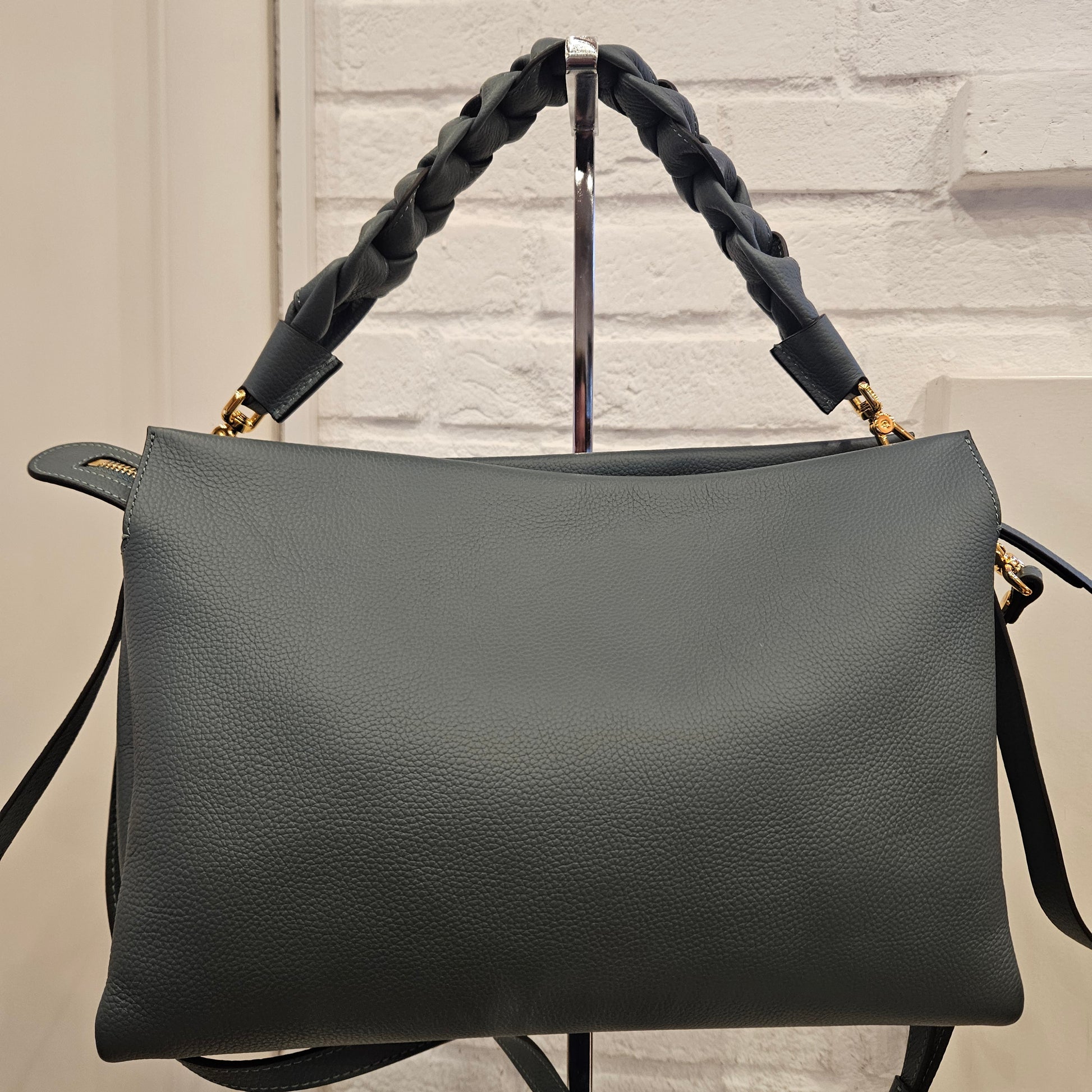 Borsa in pelle Coccinelle in colorazione ottanio e dettagli metallici dorati, la borsa e composta da tre comparti di quello centrale é dotato da chiusura a zip, manico in pelle intrecciata e tracolla regolabile removibile. Condizioni pari al nuovo