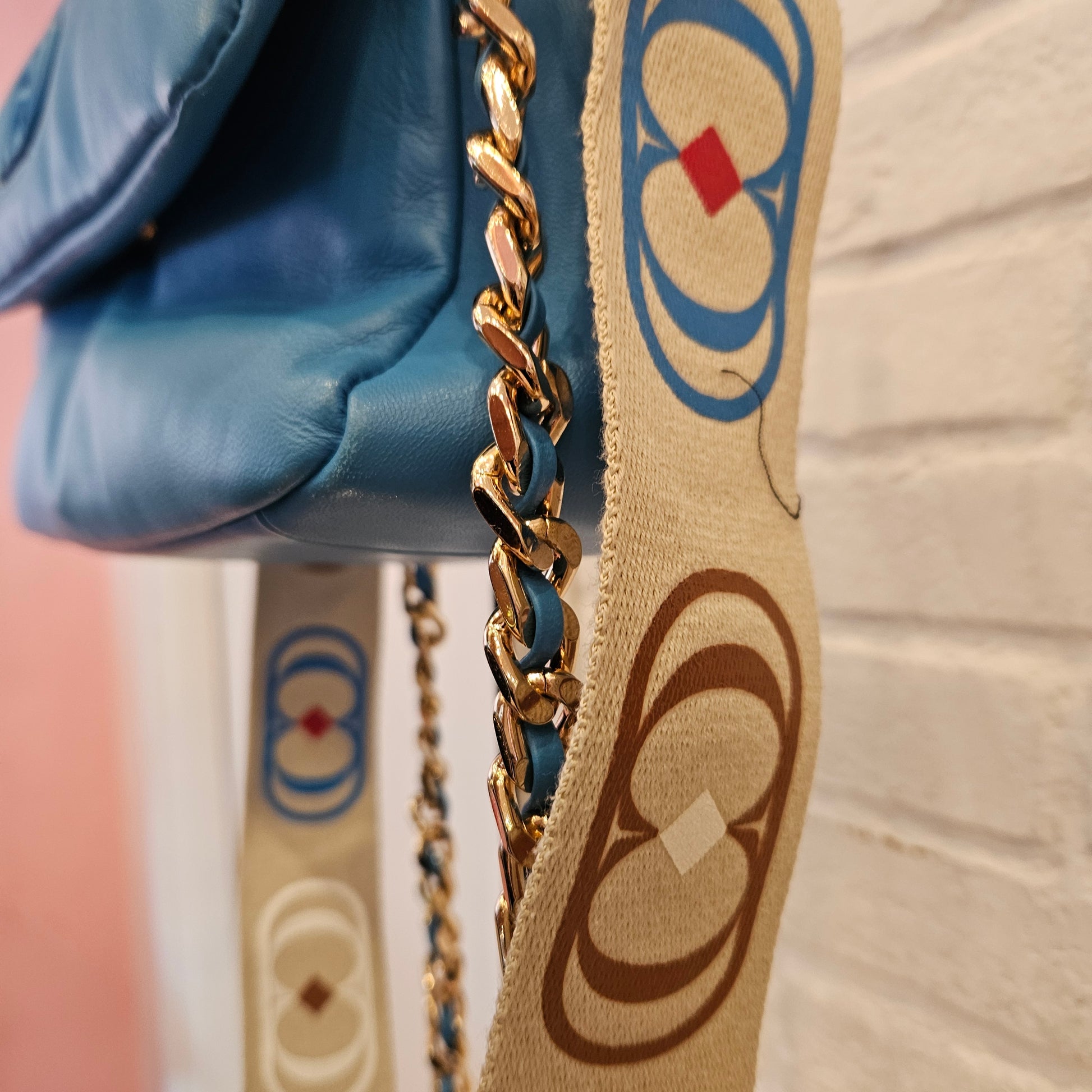 Borsa La Carrie puffer in colorazione azzurra e hardware dorato, dotata di 2 tracolle una in catena e pelle e l'altra il tela