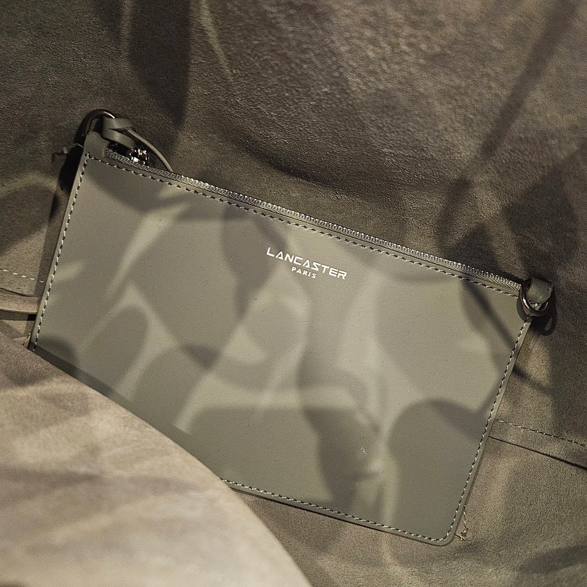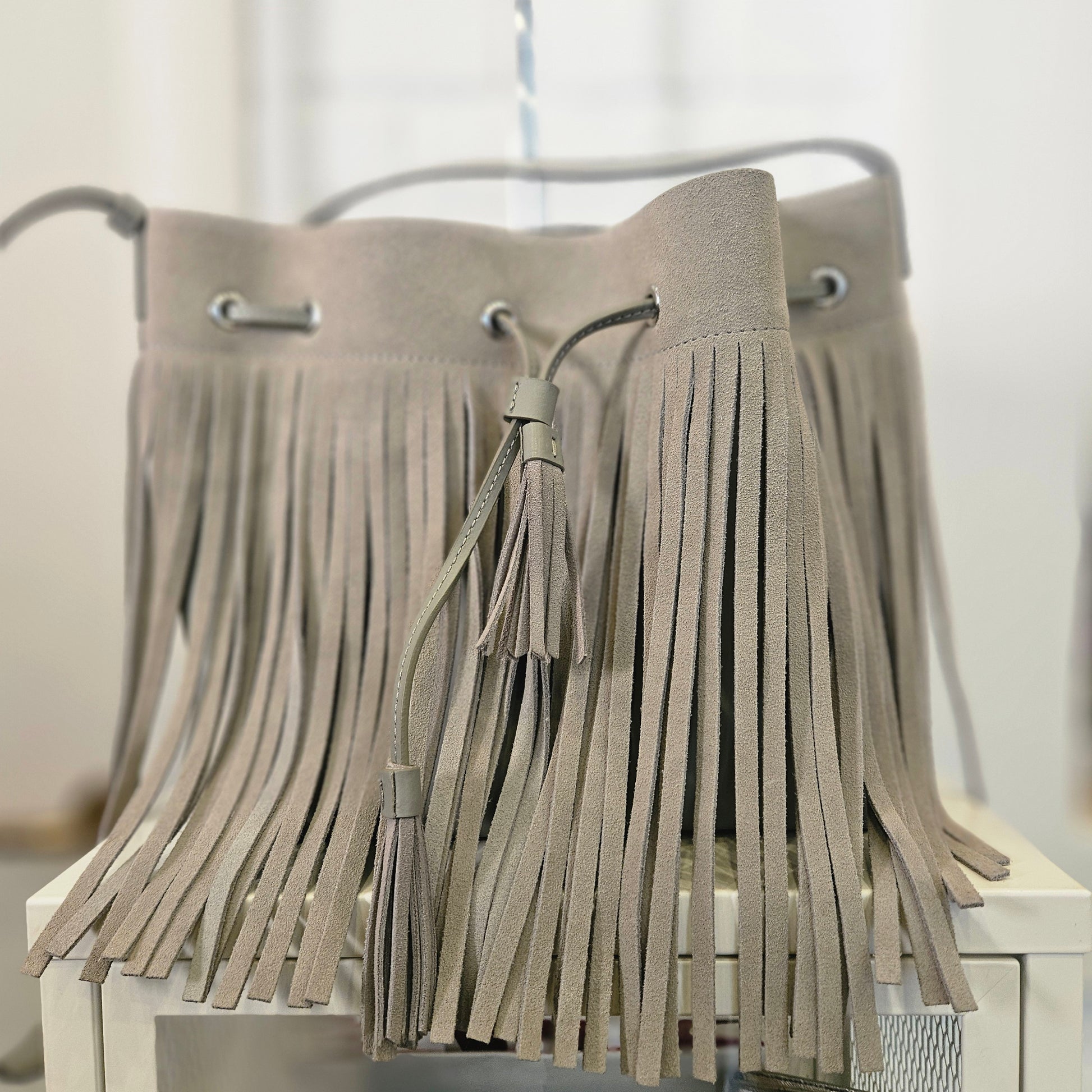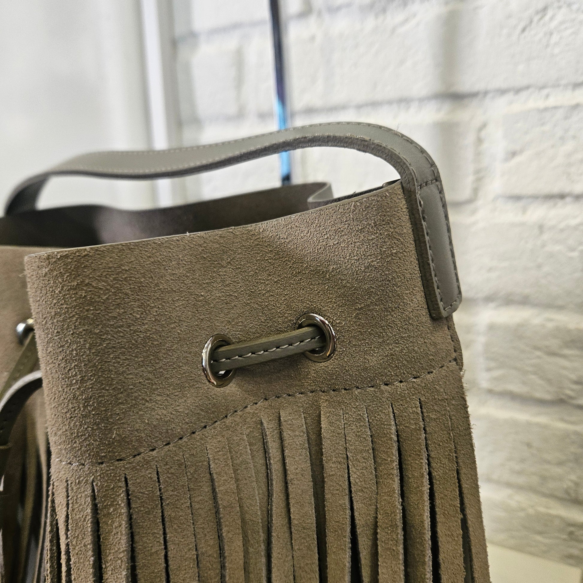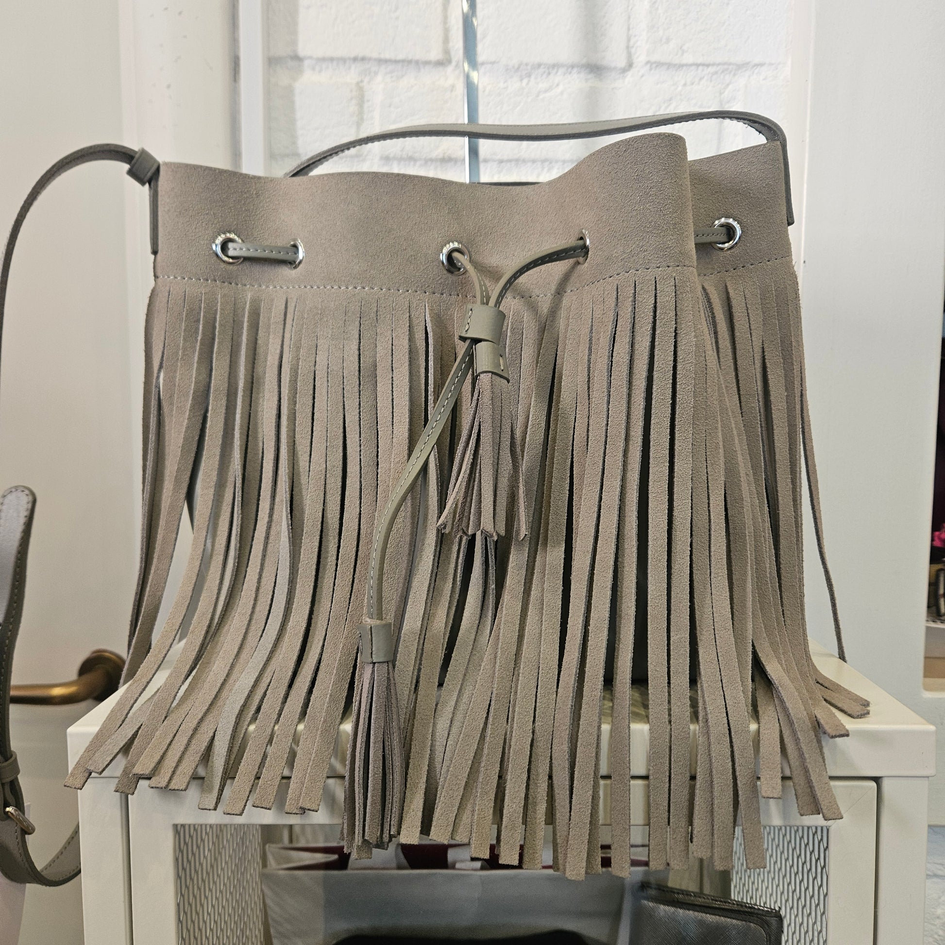 Secchiello Lancaster in pelle di vacchetta , con tracolla regolabile e frange, colorazione grigio fumo, articolo in ottime condizioni privo di segni dovuti all'utilizzo. Borsa dall'aspetto country!