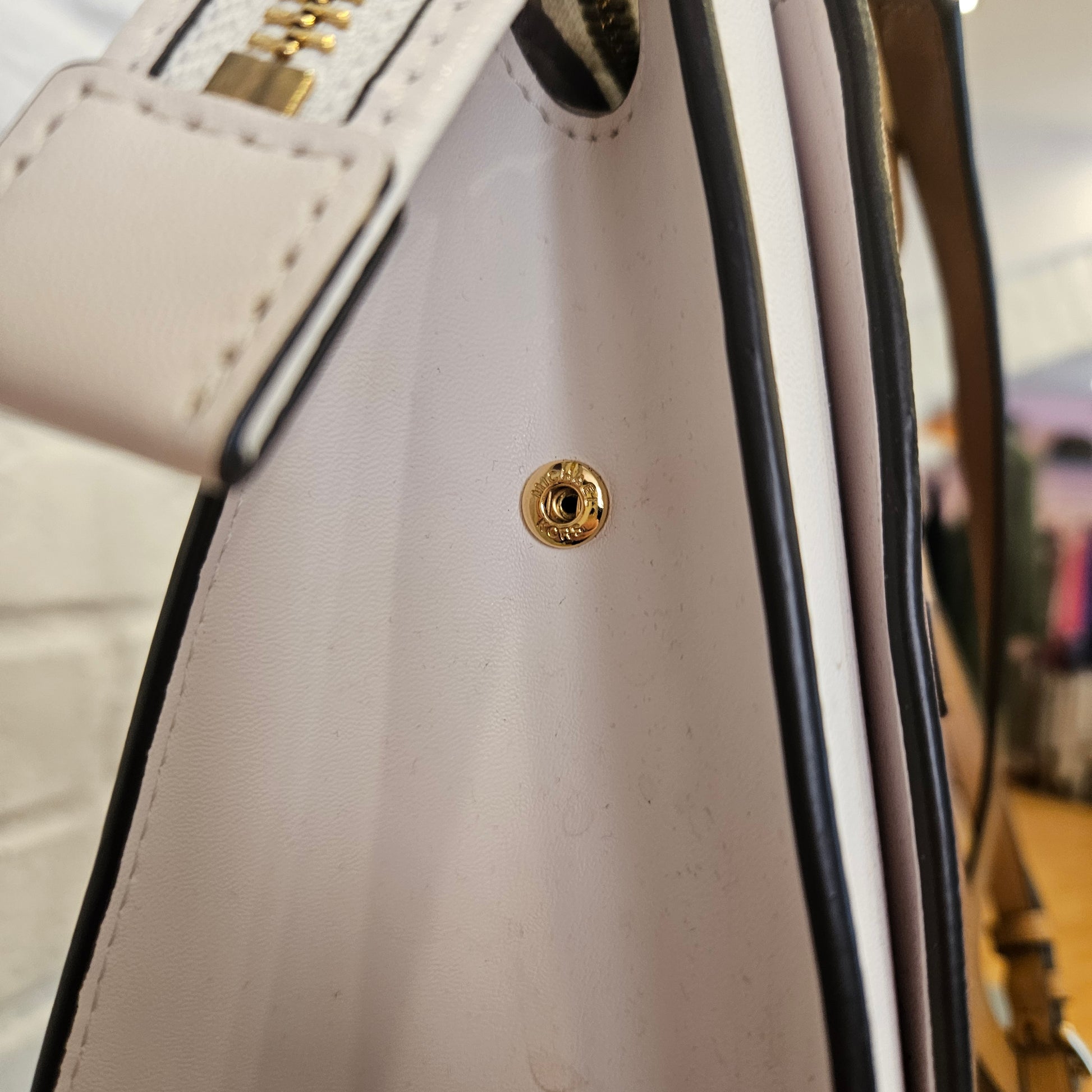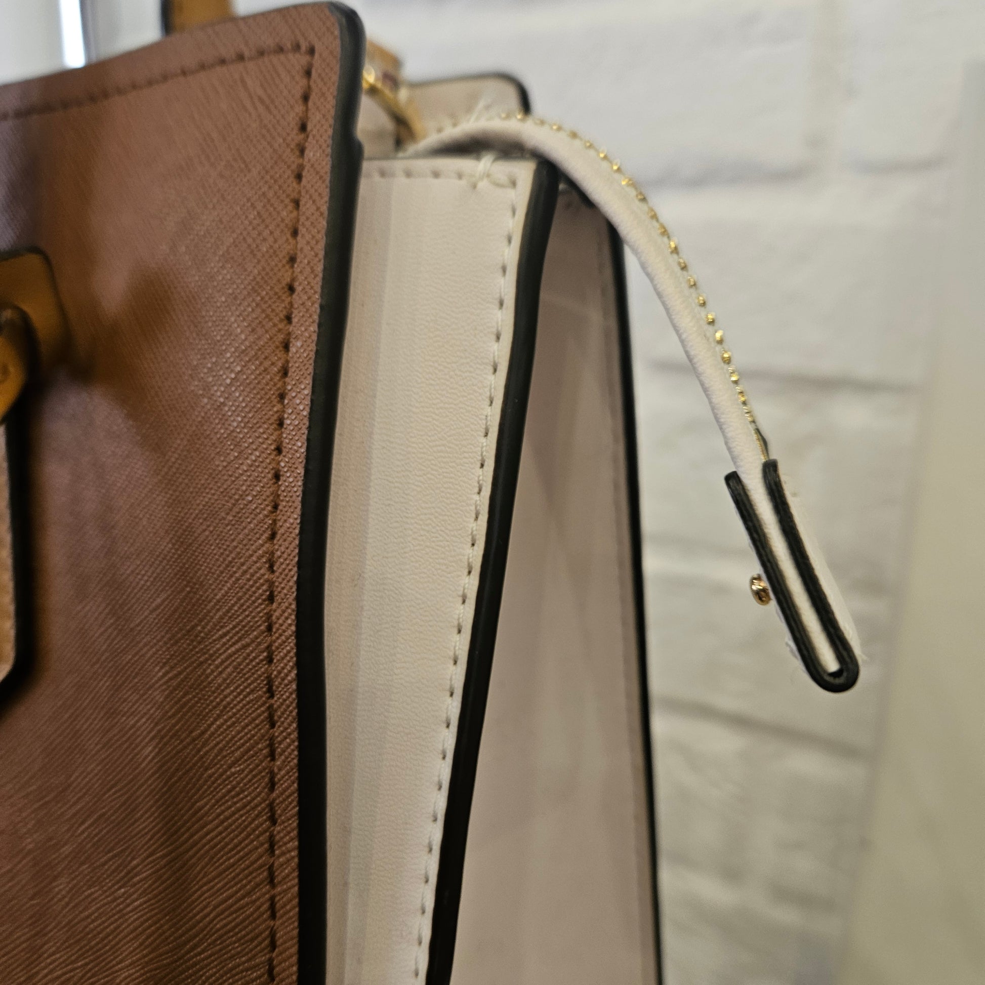 Borsa Michael Kors in colorazione marrone e bianca, tre scomparti di cui quello centrale con chiusura a zip. Hardware dorati. Borsa in condizioni pari al nuovo.