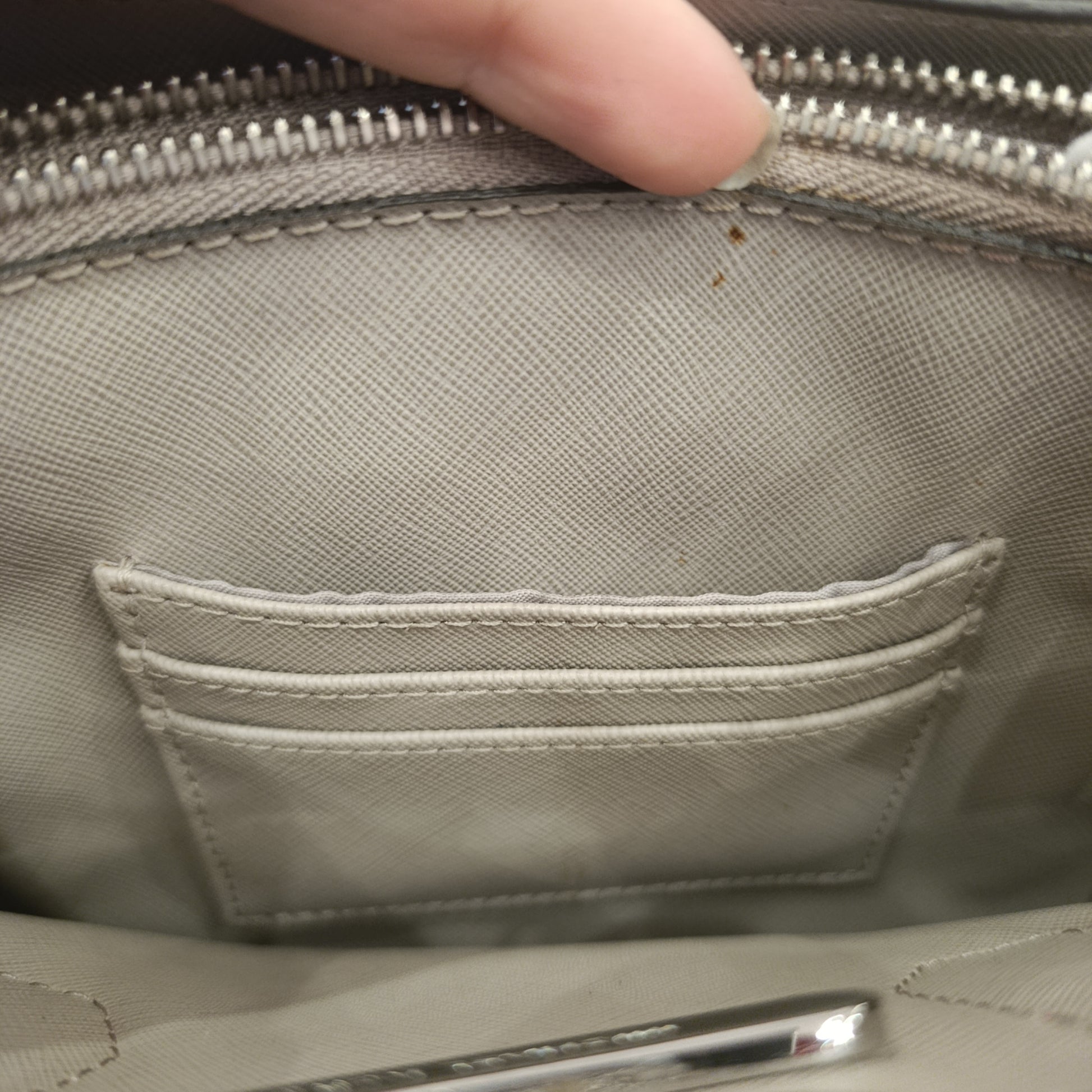 La borsa all'interno presenta 3 scomparti, il centrale ha la chiusura tramite zip in colorazione argento come il resto della metalleria della borsa.