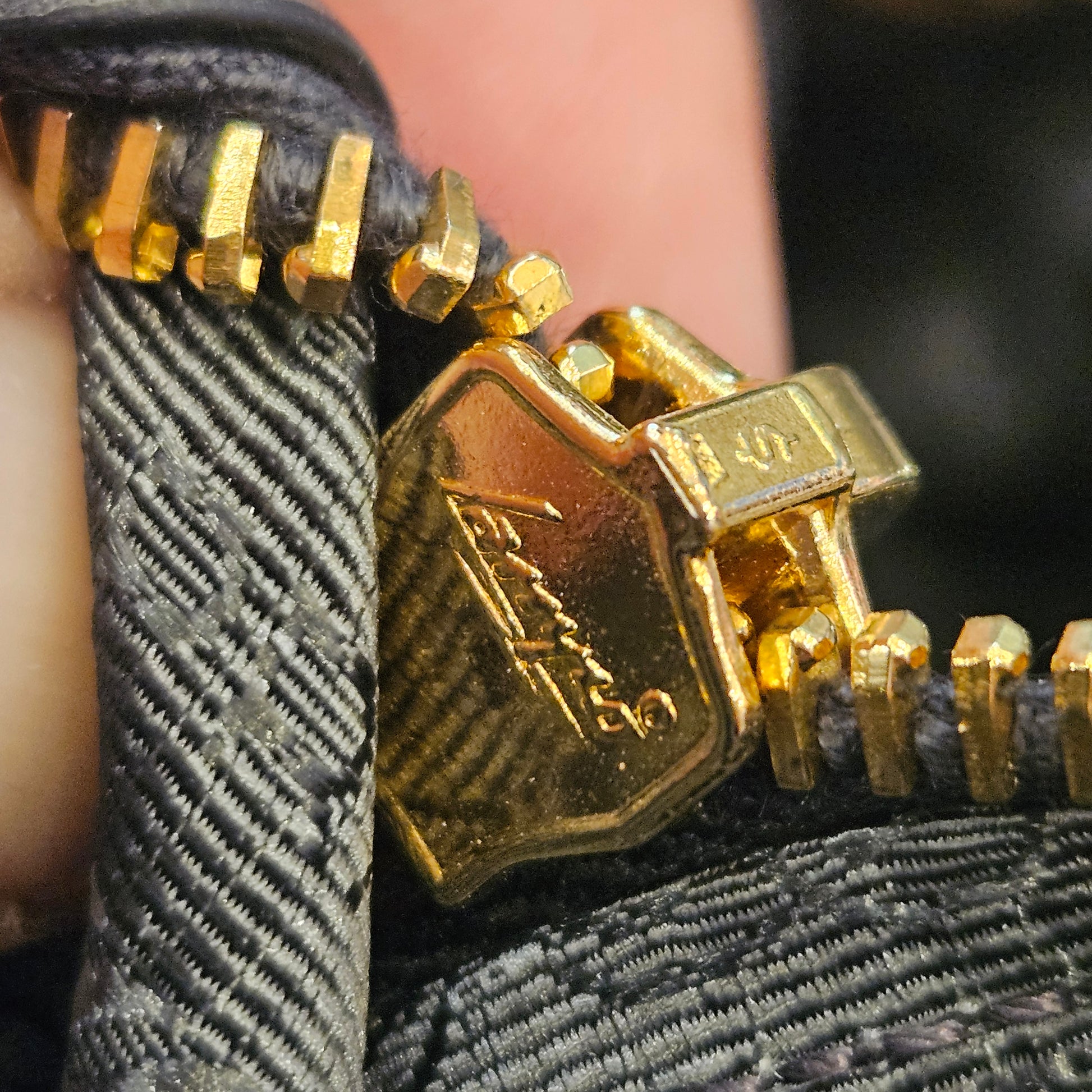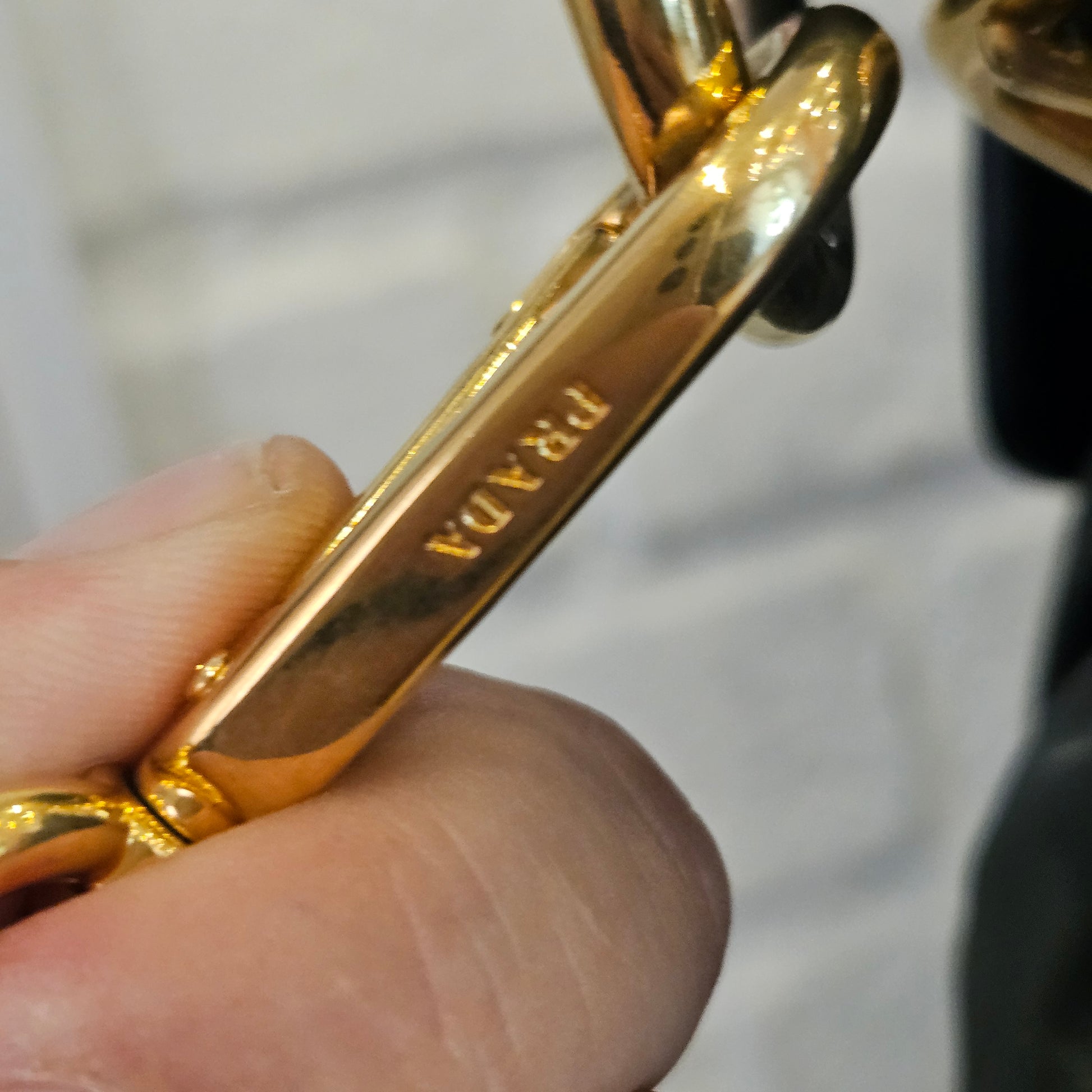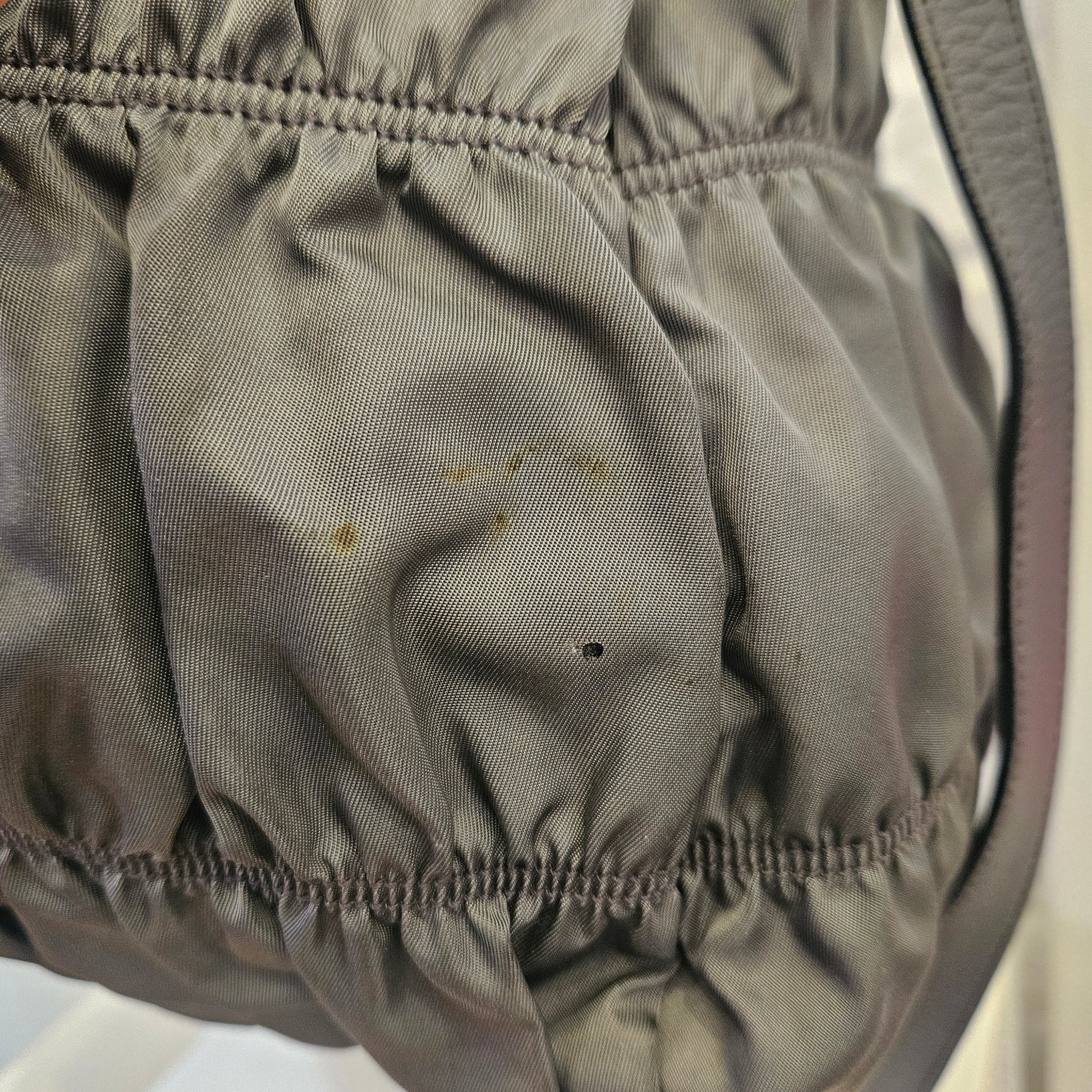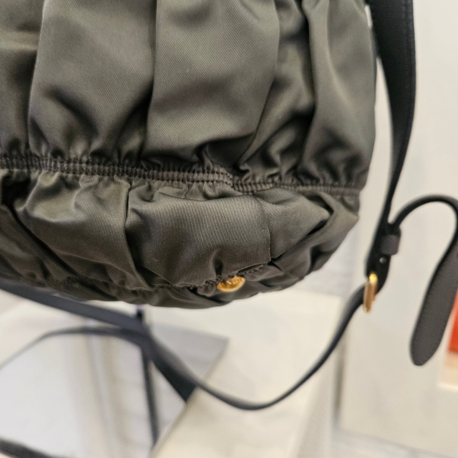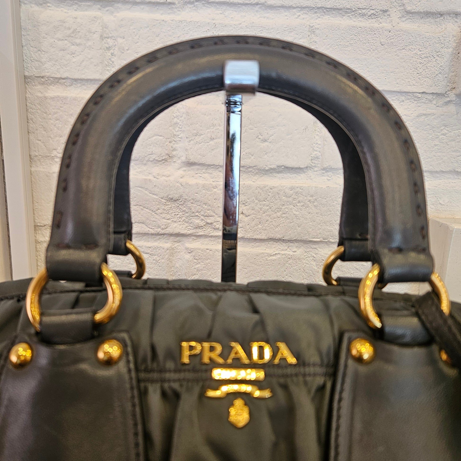 Borsa aprada in tessuto tecnico griffato im colorazione verde militare e dettagli metallici dorati, la borsa é in ottime condizioni segnaliamo micro macchiette sul retro(visibili in foto). Interno in ottime condizioni. Borsa dotata di tracolla