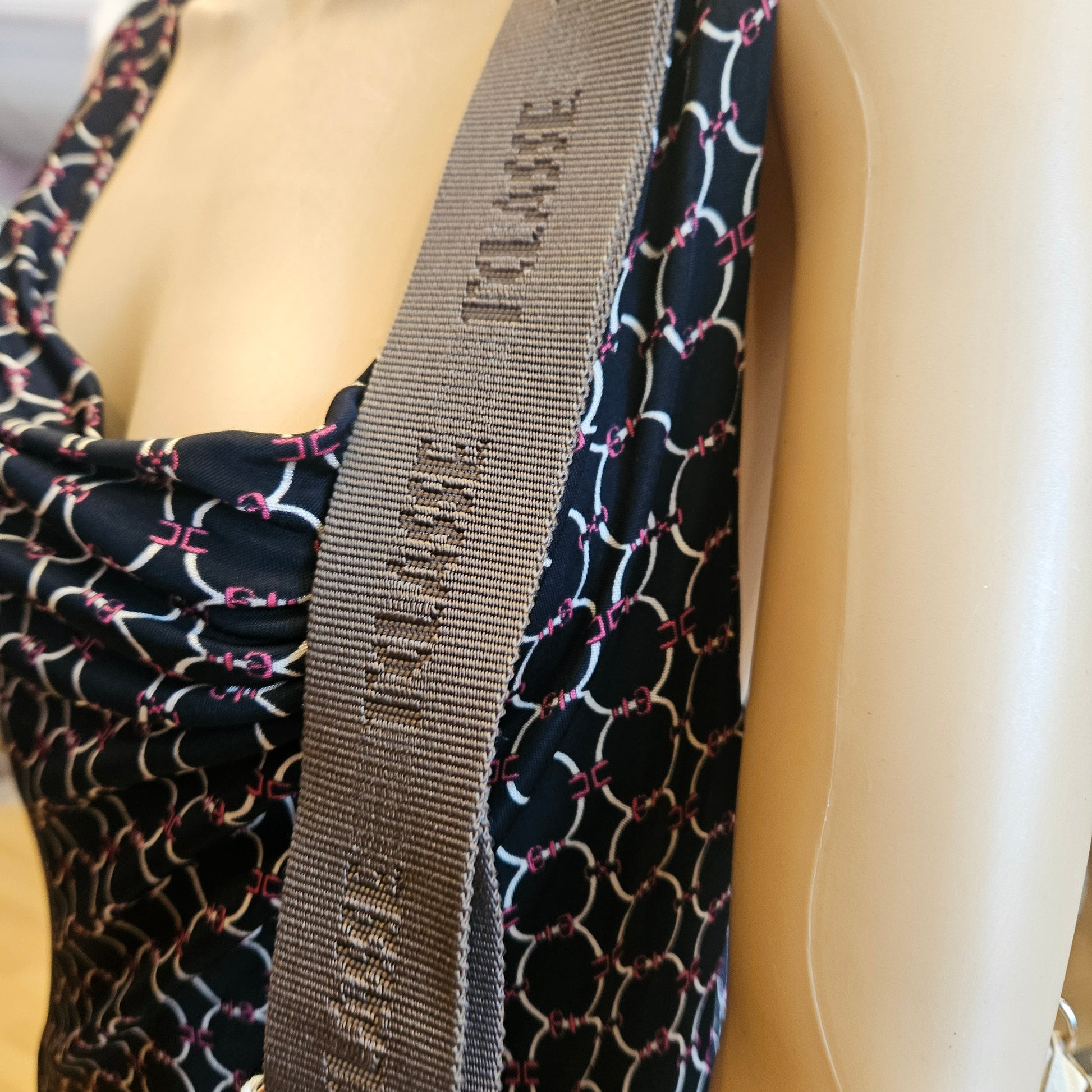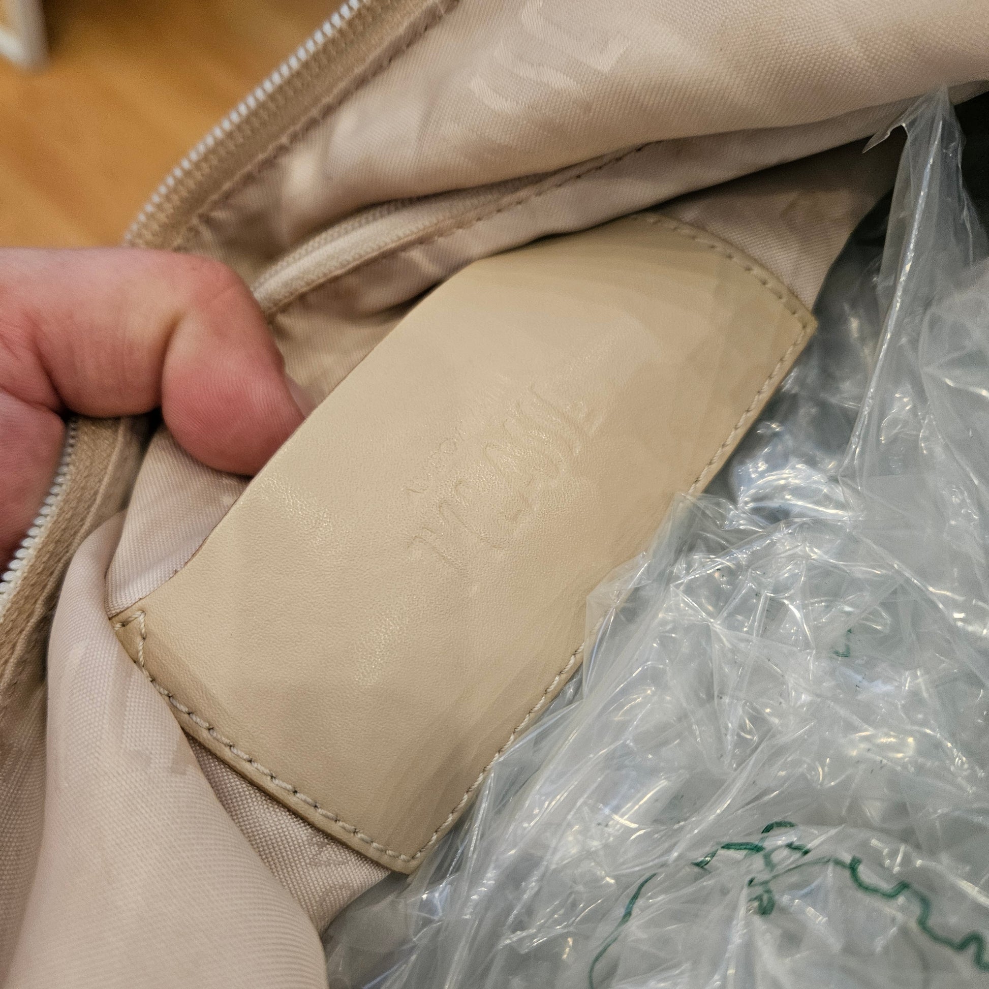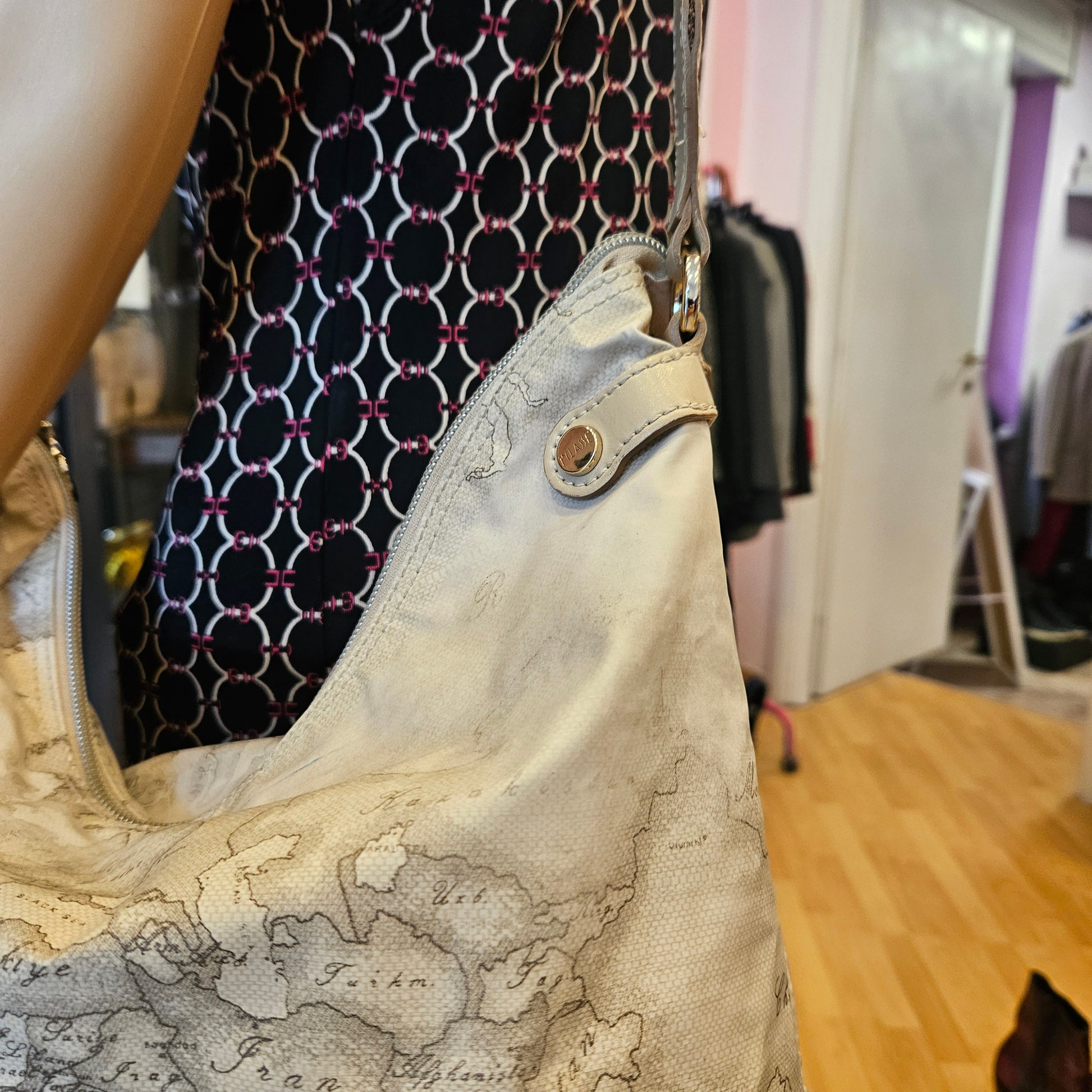 Borsa Prima Classe in nylon colorazione beige con classica stampa mappa, inserti in in pelle e tracolla in tela
