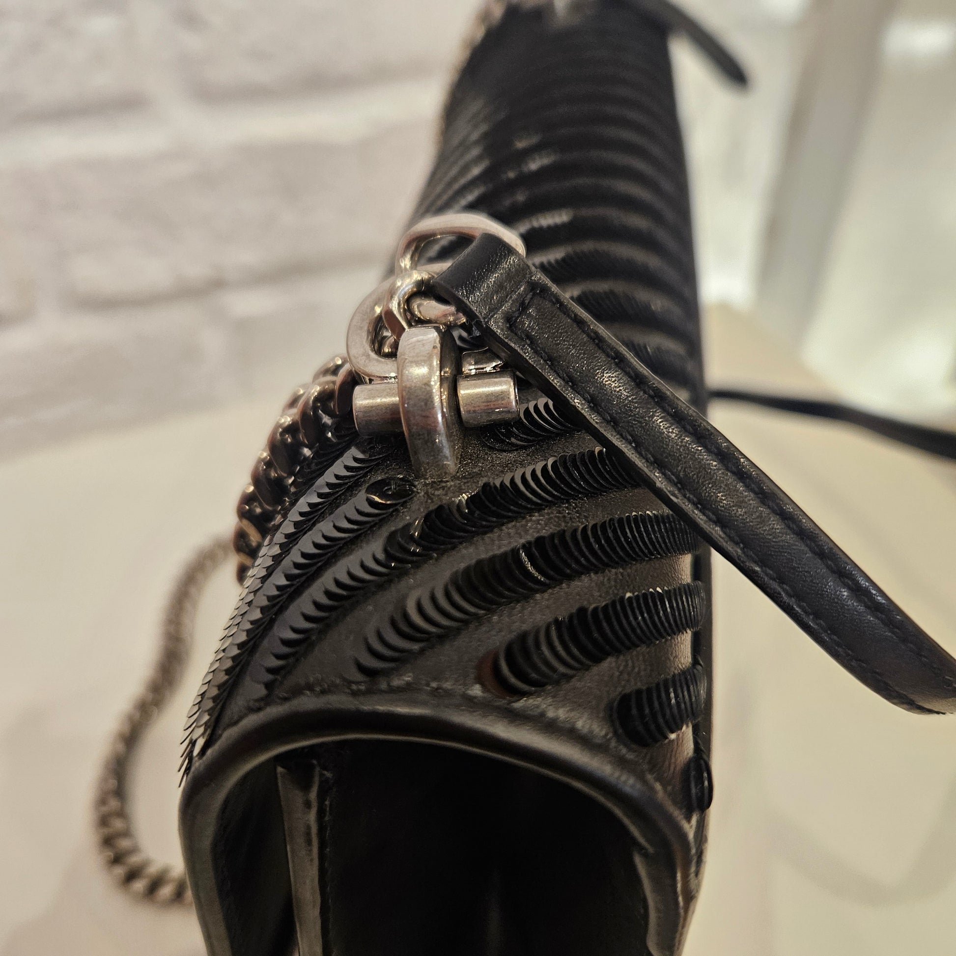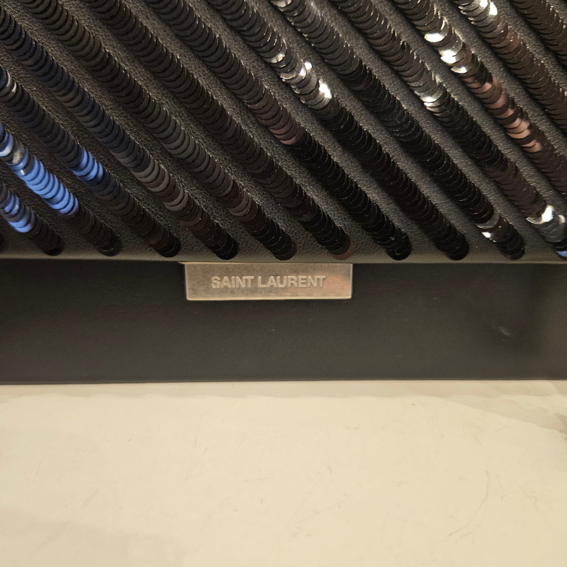 Borsa Saint Laurent in pelle nera con pailettes su motivo diagonale, chiusura a patta, tracolla a catena scorrevole che può essere regolata in Lunghezza grazie all'inserto in pelle, hardware cromato. Borsa stupenda in ottime condizioni estetiche priva di graffi o segni dovuti all'uso