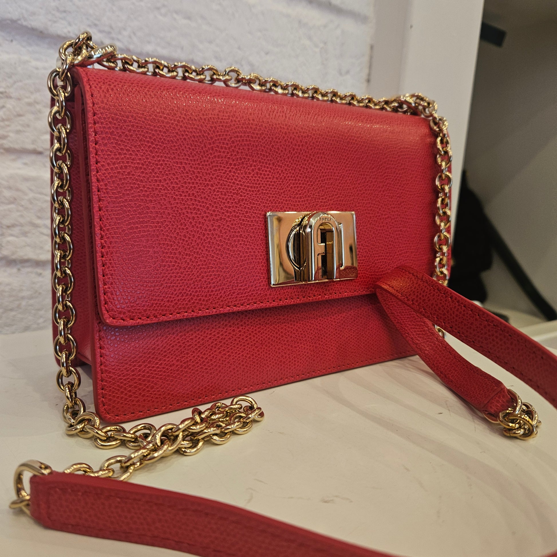 Borsa Furla Afragola in pelle rossa e dettagli metallici dorati, articolo in ottime condizioni priva di segni dovuti all'utilizzo. Dotata di dustbag