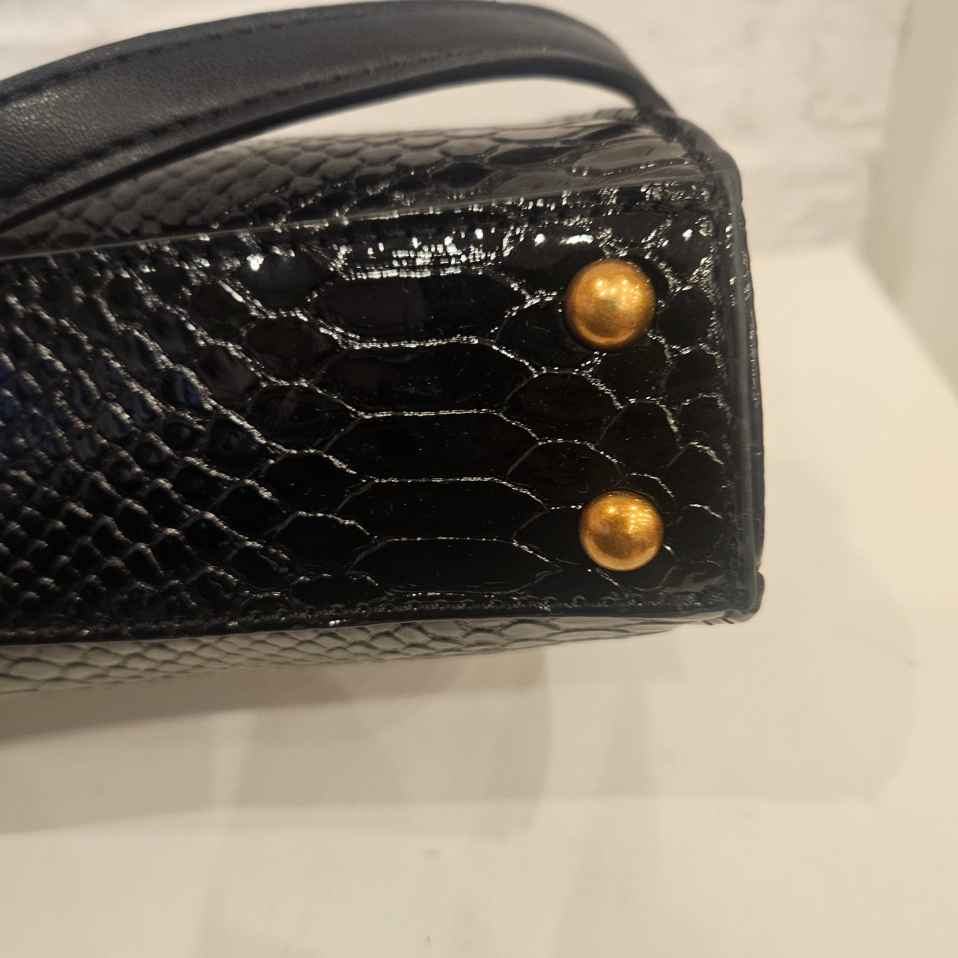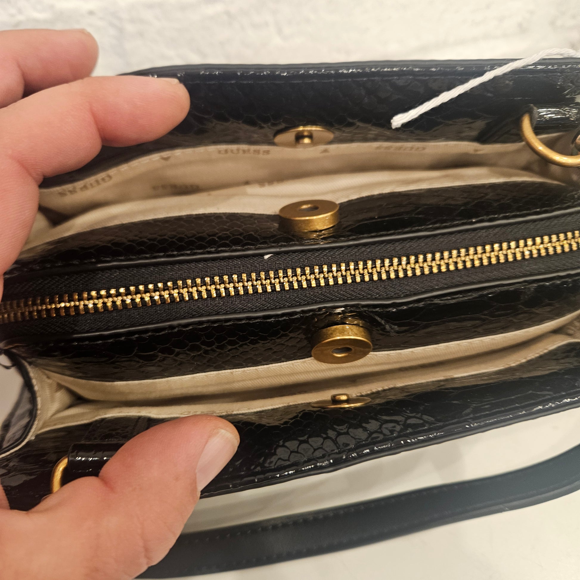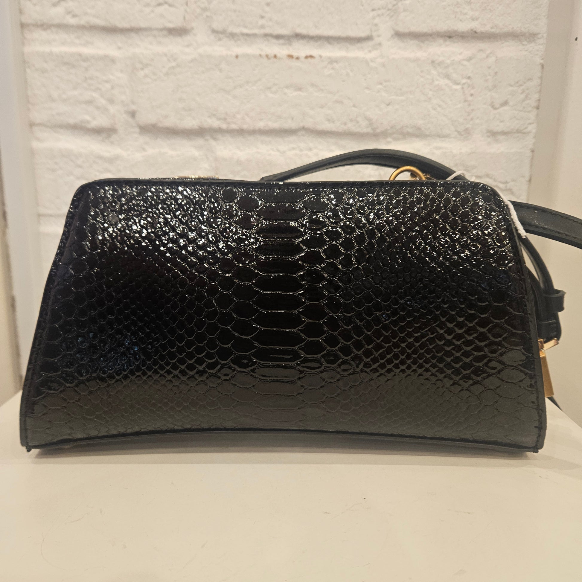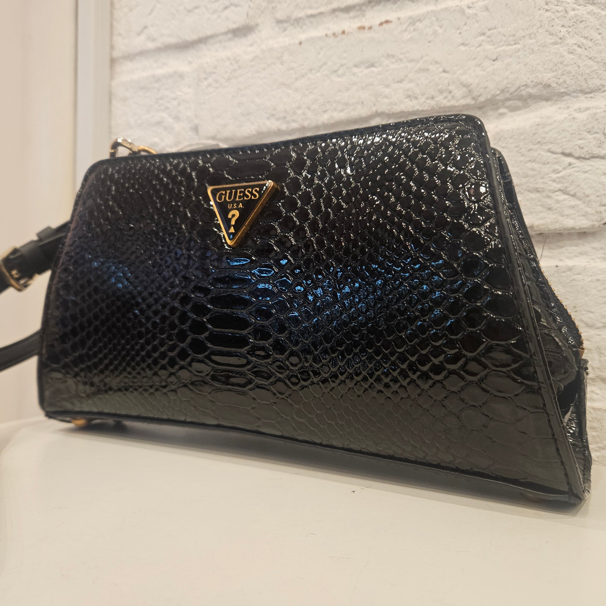 Borsetta guess a tracolla di forma trapeziodale in colorazione nera stampa rettile, borsa a tre scomparti, scomparto centrale con chiusura a zip.