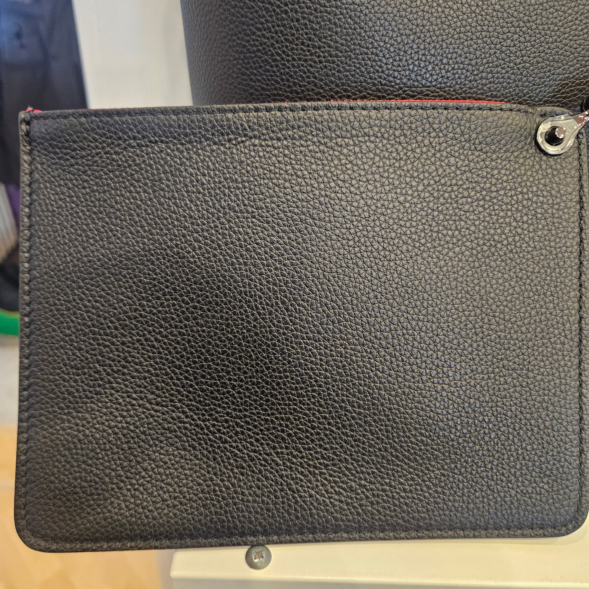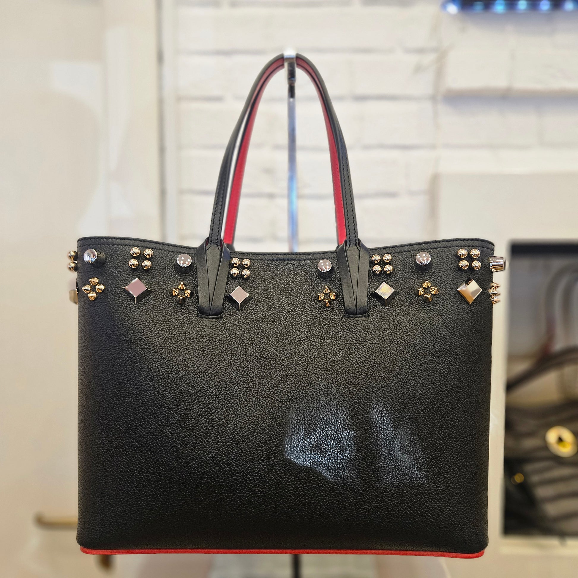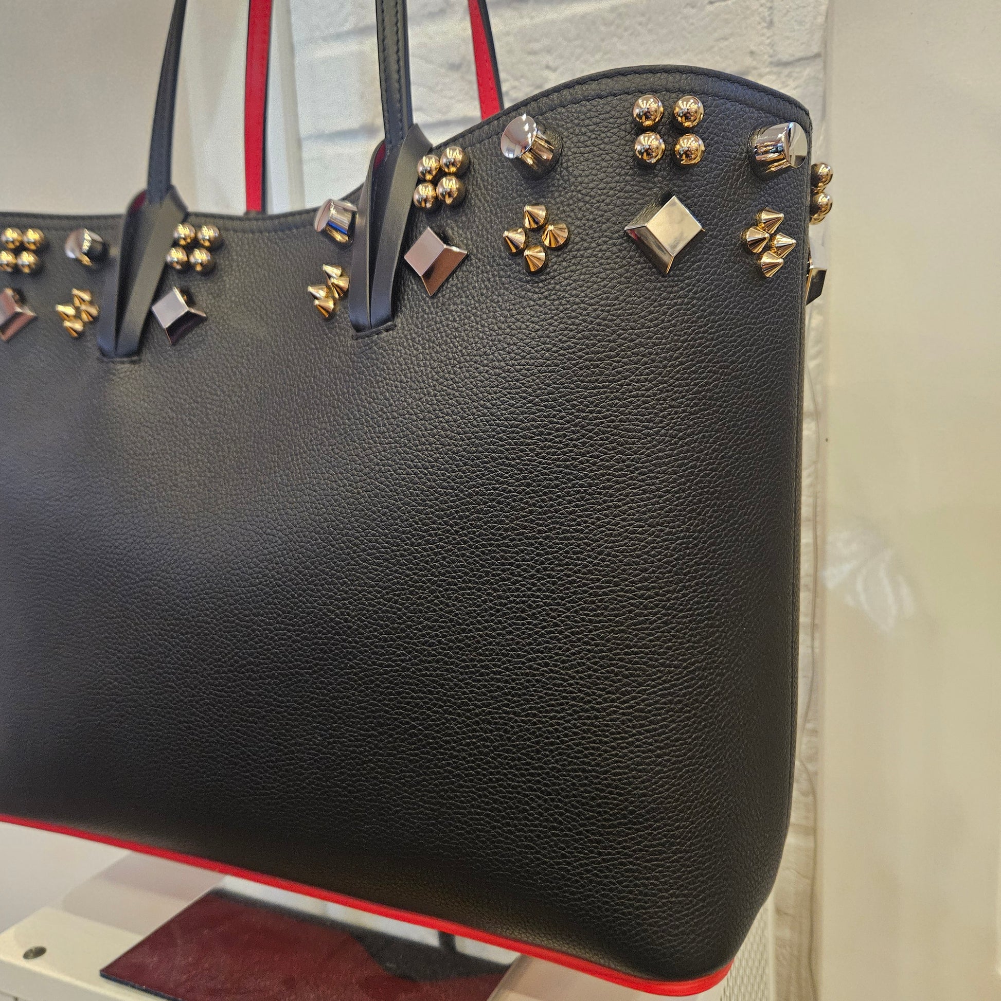 Tote bag Cabata Louboutin in pelle nera e rossa con annessa pochette interna estraibile, strass decorano la borsa sul bordo superiore, pelle morbida e priva di qualsiasi segno dovuto all'uso. Dotata di dustbag.