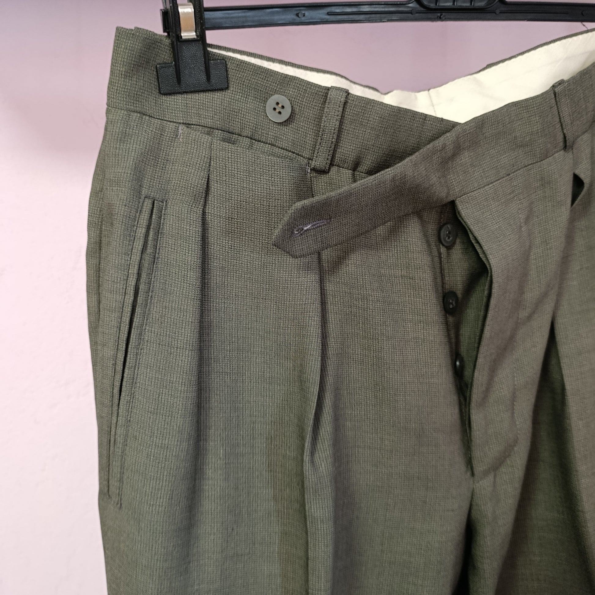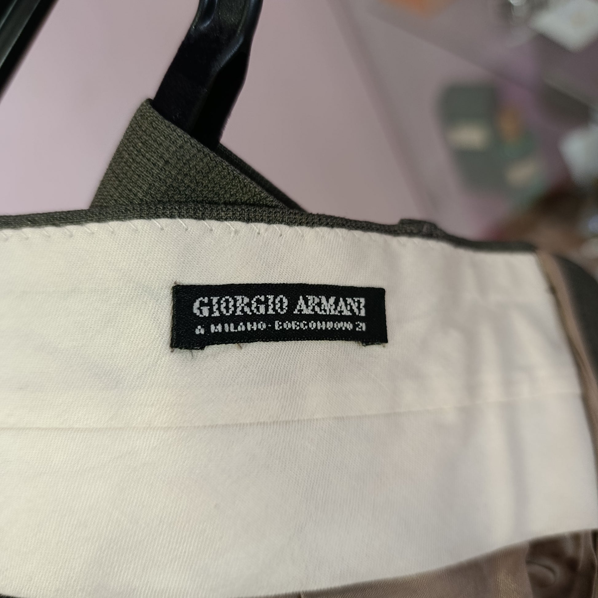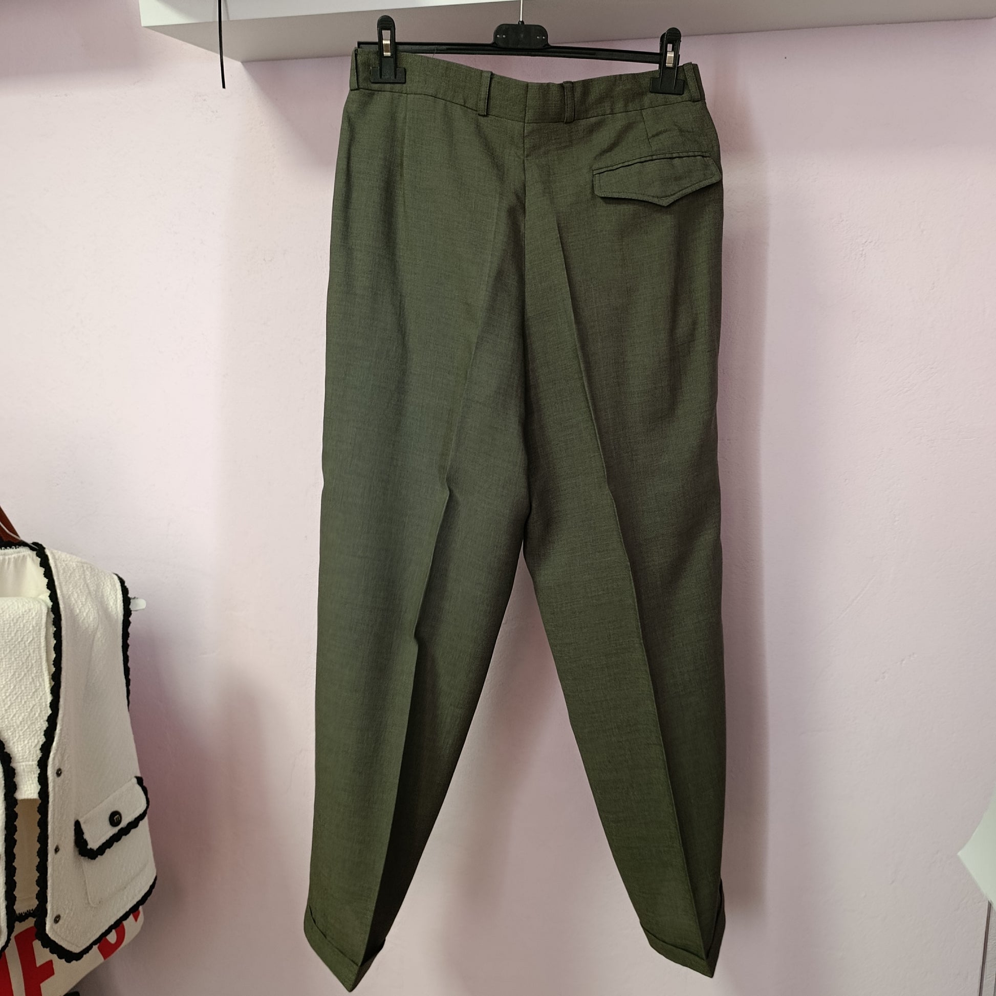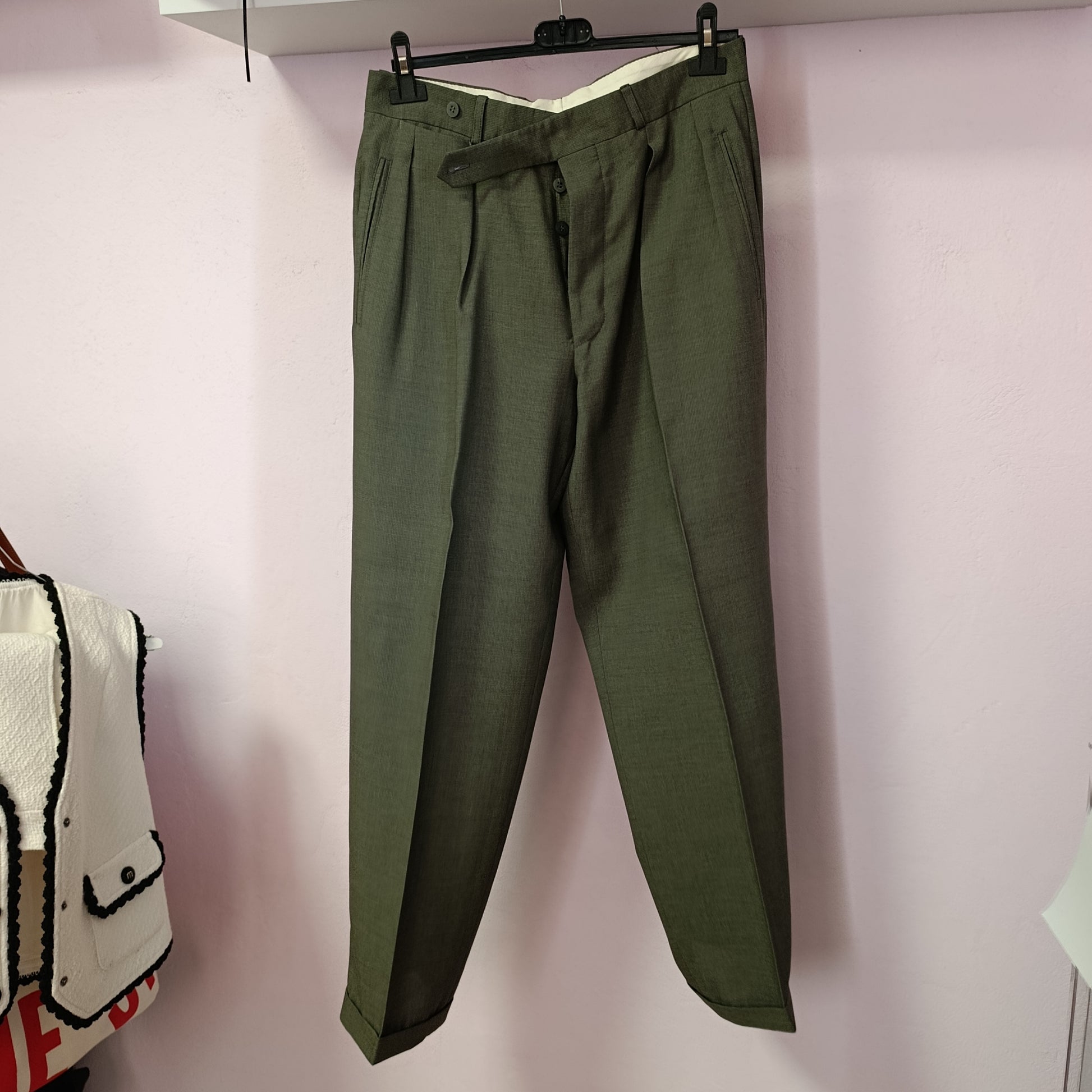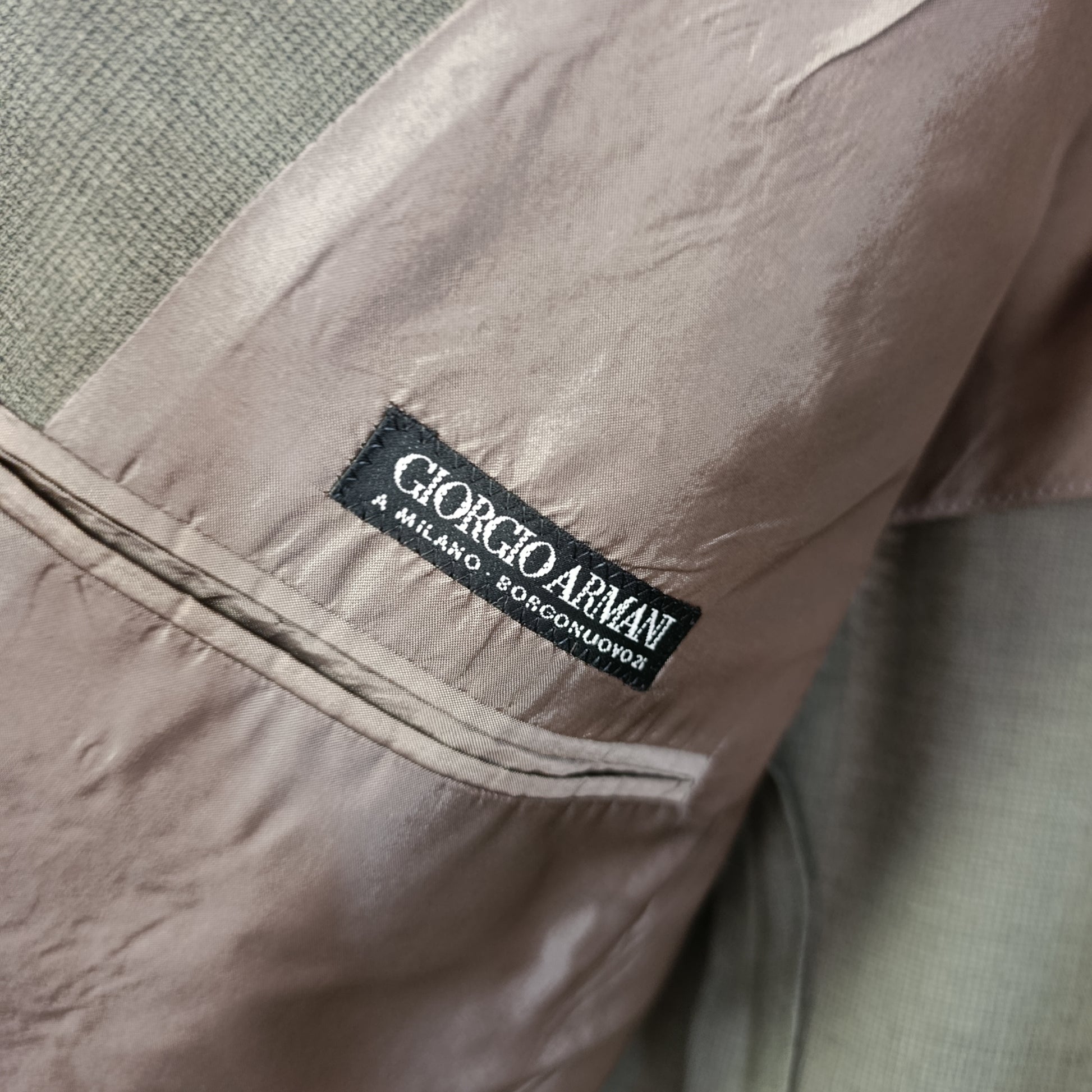 Completo Giorgio Armani colorazione salvia, articolo vintage che non presenta etichetta di taglia e composizione, giacca abbondante, pantalone con pence