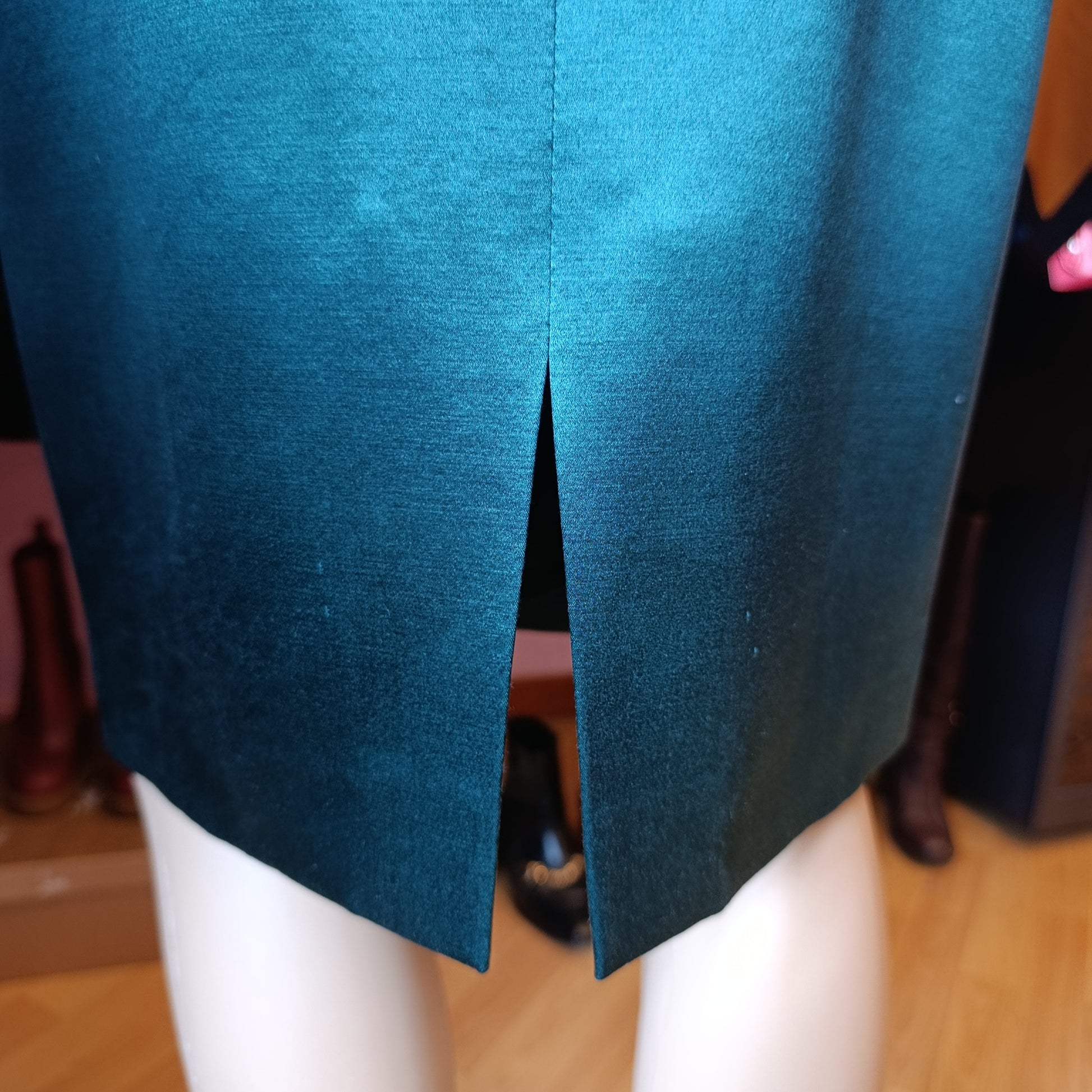 La gonna è una longuette semplicissima ma elegantissima, ha uno spacco sul retro e la chiusura è composta da cerniera e bottone verde.