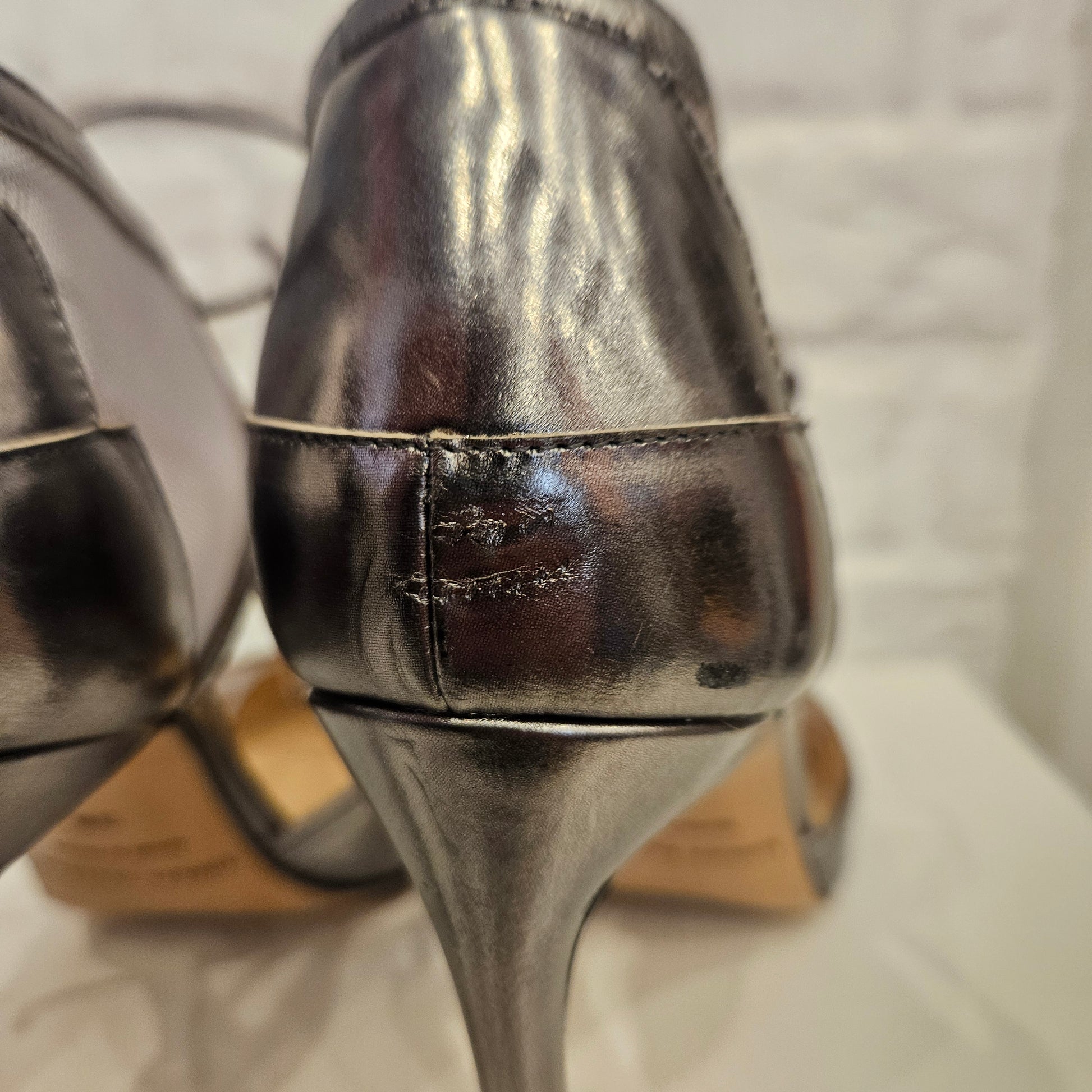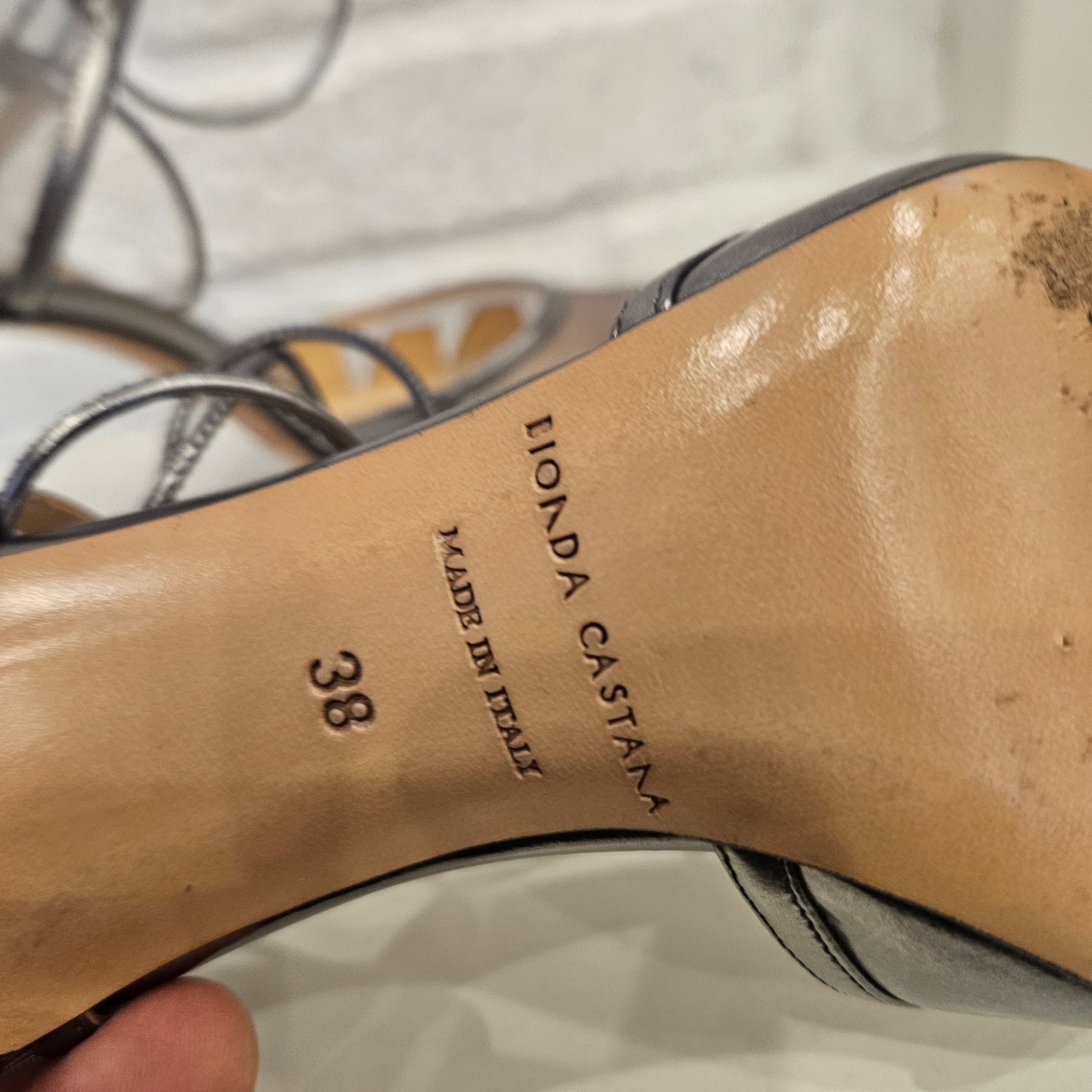 Décolleté n 38 Bionda Castana in pelle colorazione argento con inserti in nylon trasparente. Segnaliamo alcuni segni sulla punta
