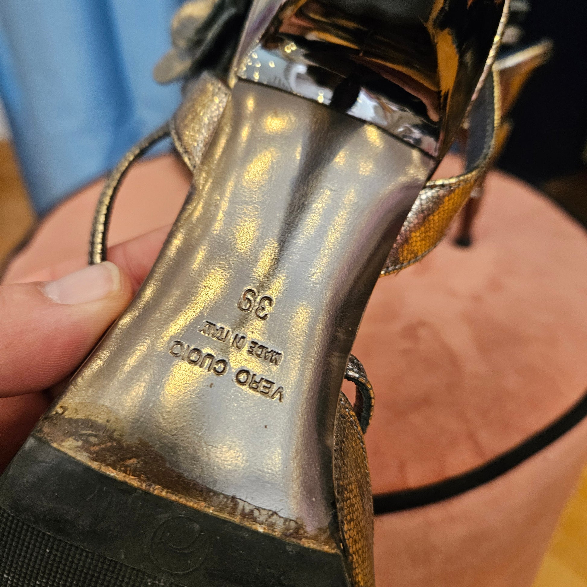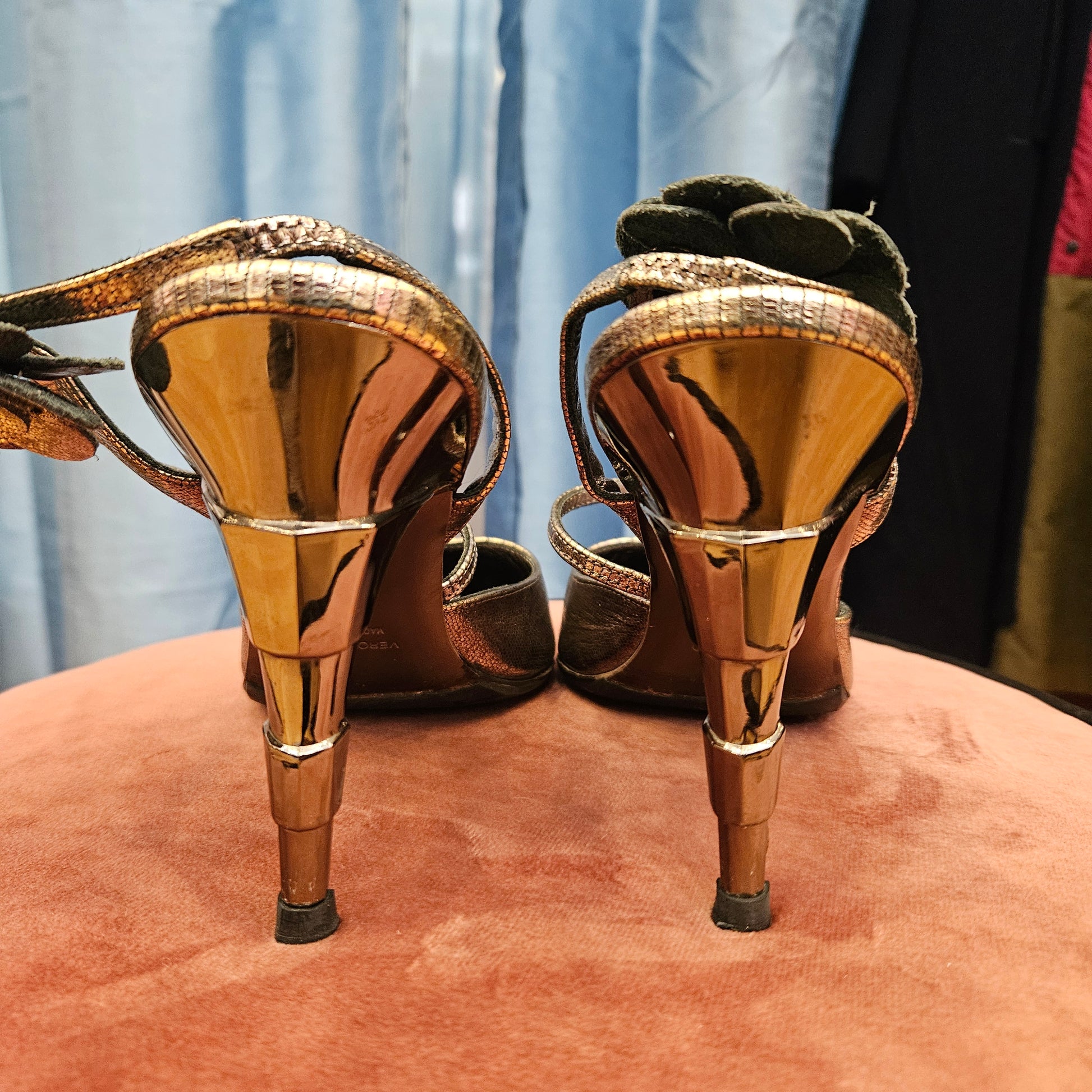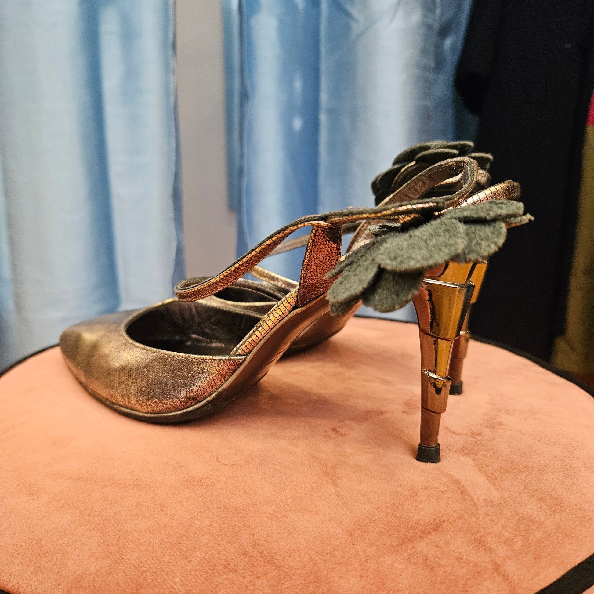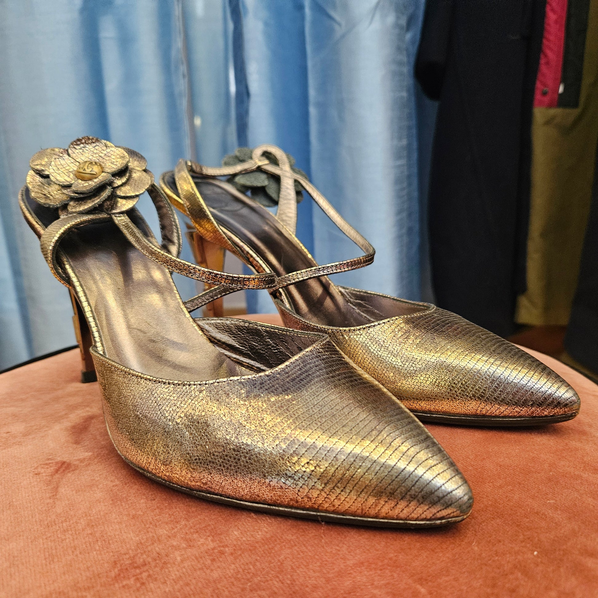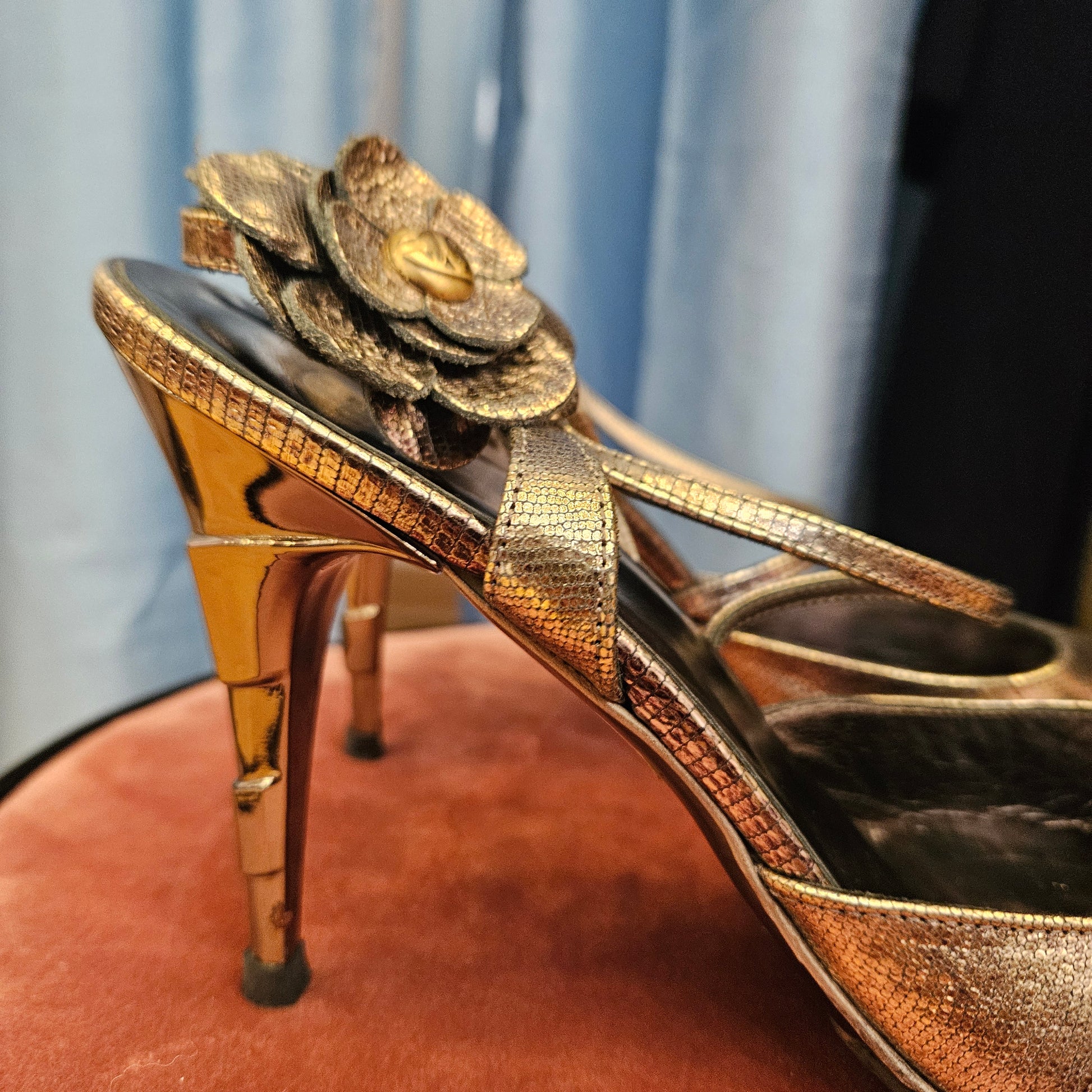 Décolleté Cavelli in colorazione dorata con laccetto e fiore in pelle su laccetti , tacco 10 cm, vendute con scatola