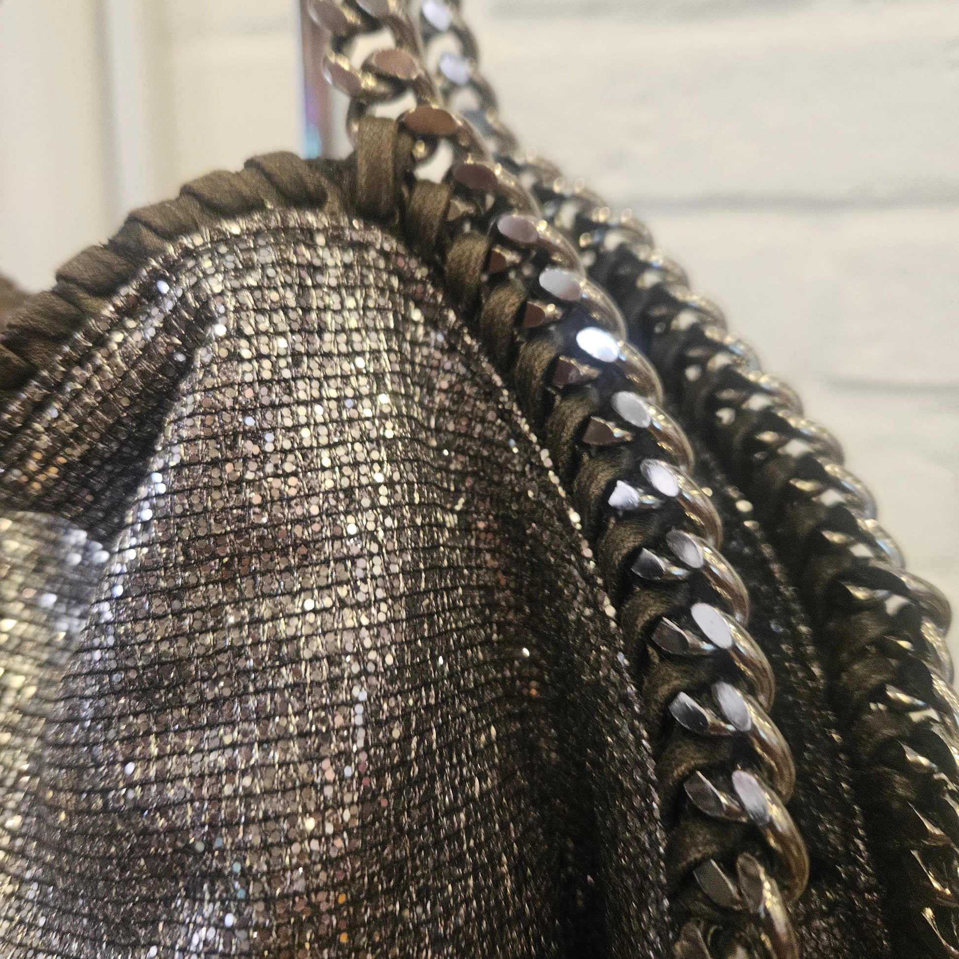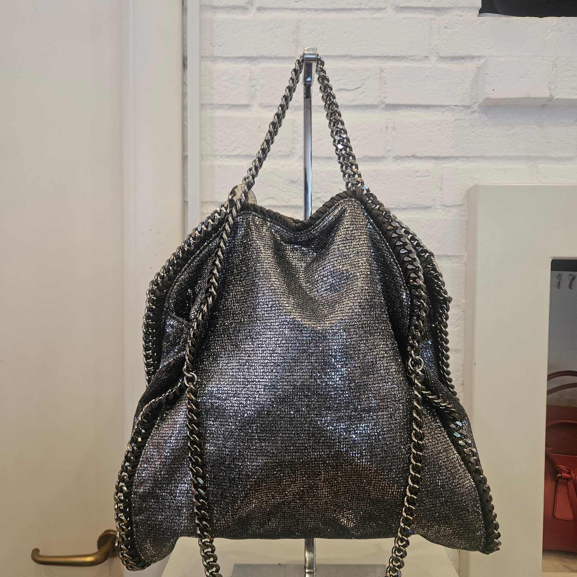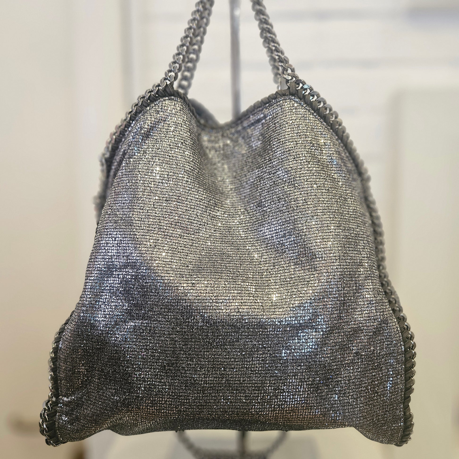 Borsa Falabella Stella McCartney in oelle vegana colorazione argento glitter con catena cromata, la borsa é in ottime condizioni sia esternamente che internamente.
