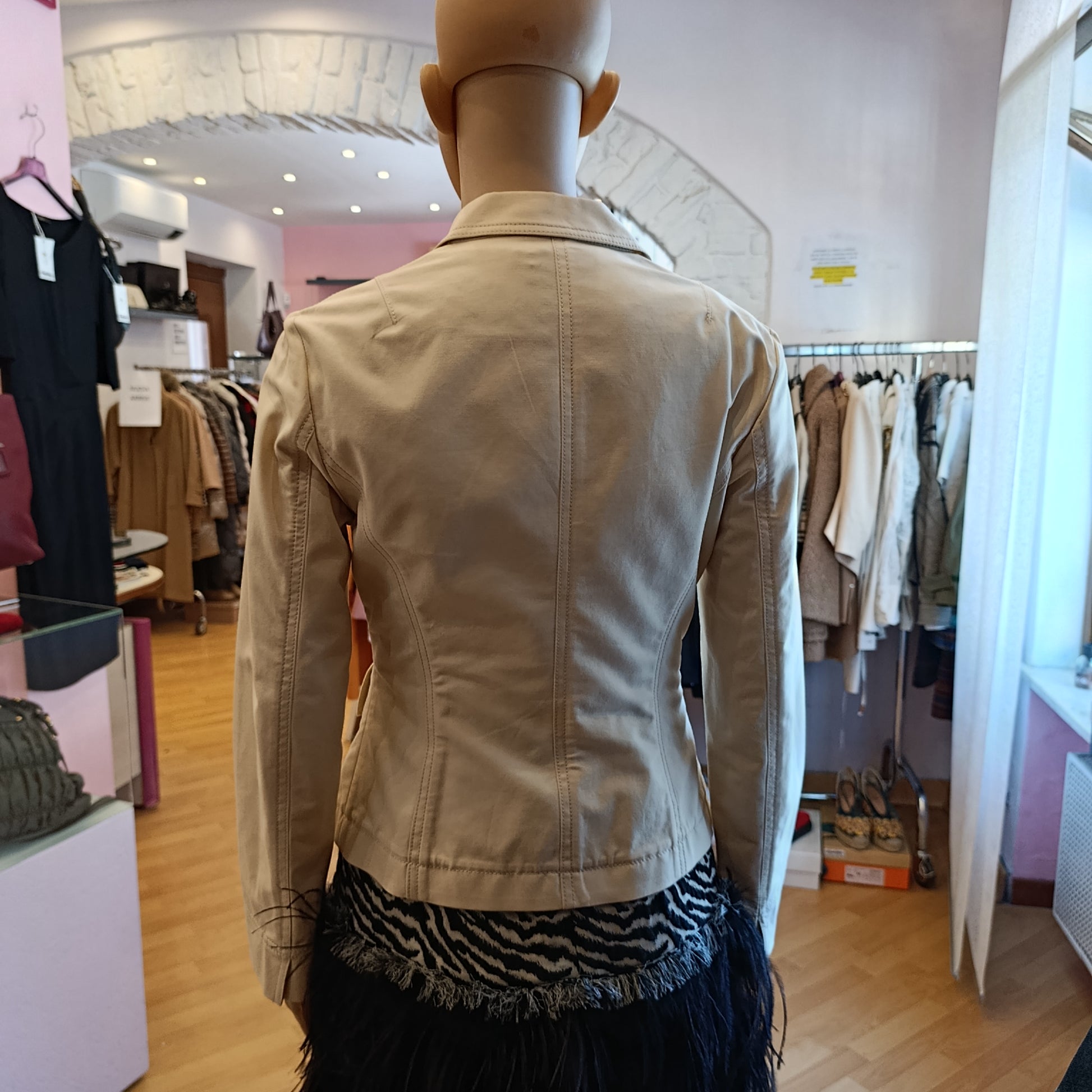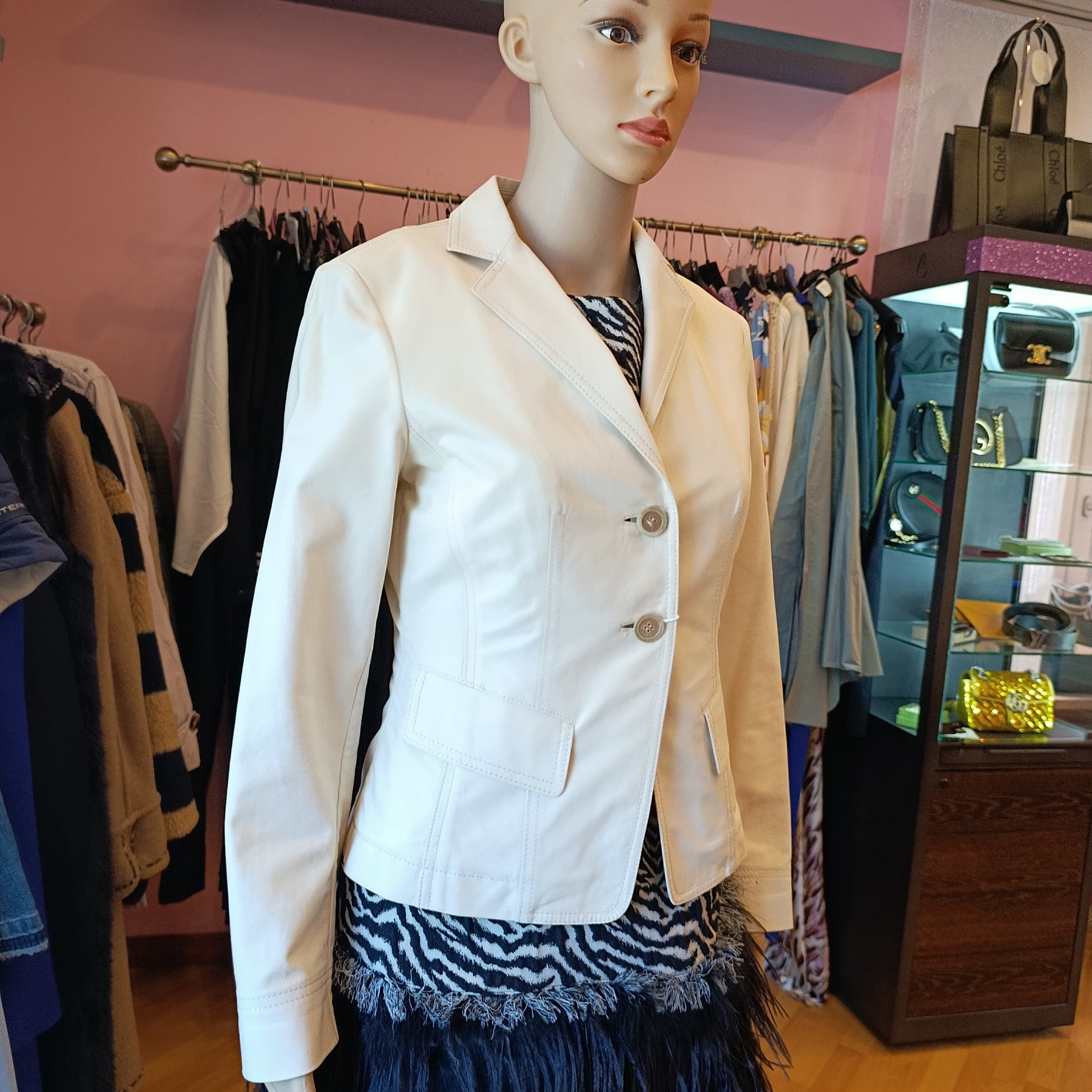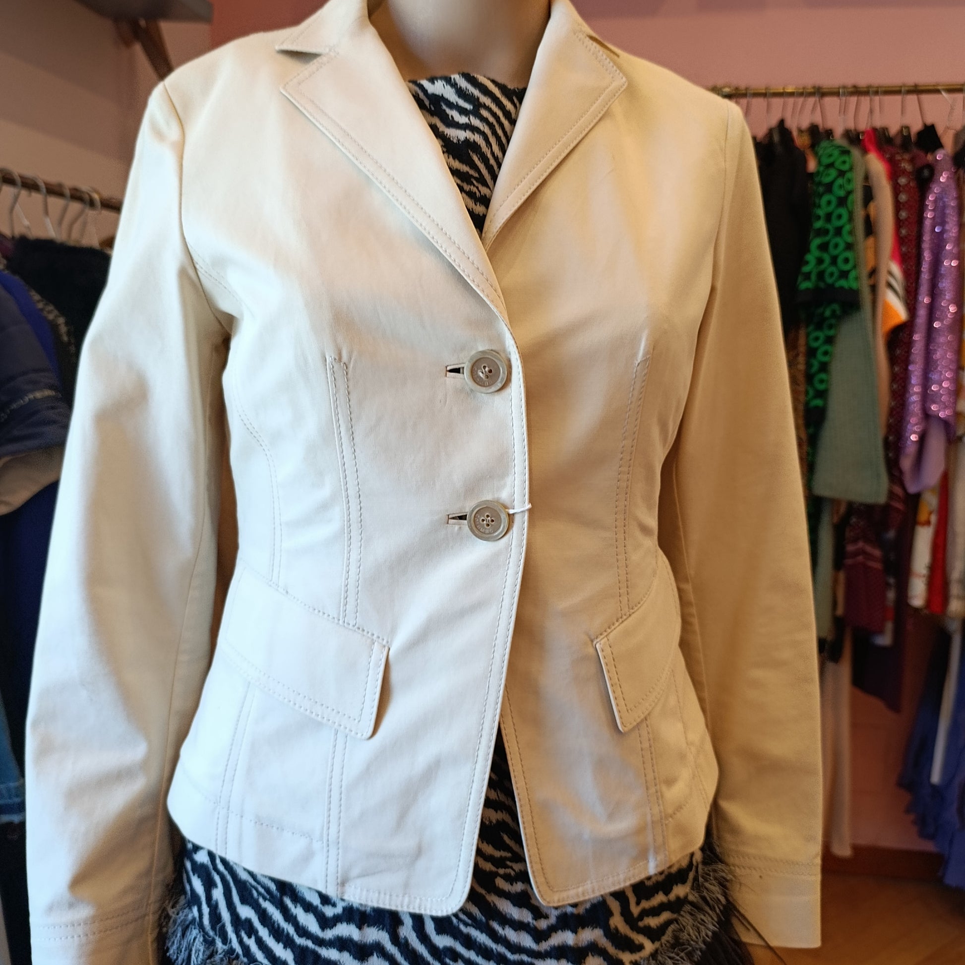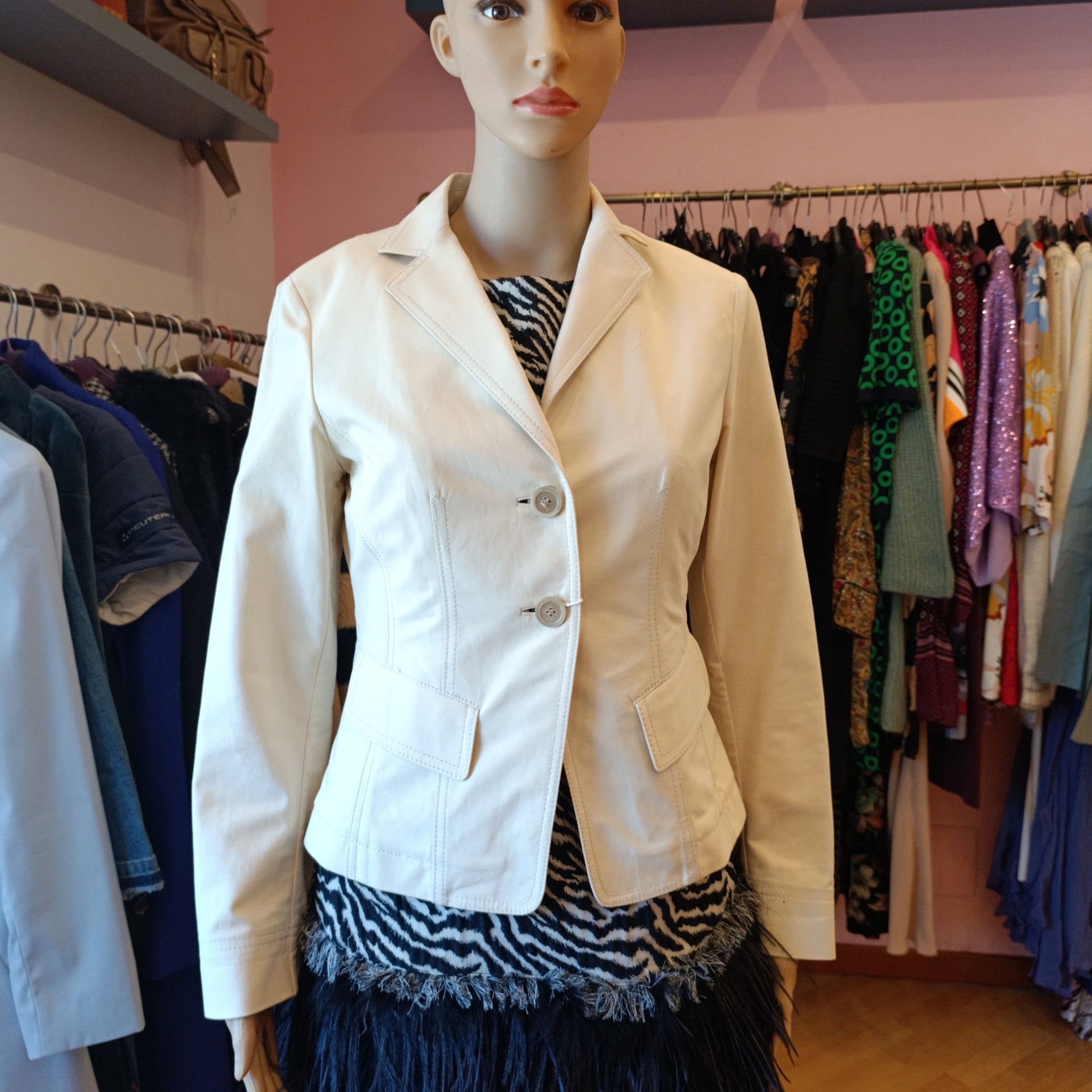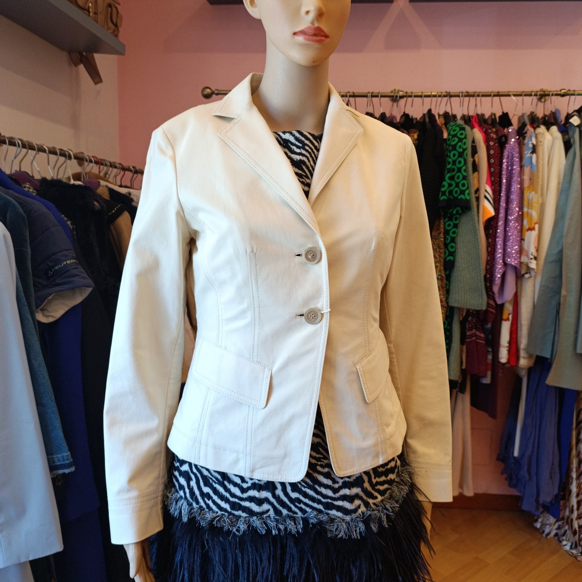 In cotone, condizioni ottimali anche se la giacca essendo chiara è leggermente da rinfrescare
