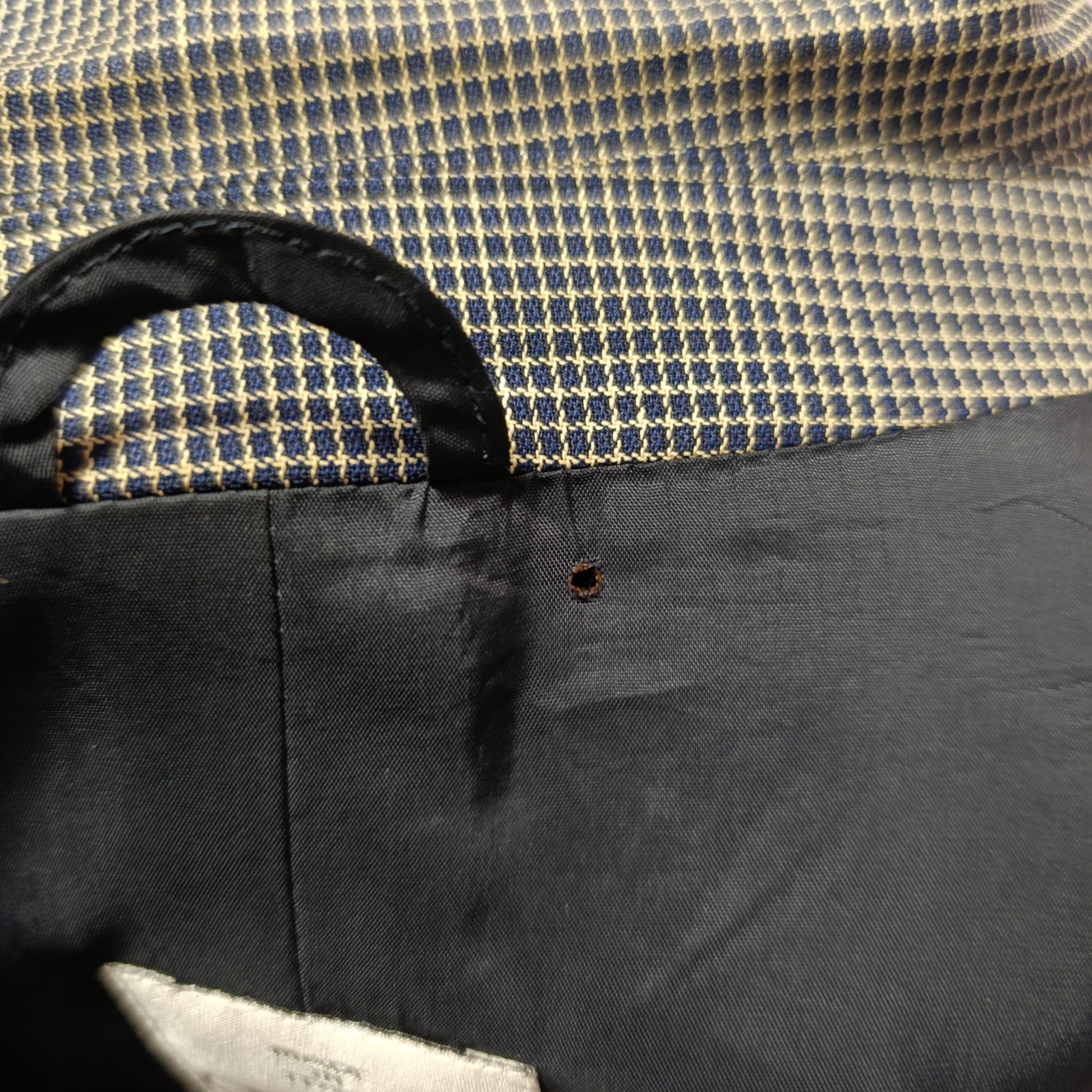 La giacca presenta un piccolo buchino alla fodera interna vicino all'etichetta in alto.