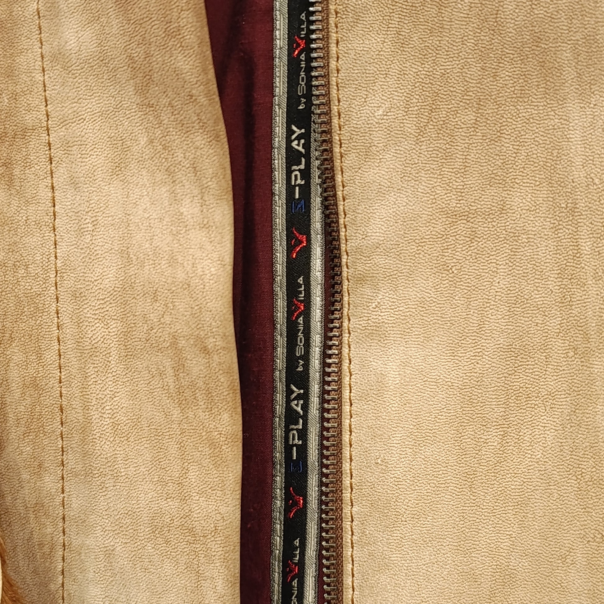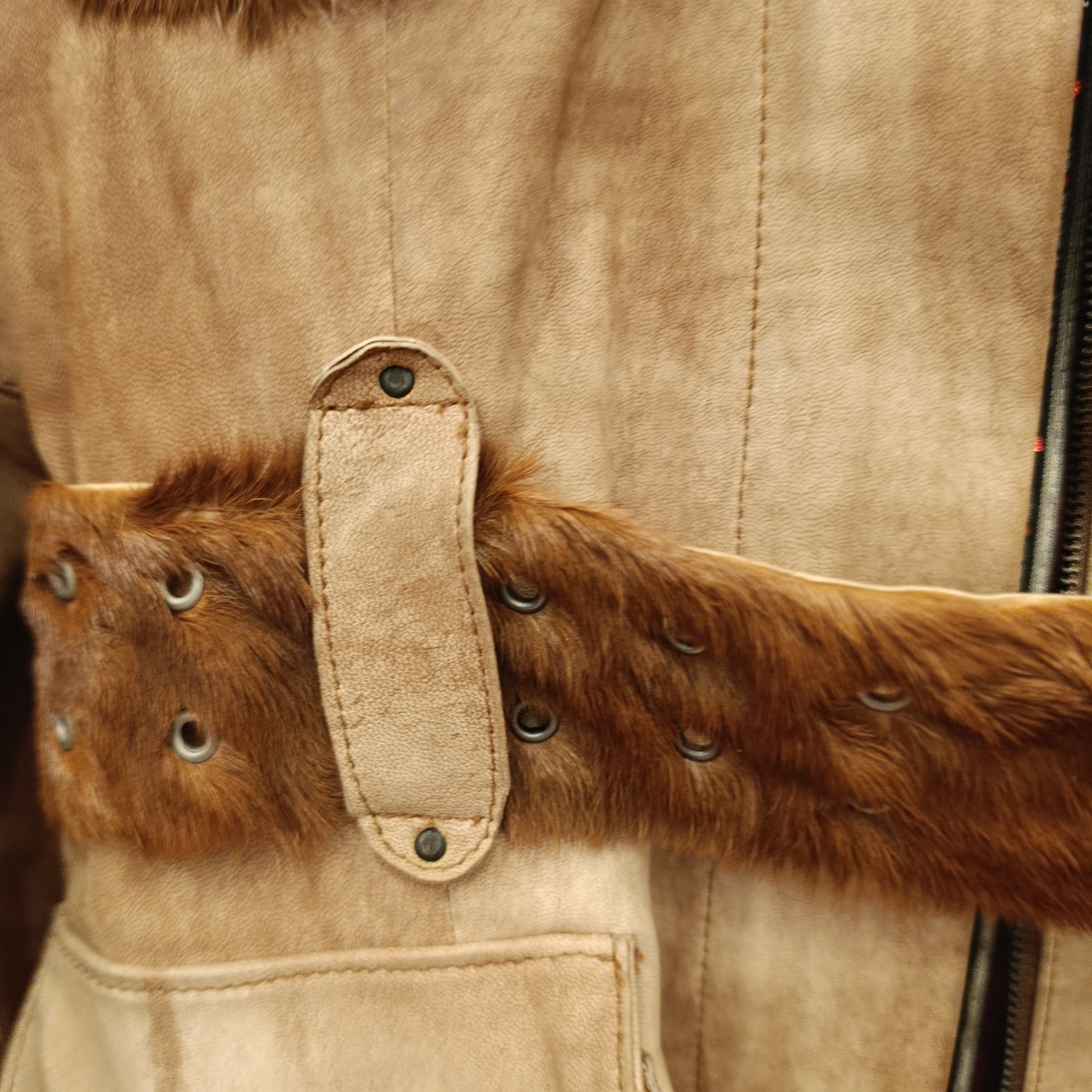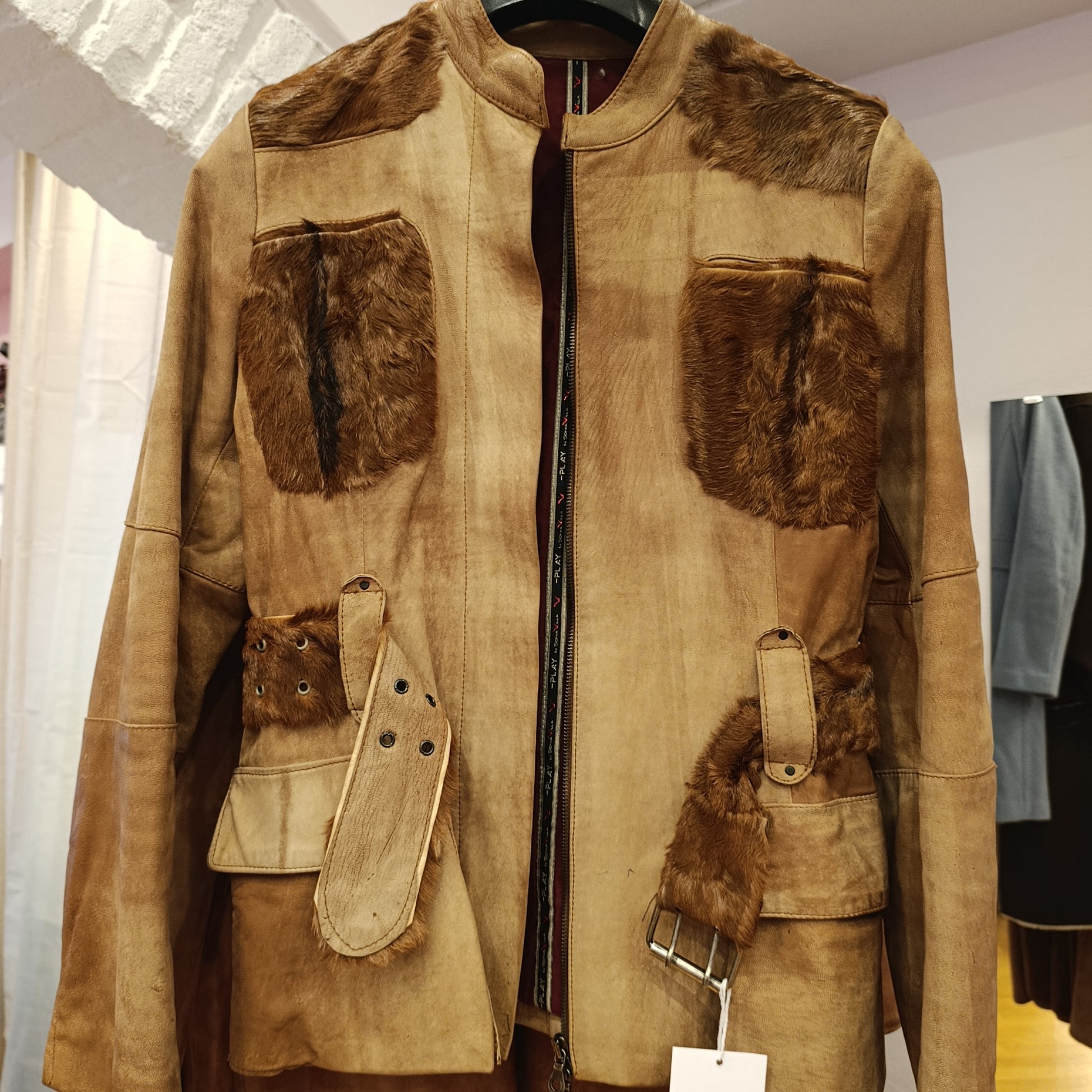 Giacca in pelle beige con inserti in cavallino, con cintura regolabile, zip sulle maniche e sul fronte