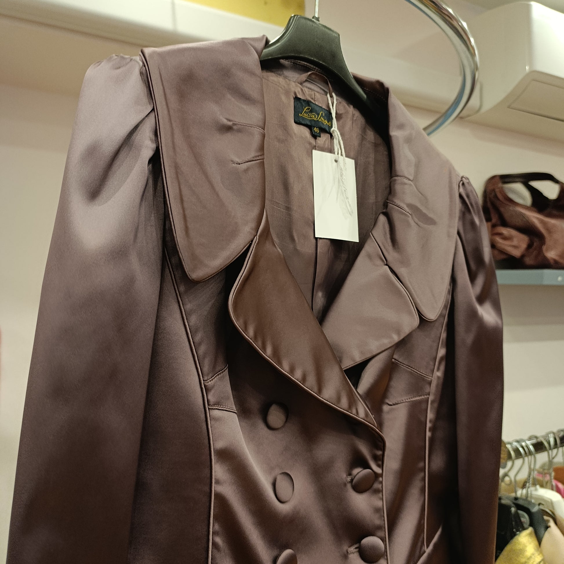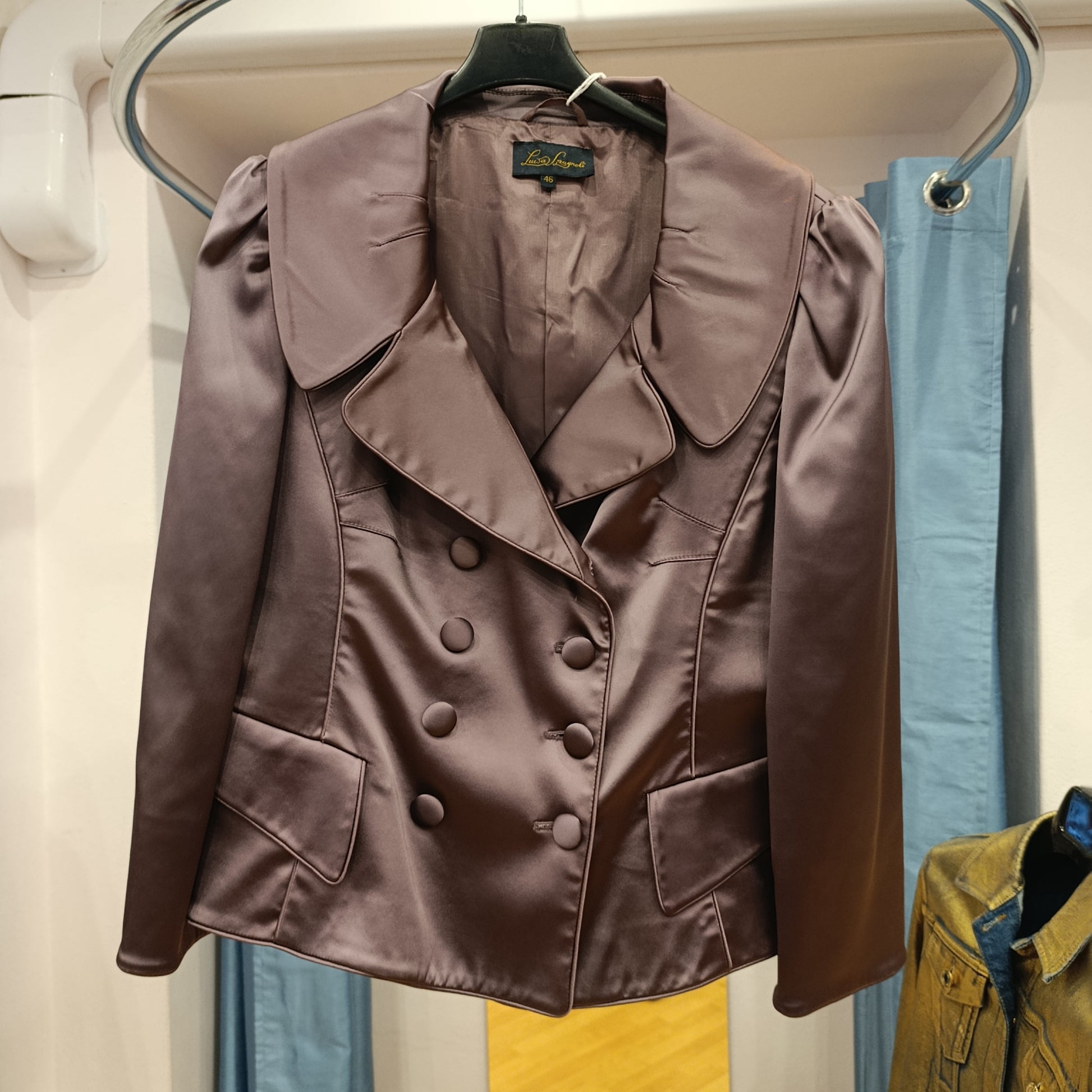 Giacca strutturata, spalle a sbuffo, Colletto molto importante stile vintage, bottoni tono su tono, doppiopetto, tasche finte.