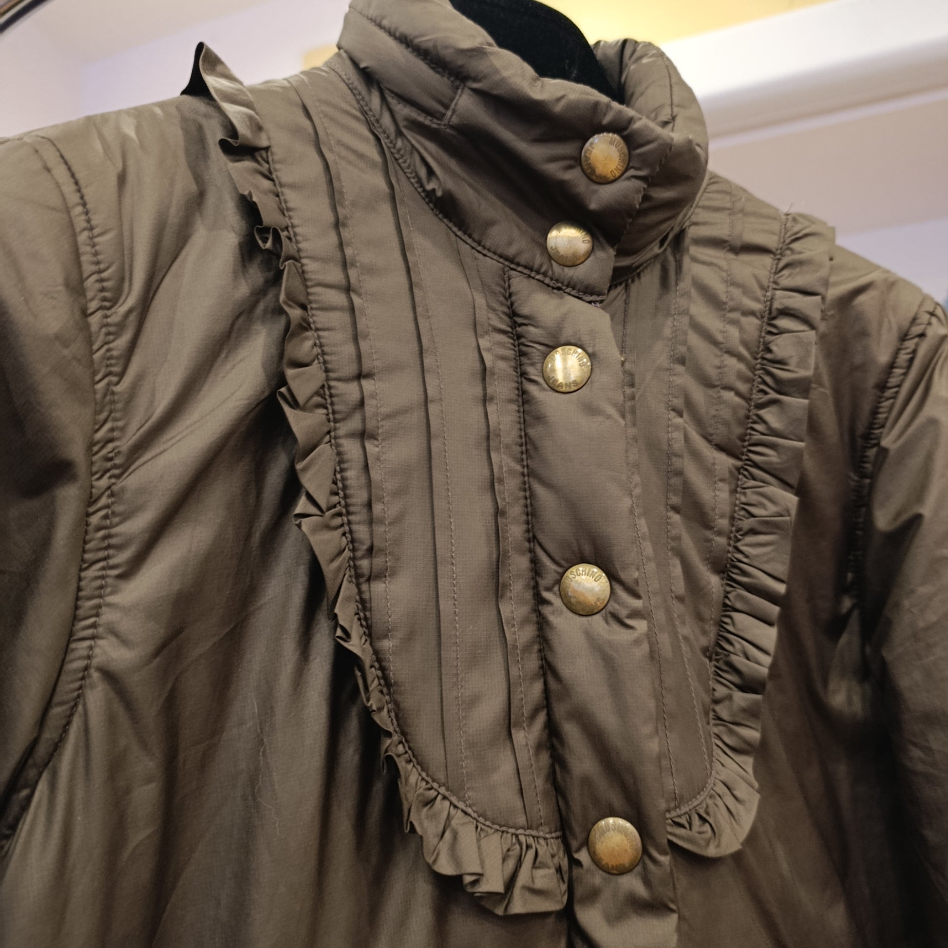 Ha questa particolare lavorazione sulle parte superiore del capo tono su tono, bottoni placcati oro loggati.