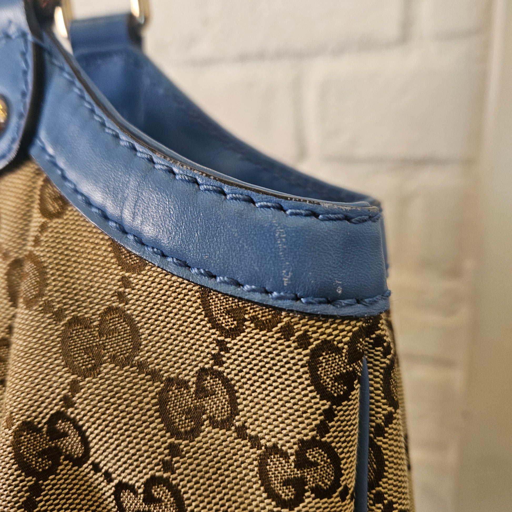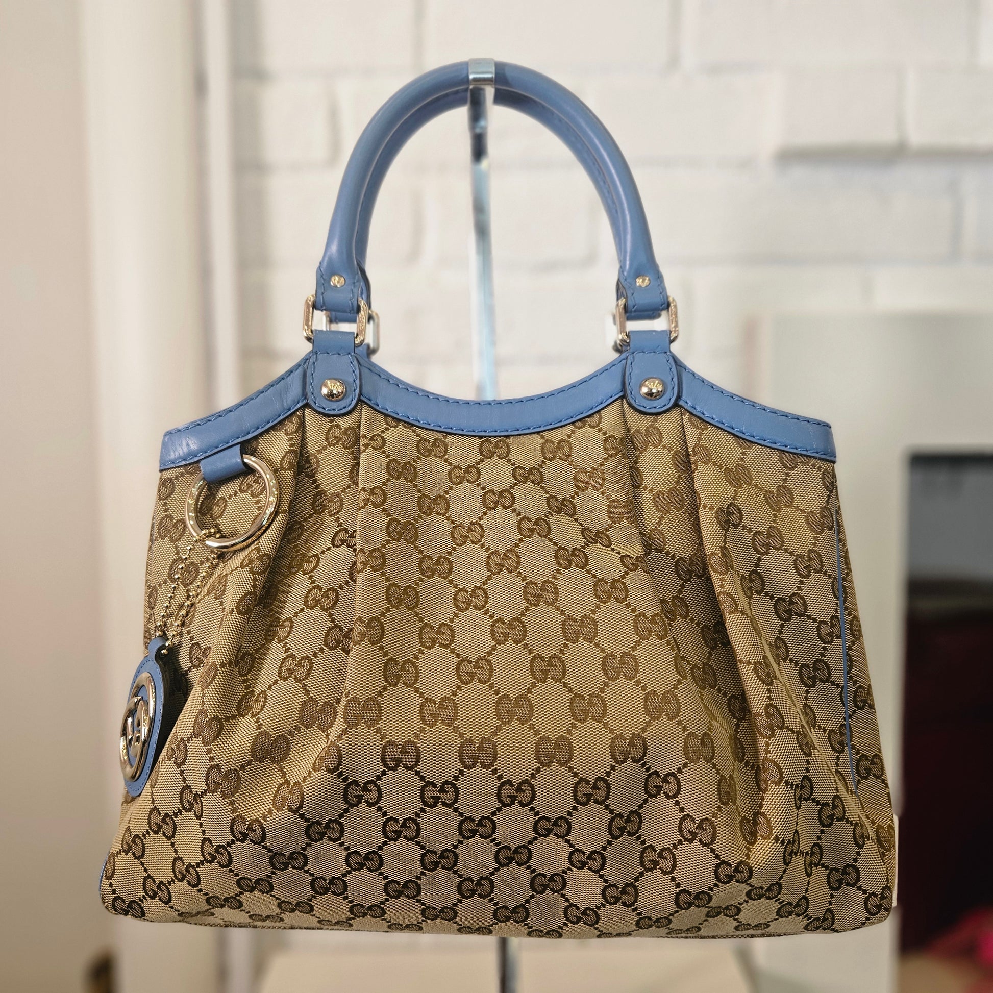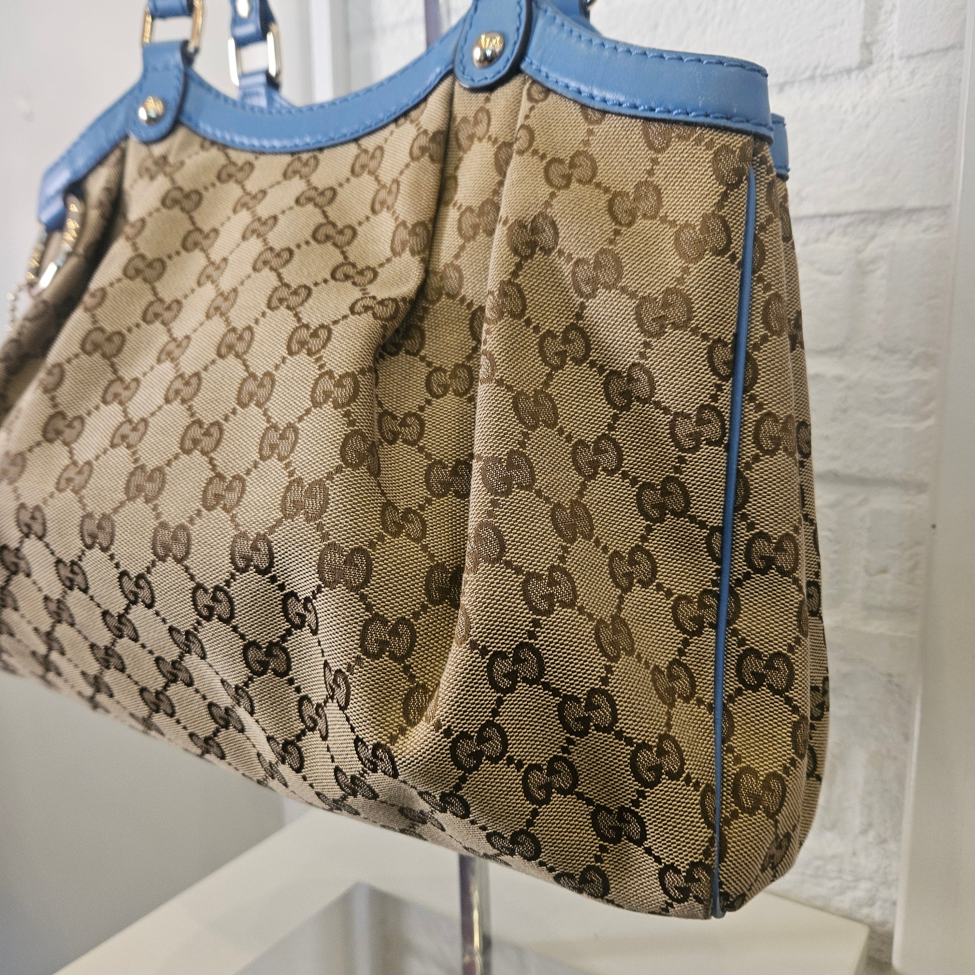Borsa Gucci Sukey in tela monogram e inserti in pelle azzurri, articolo in ottime condizioni non segnaliamo segni dovuti all'utilizzo e al tempo, angoli e manici in ottimo stato.