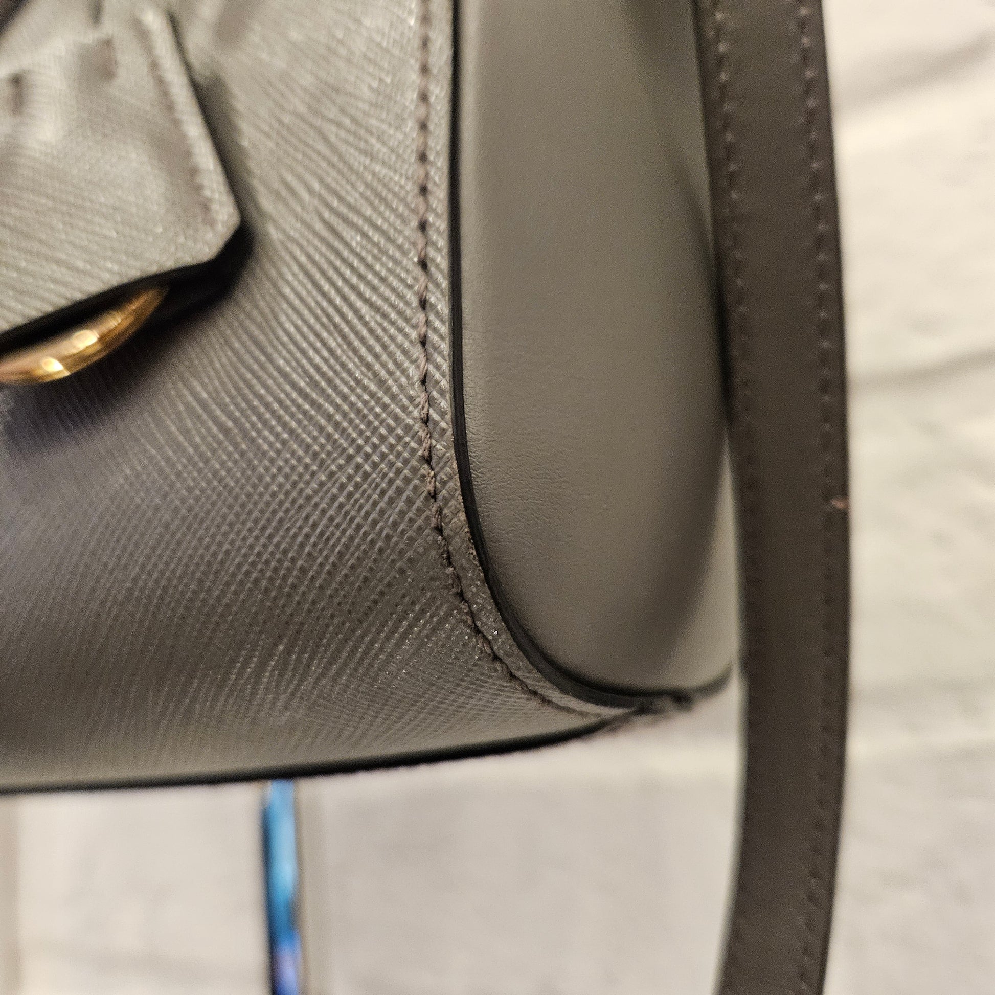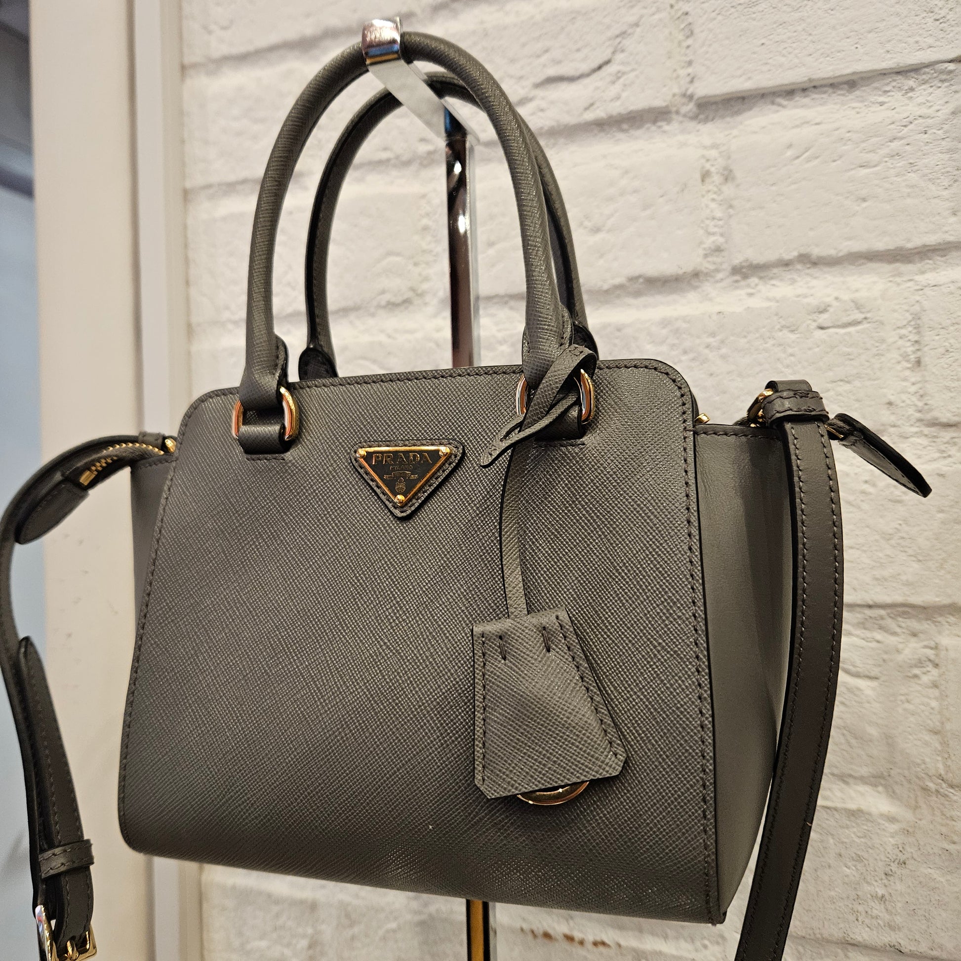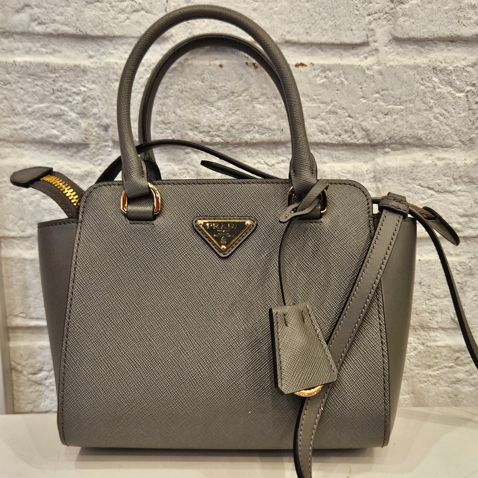 Mini Galleria preada in saffiano colorazione grigio con dettagli metallici dorati. Borsa con chiusura zip centrale dotata di manici e tracolla, interno con tasca.articolo in ottime condizioni privo di segni dovuti all'utilizzo e al tempo.