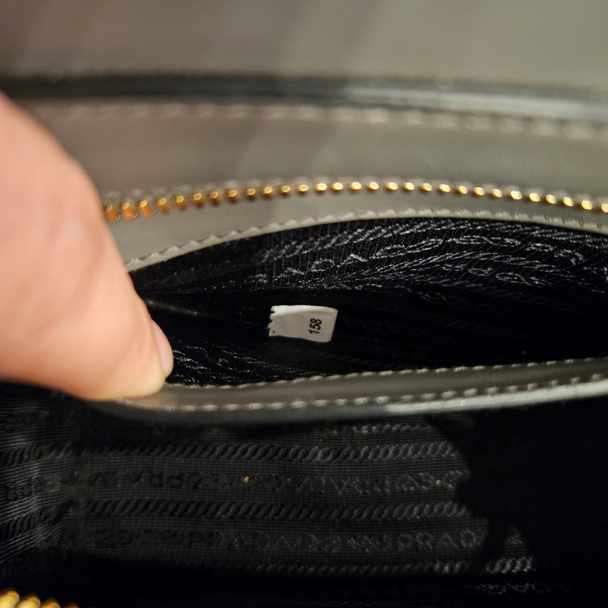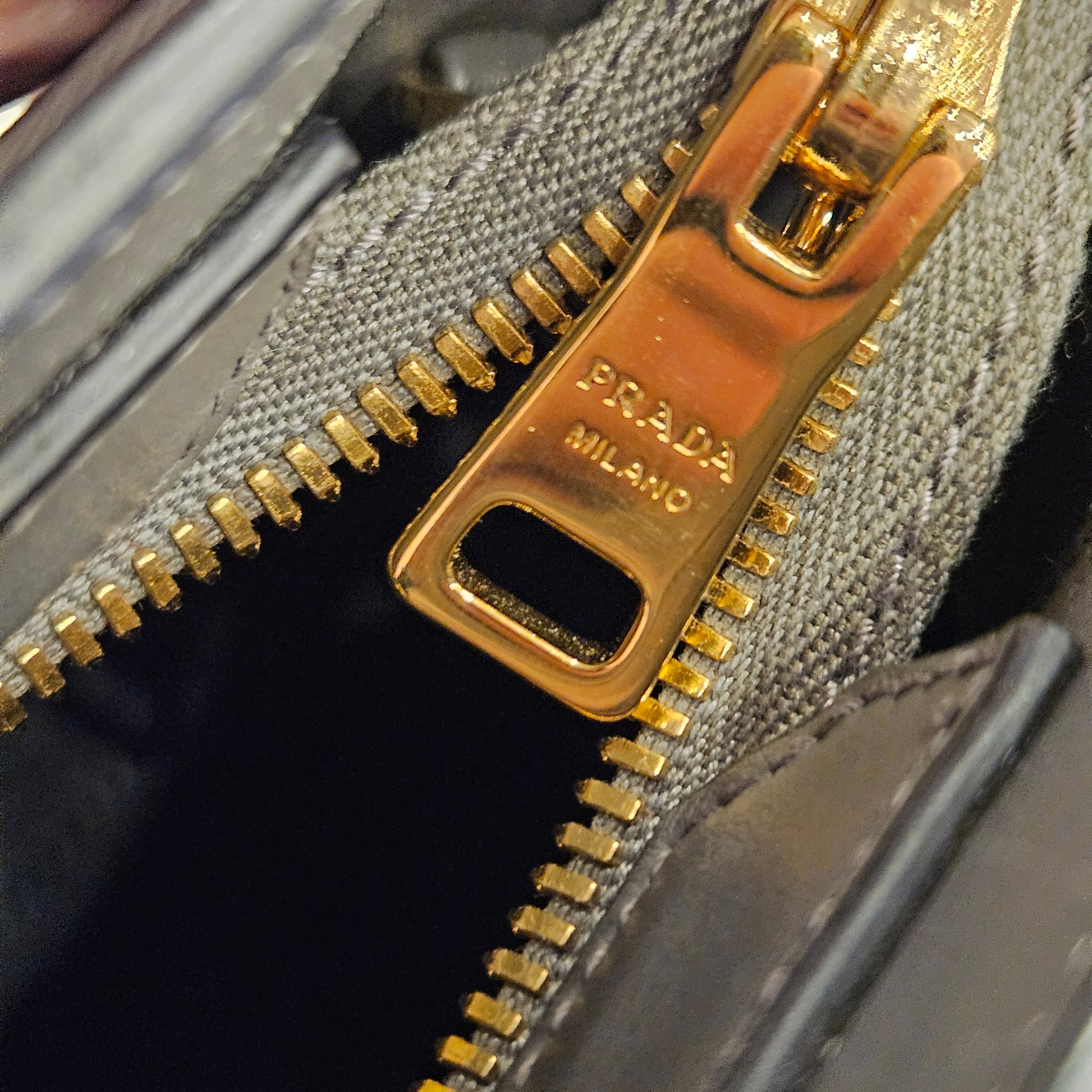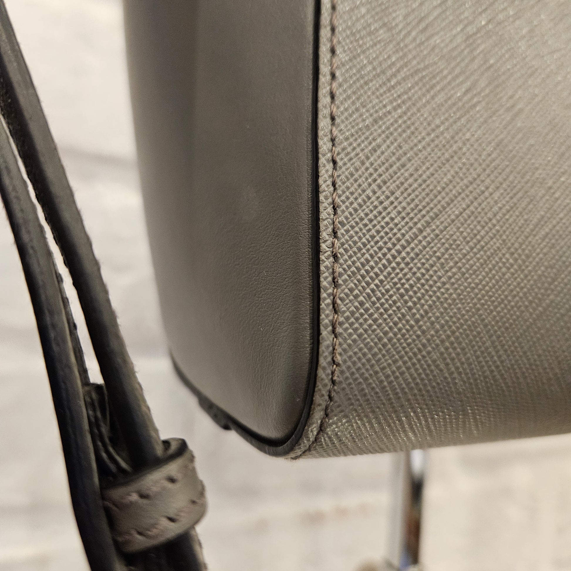 Mini Galleria preada in saffiano colorazione grigio con dettagli metallici dorati. Borsa con chiusura zip centrale dotata di manici e tracolla, interno con tasca.articolo in ottime condizioni privo di segni dovuti all'utilizzo e al tempo.
