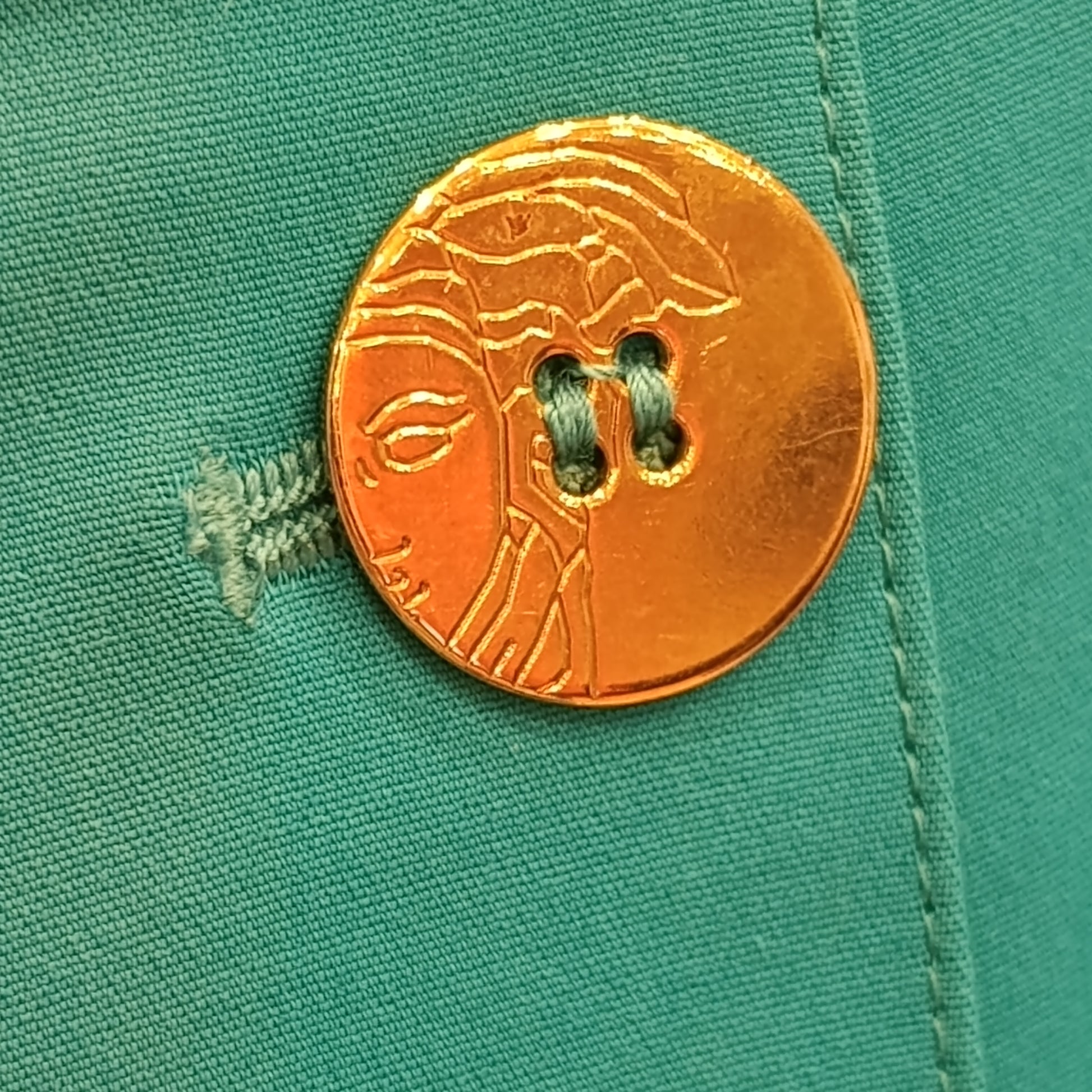 Decorato da questi bottoni laterali placcati oro con inciso il marchio Versace.