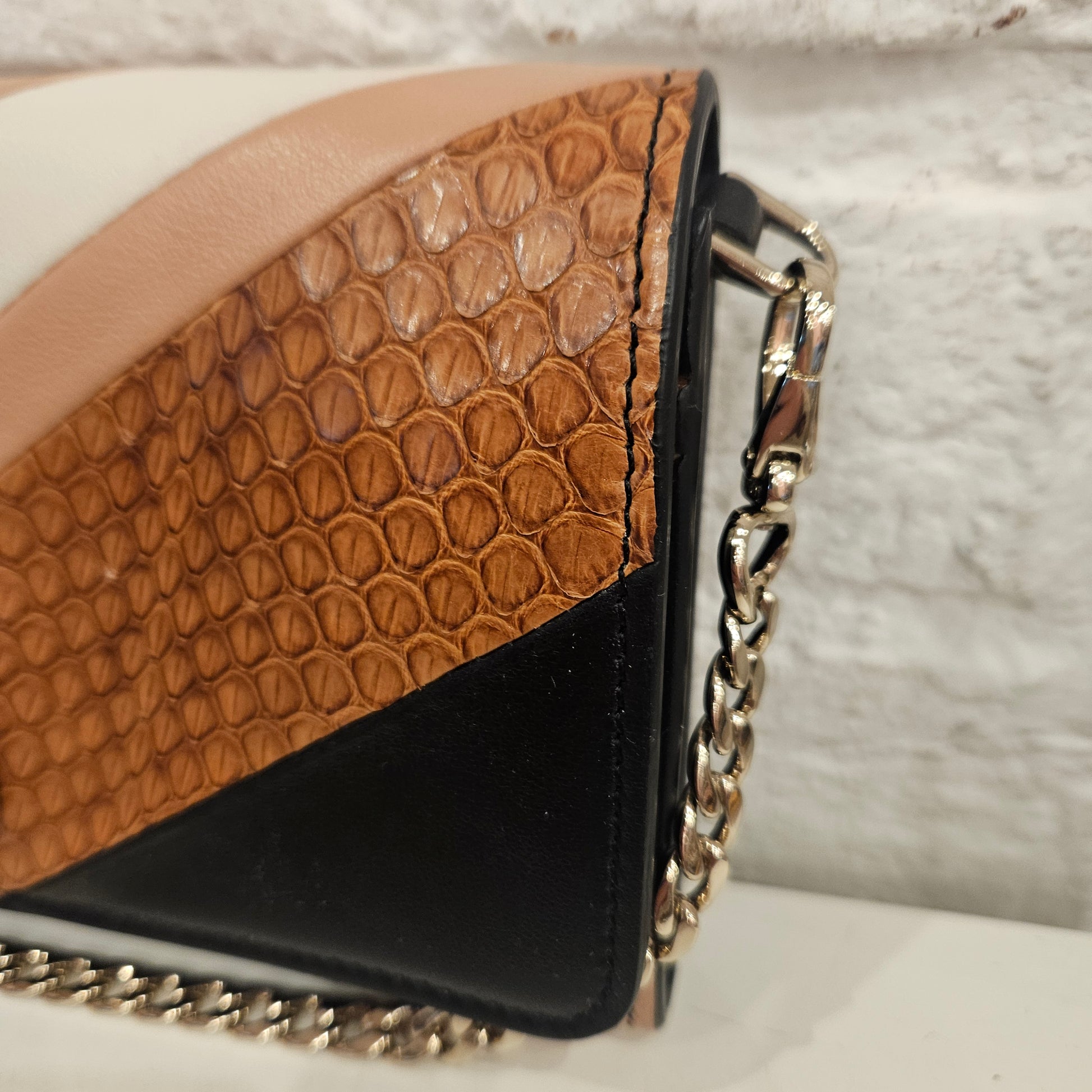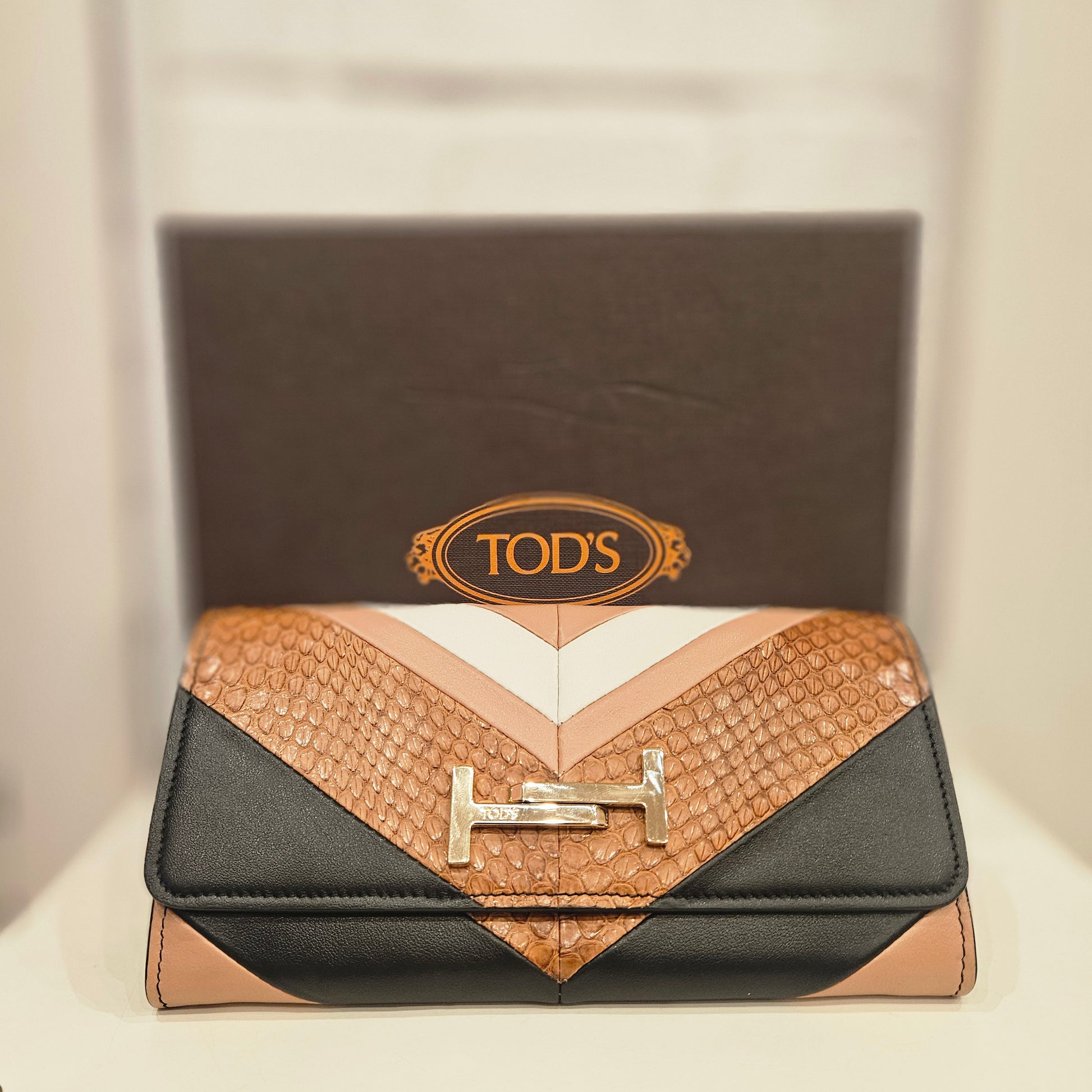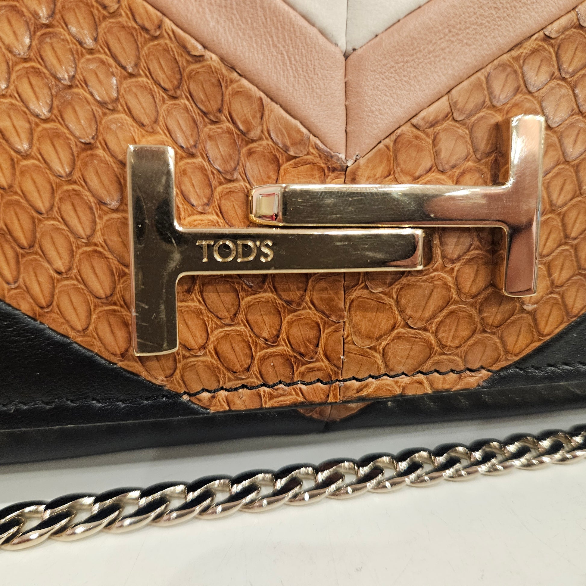 Pochette a tracolla Tod's in pelle colorazione marrone e nera con inserti in rettile, Pochette in ottime condizioni, interno tre scomparti di cui uno con chiusura a zip e un altra con porta tessere. Venduta con dustbag e scatola