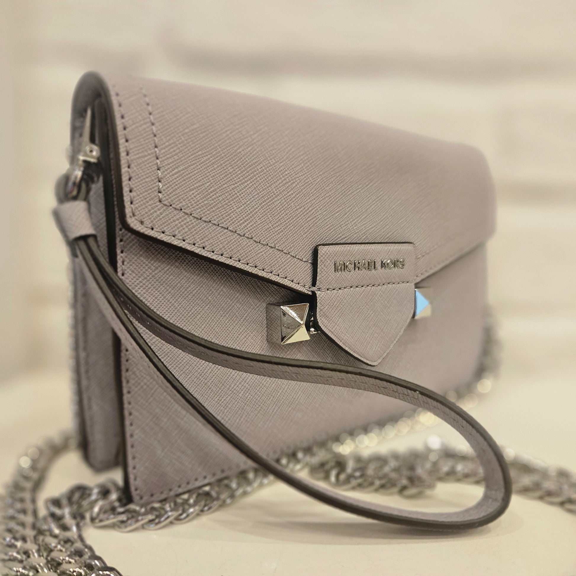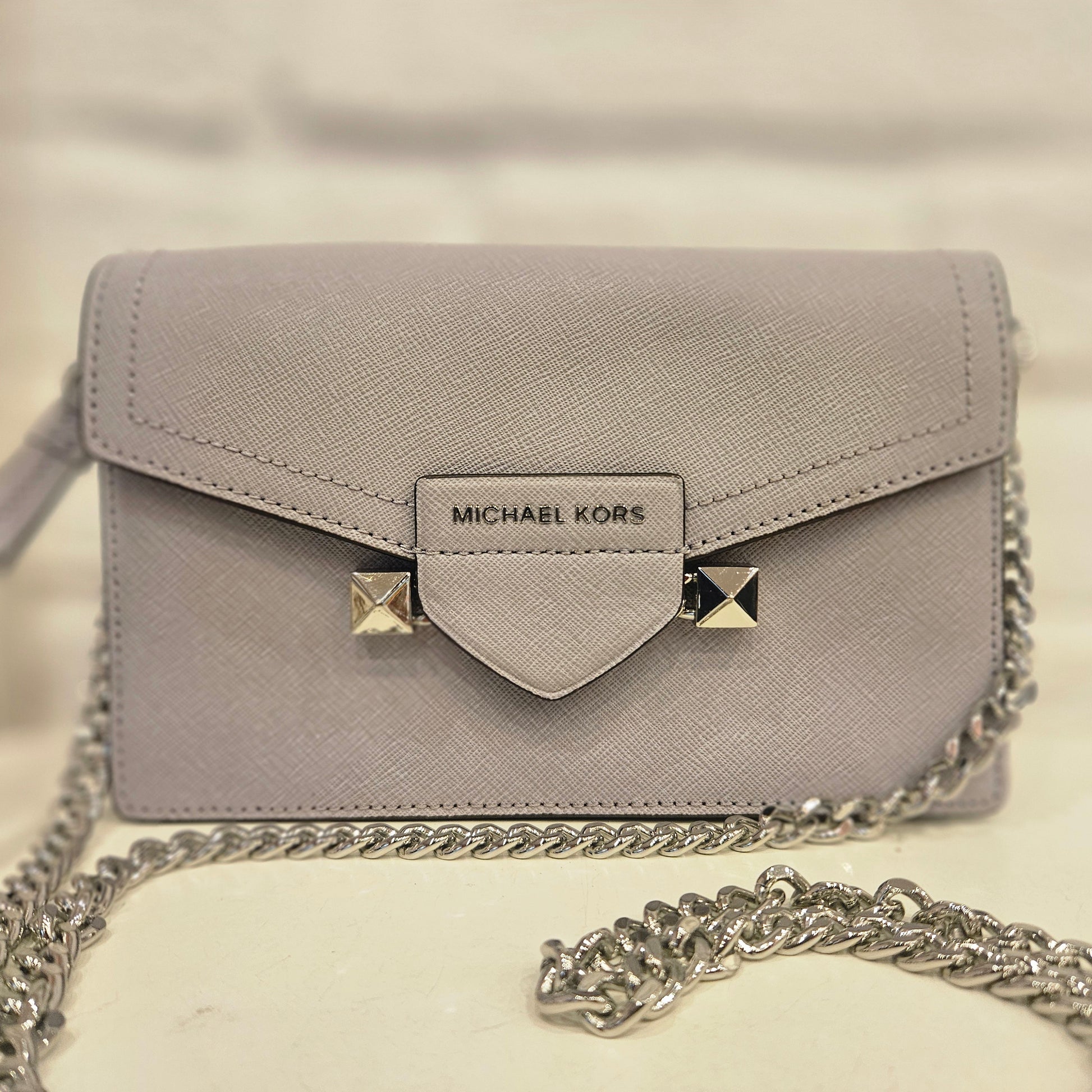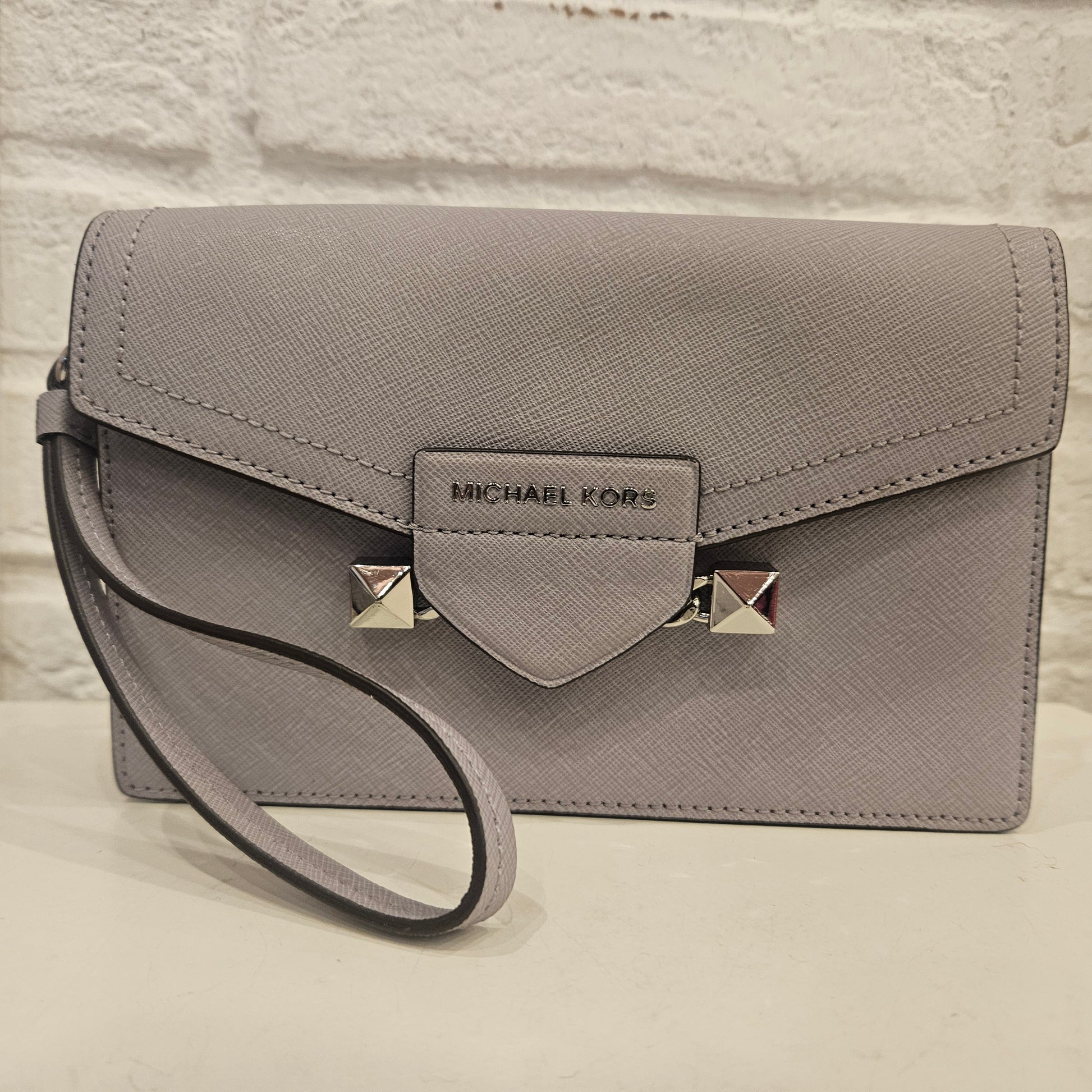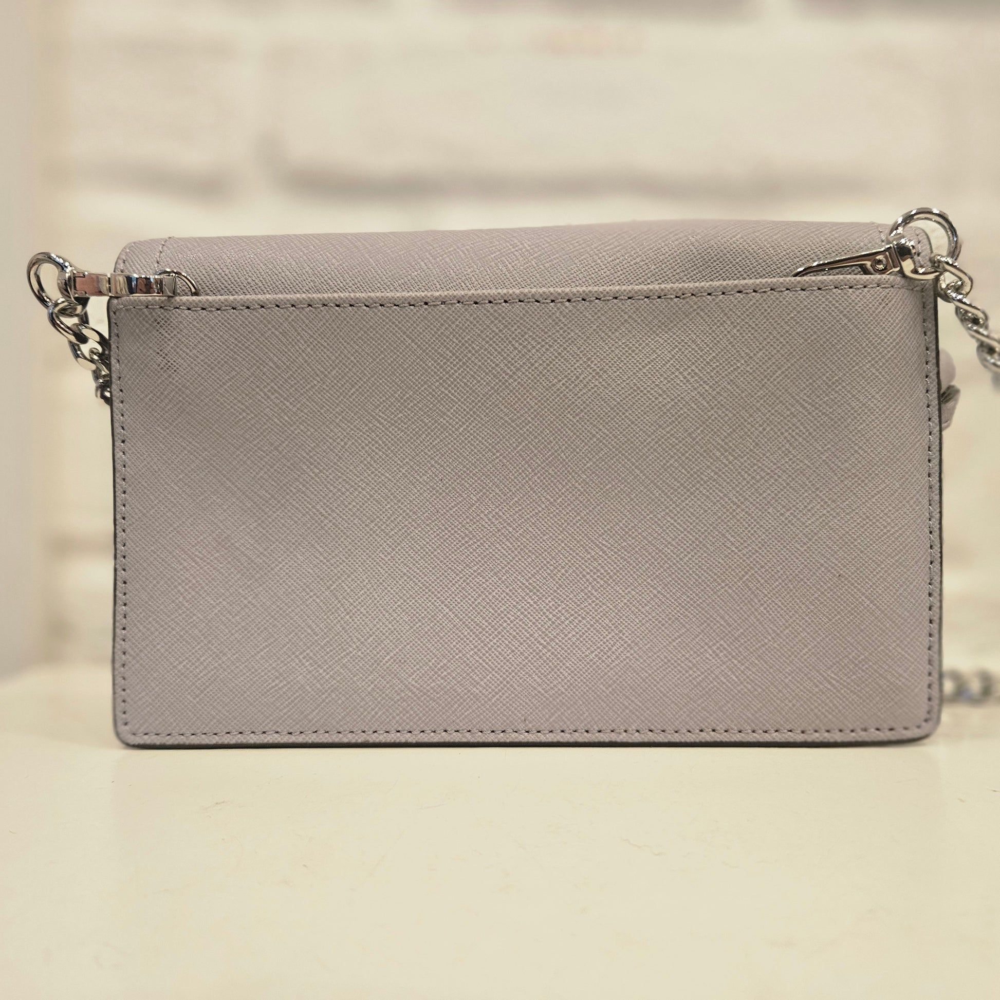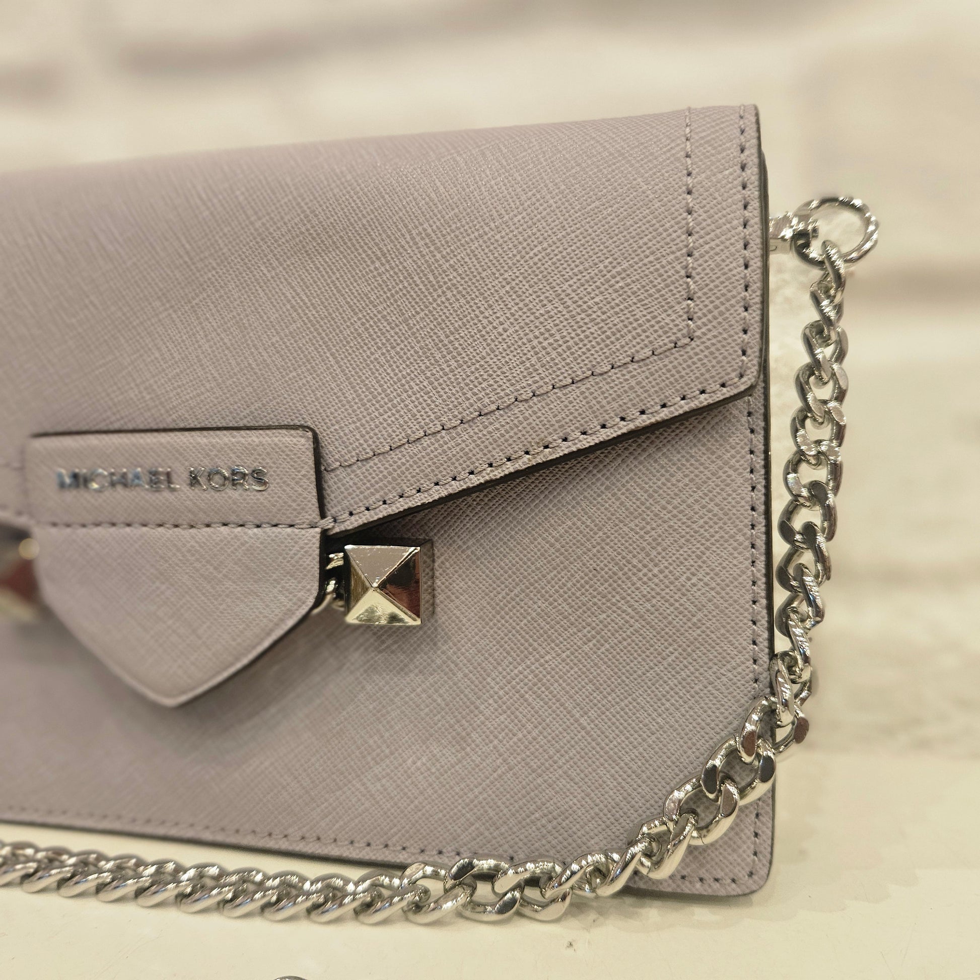 Pochette a Tracolla (removibile)Michael Kors in saffiano colorazione lilla e dettagli metallici cromati, interno suddiviso in due scomparti di cui uno dotato di porta tessere su entrambi i lati.