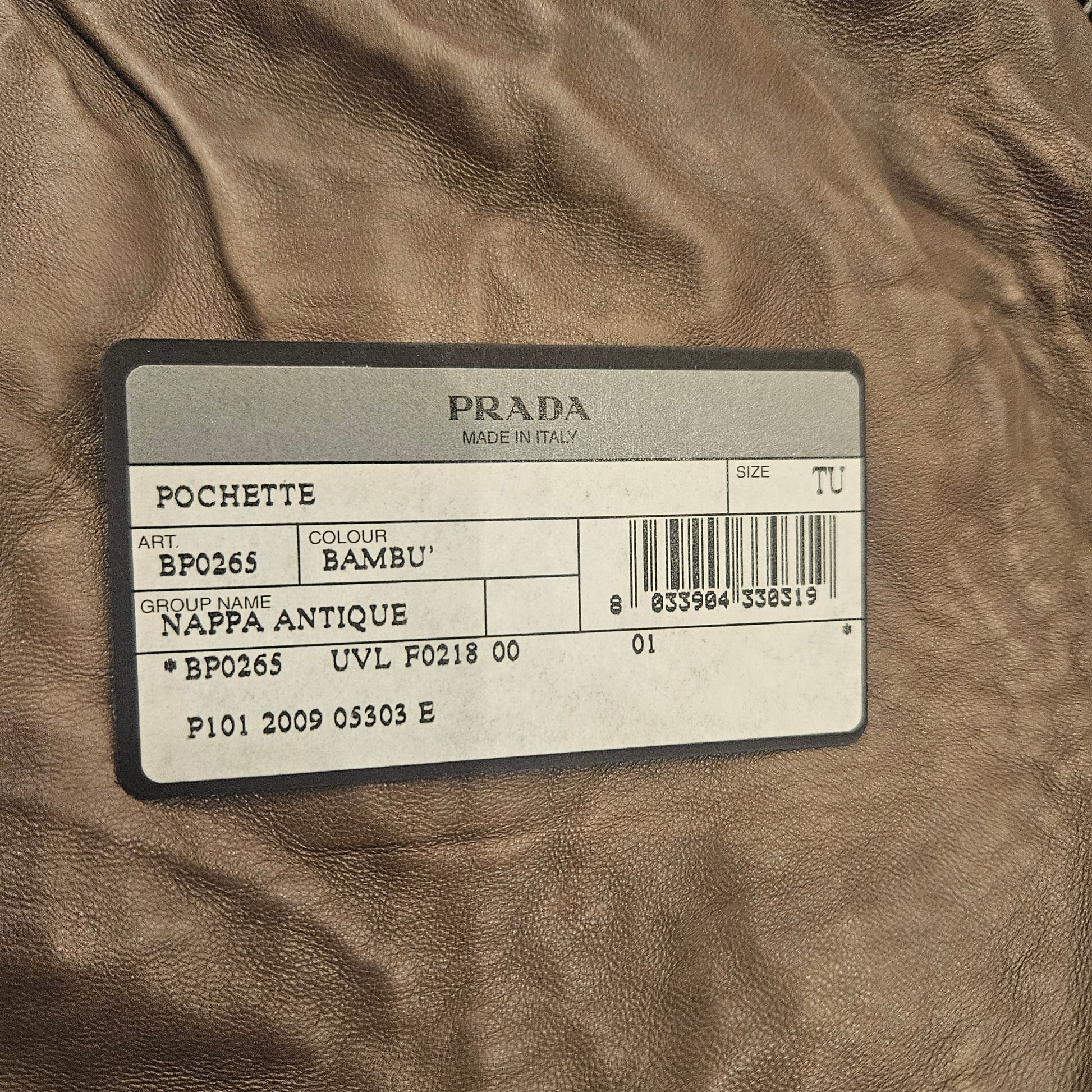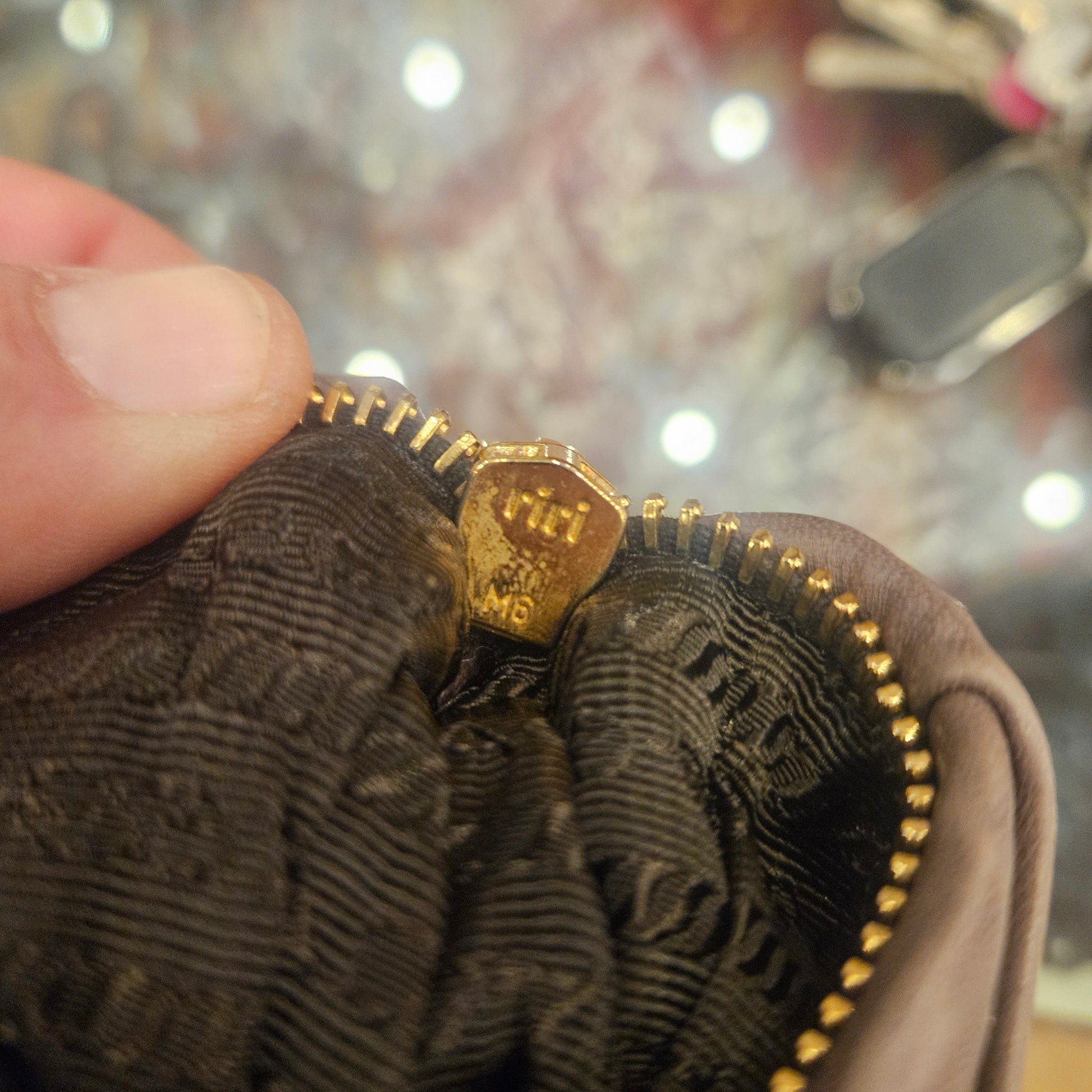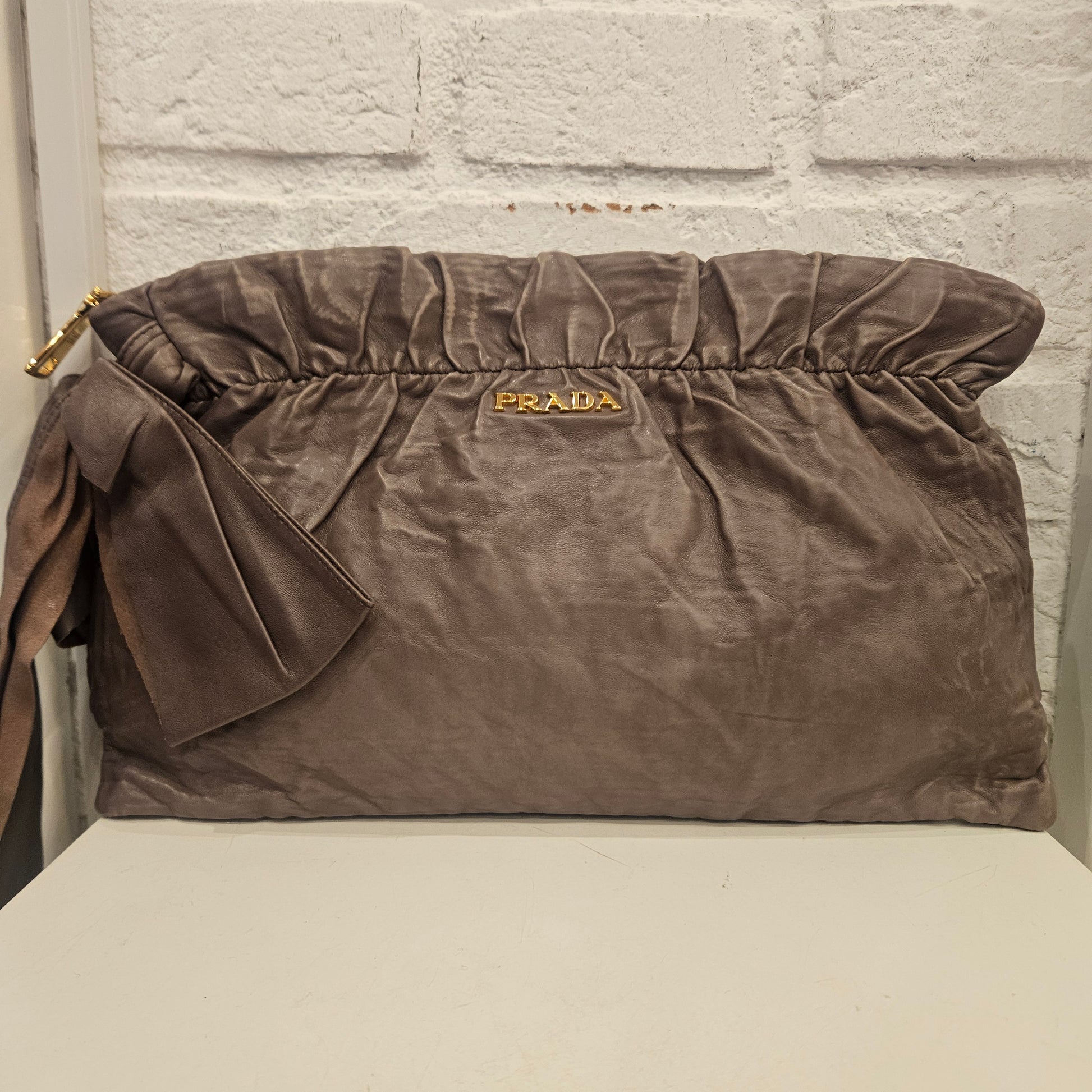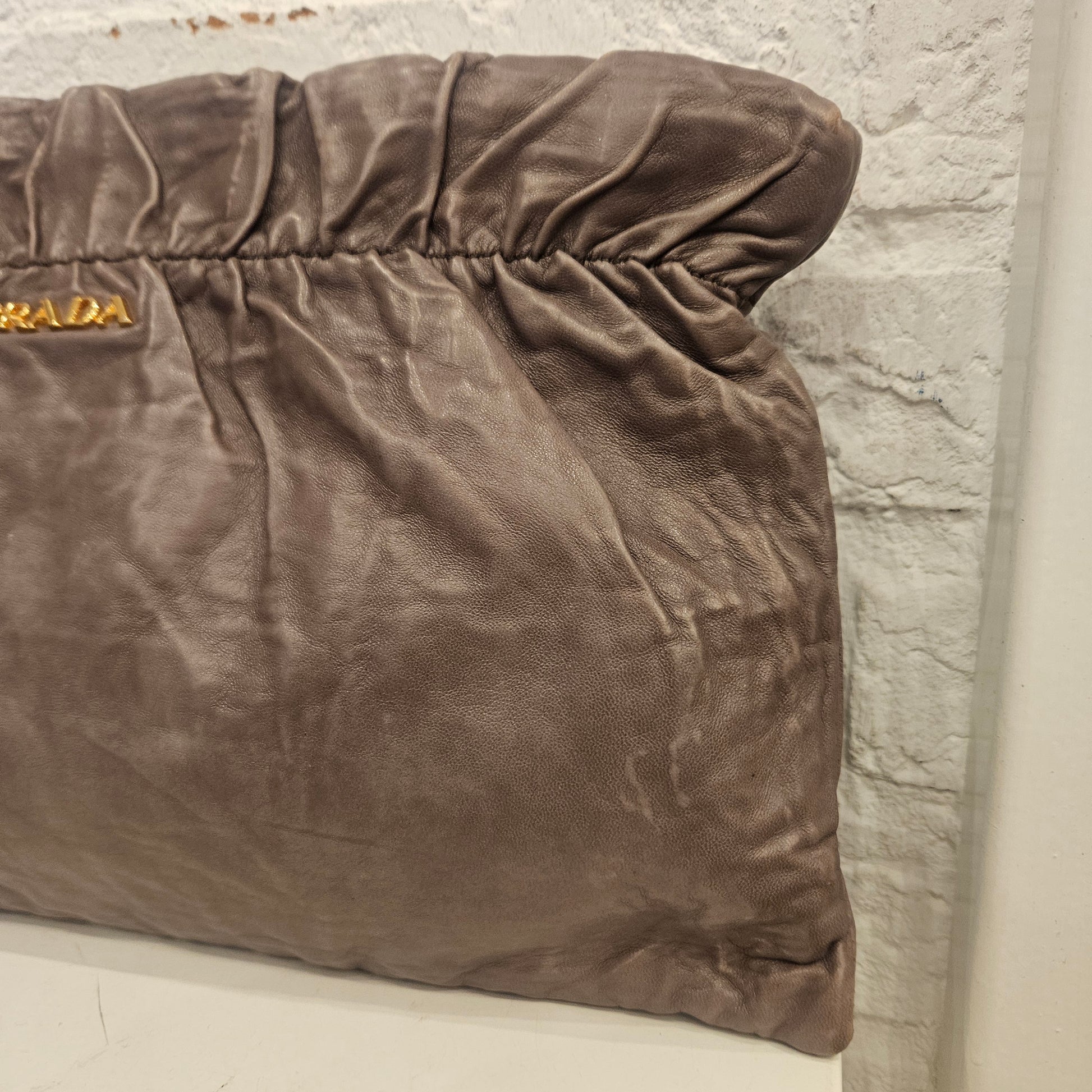 Pochette Prada in colorazione grigia e dettagli metallici oro. La borsa presenta segni dovuti all'utilizzo in prossimità dell'apertura e della base.