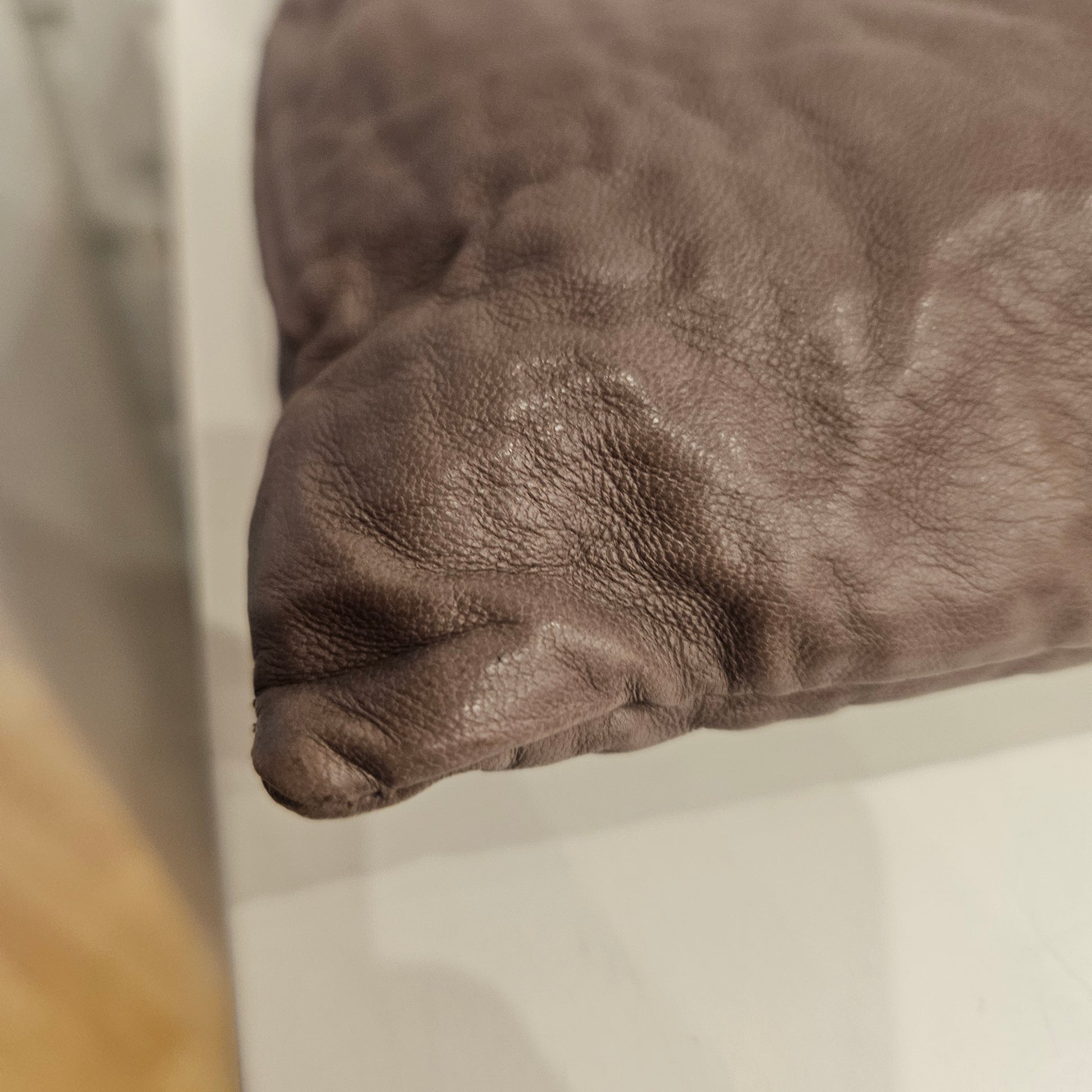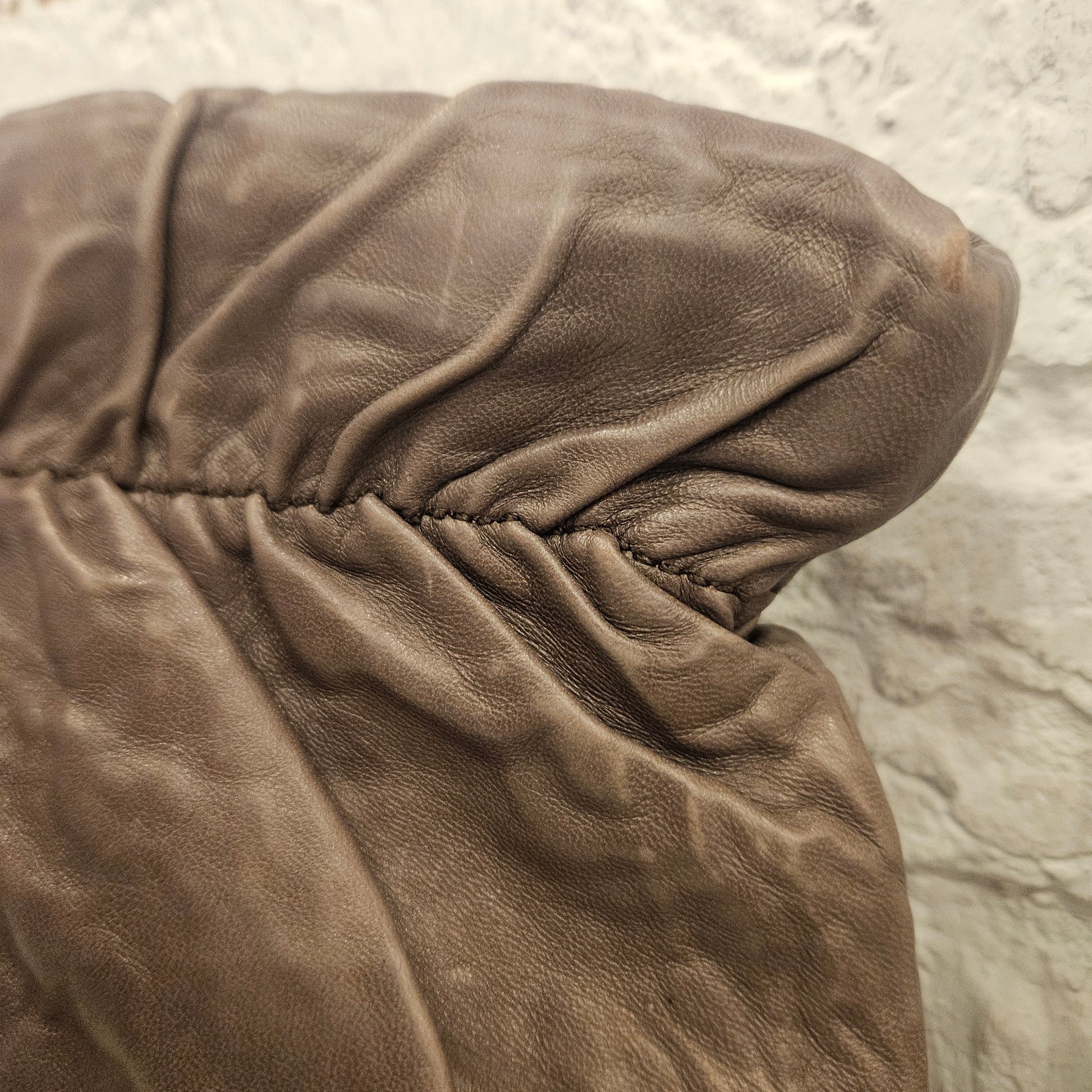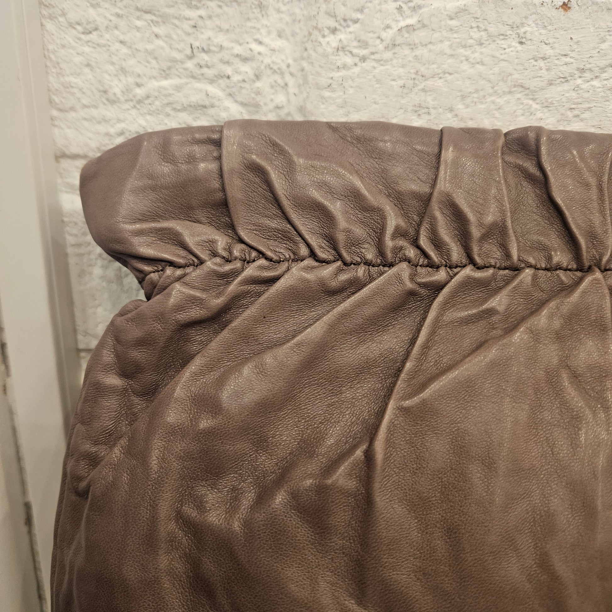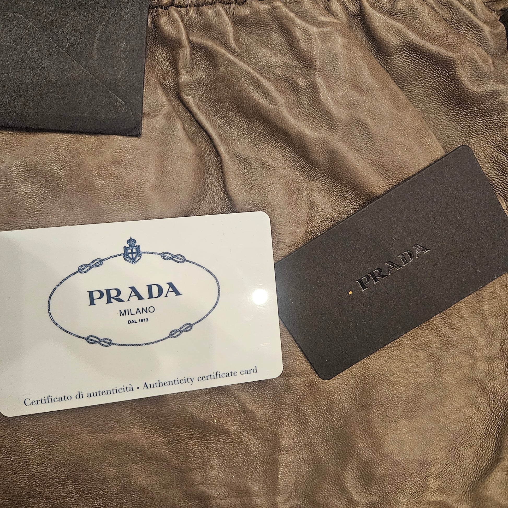 Pochette Prada in colorazione grigia e dettagli metallici oro. La borsa presenta segni dovuti all'utilizzo in prossimità dell'apertura e della base.
