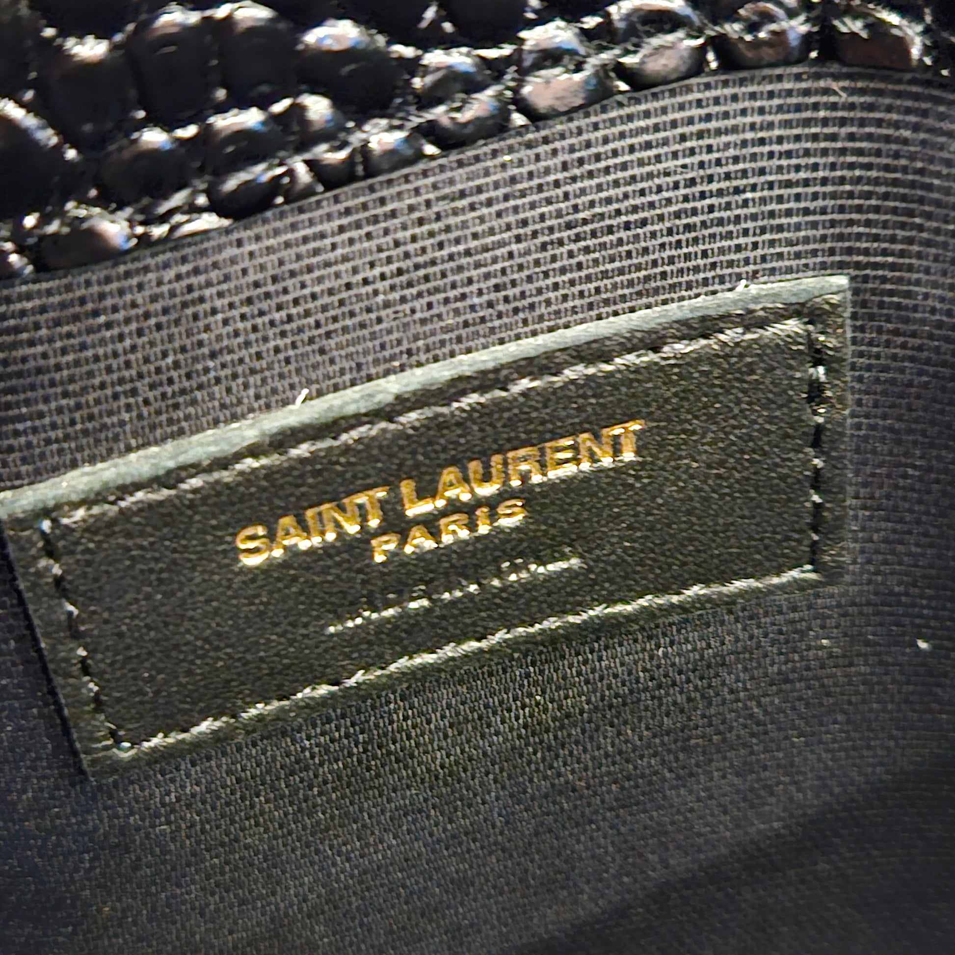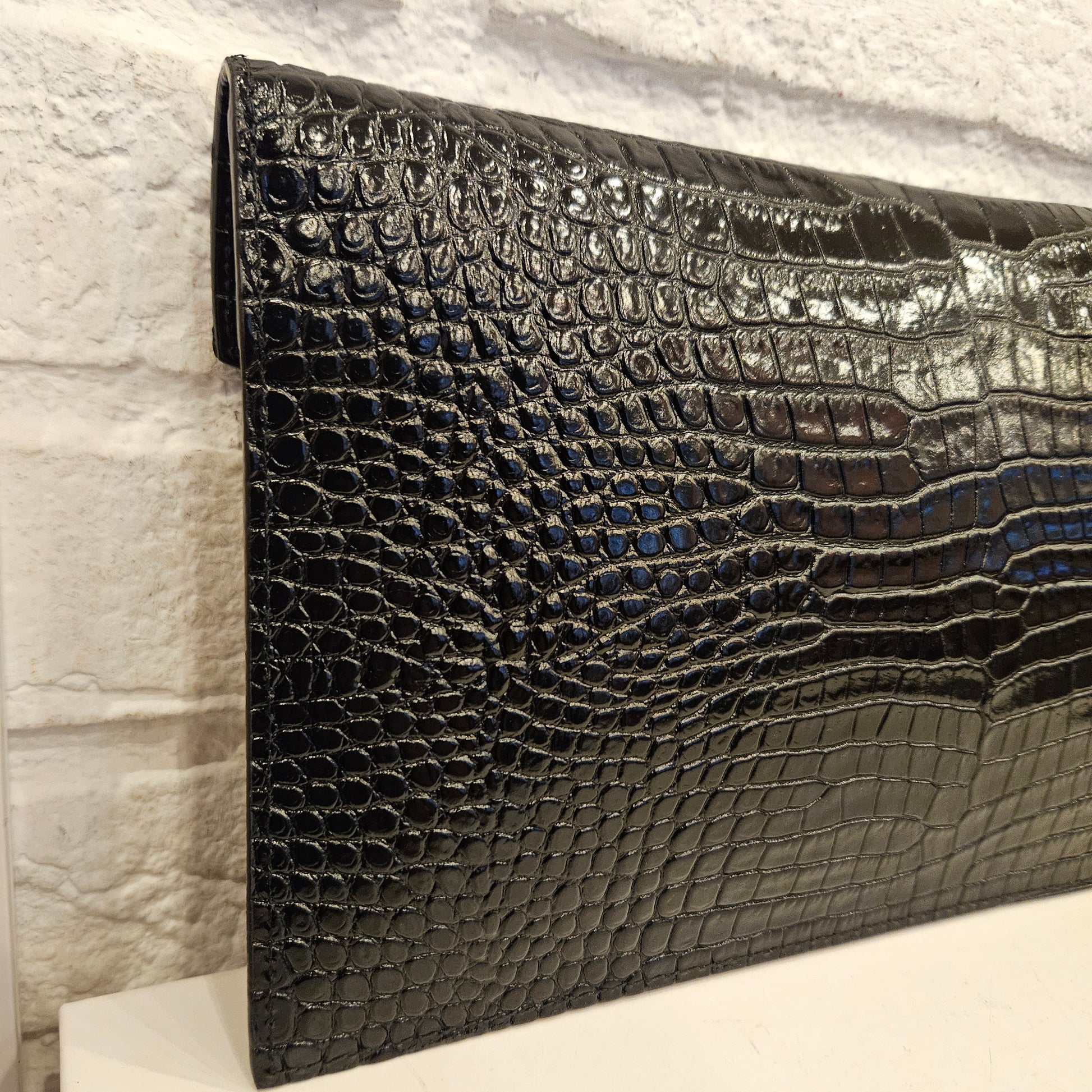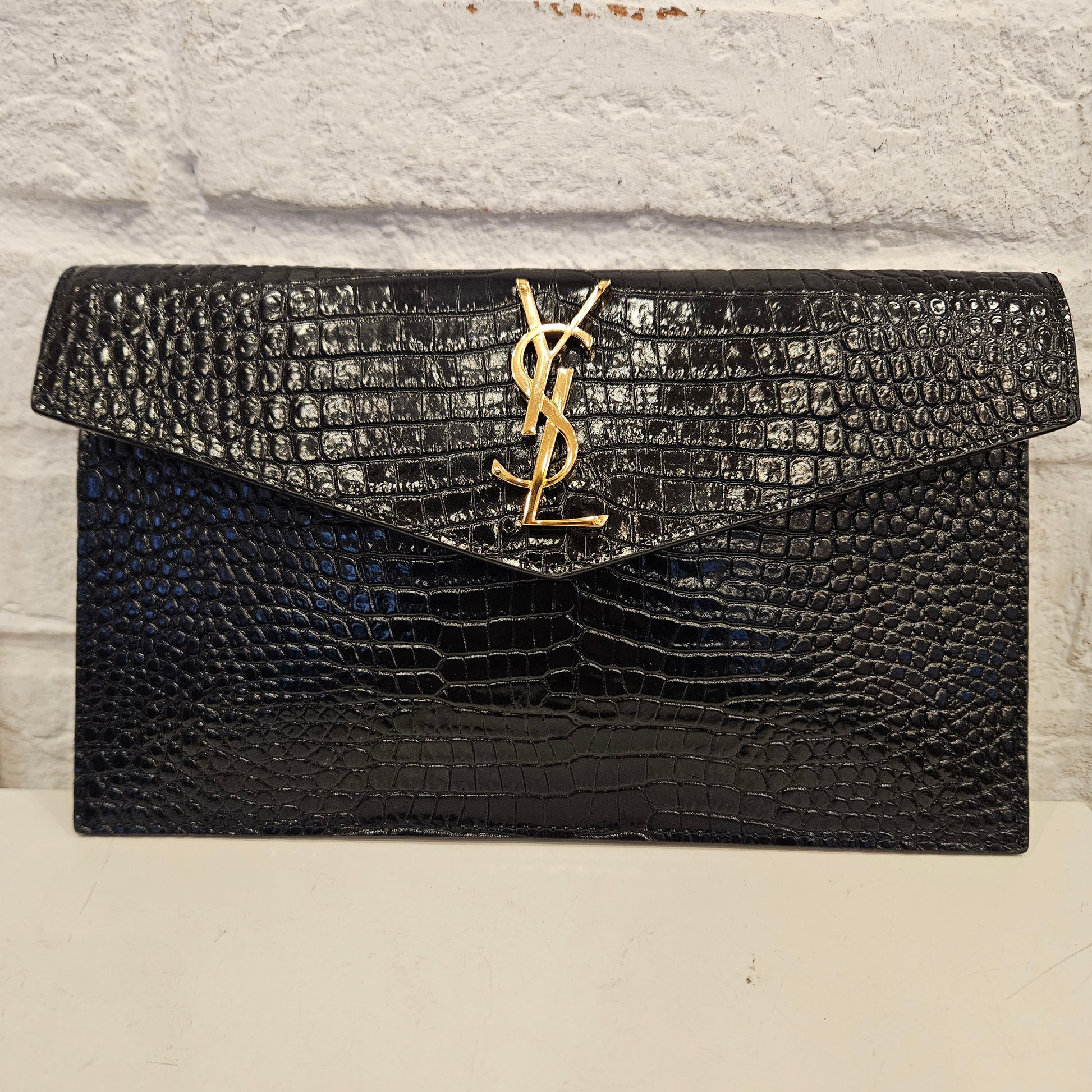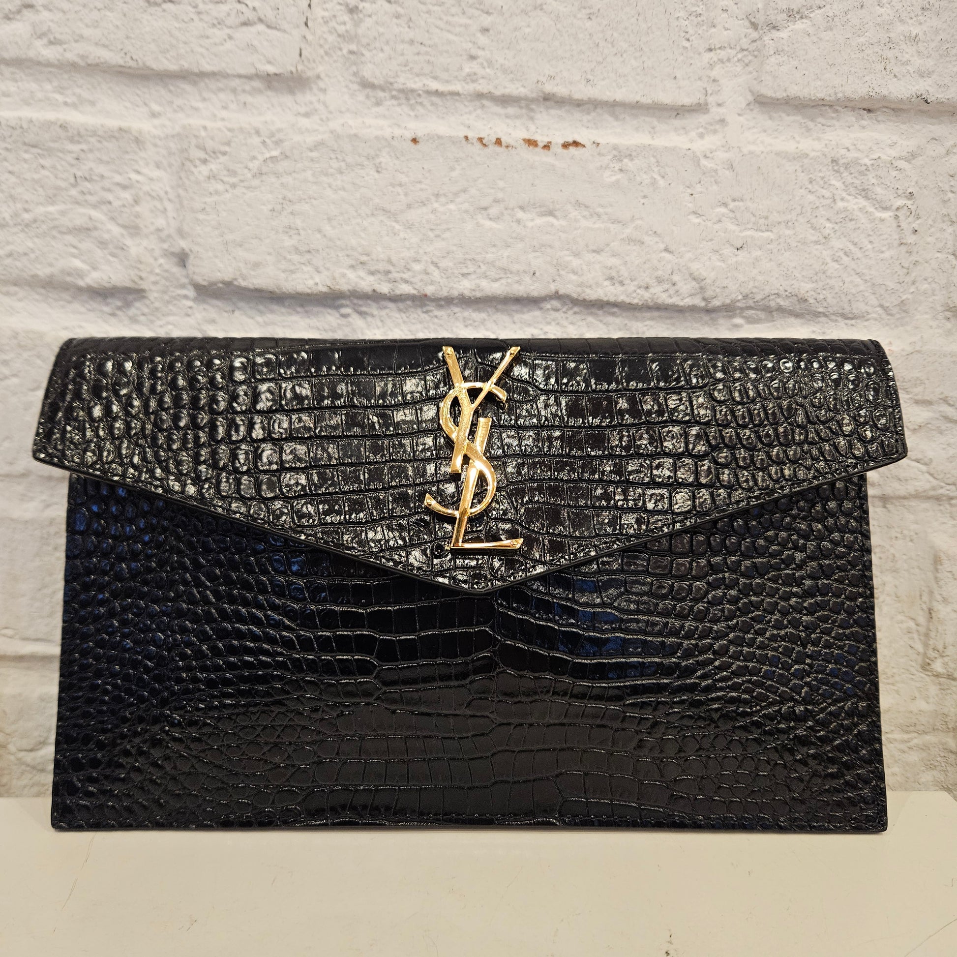 Pochette Saint Laurent in pelle nera e stampa cocco con logo frontale dorato, Pochette a mano larga, comoda e molto elegante