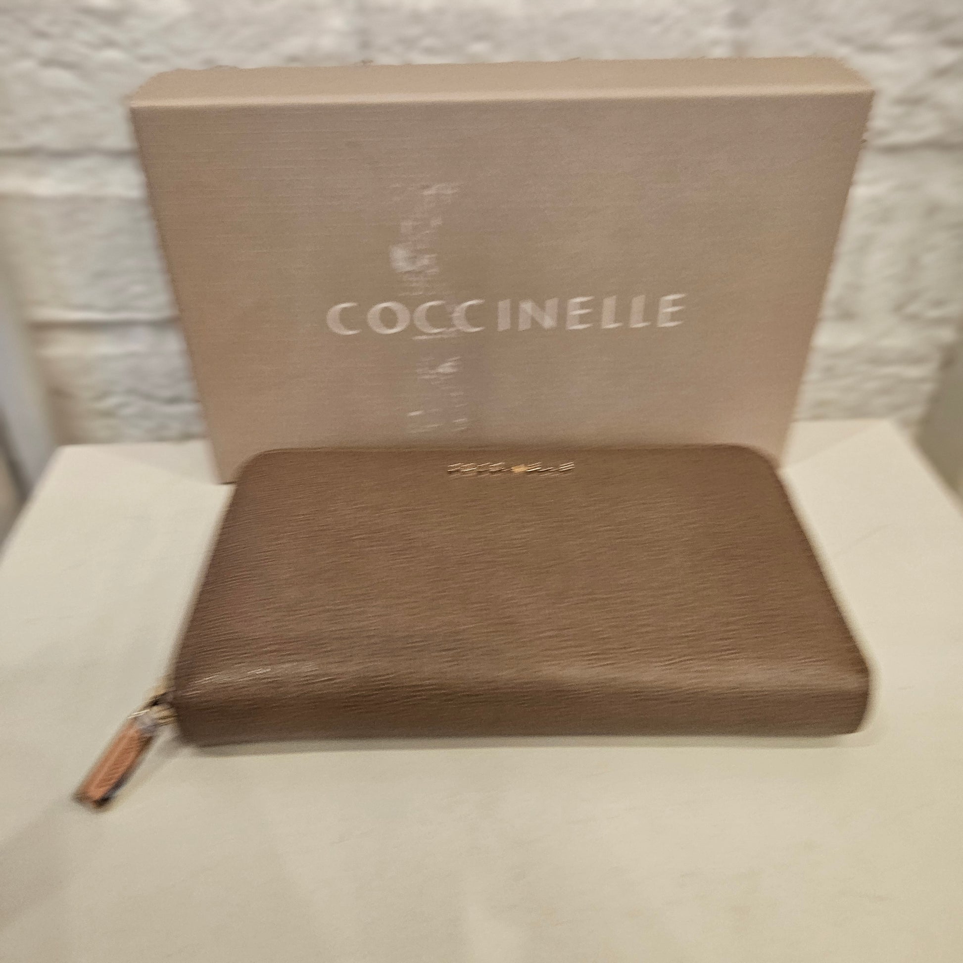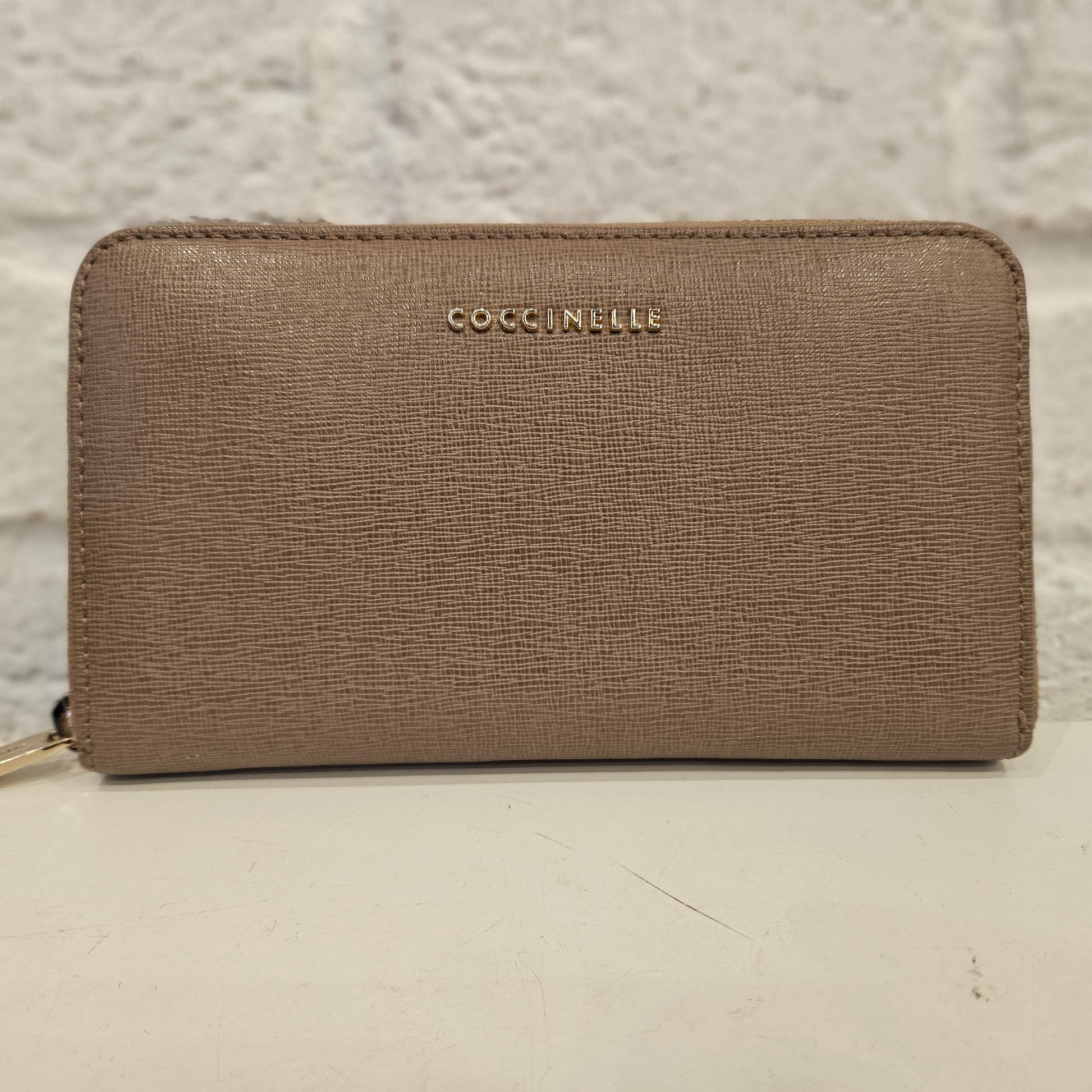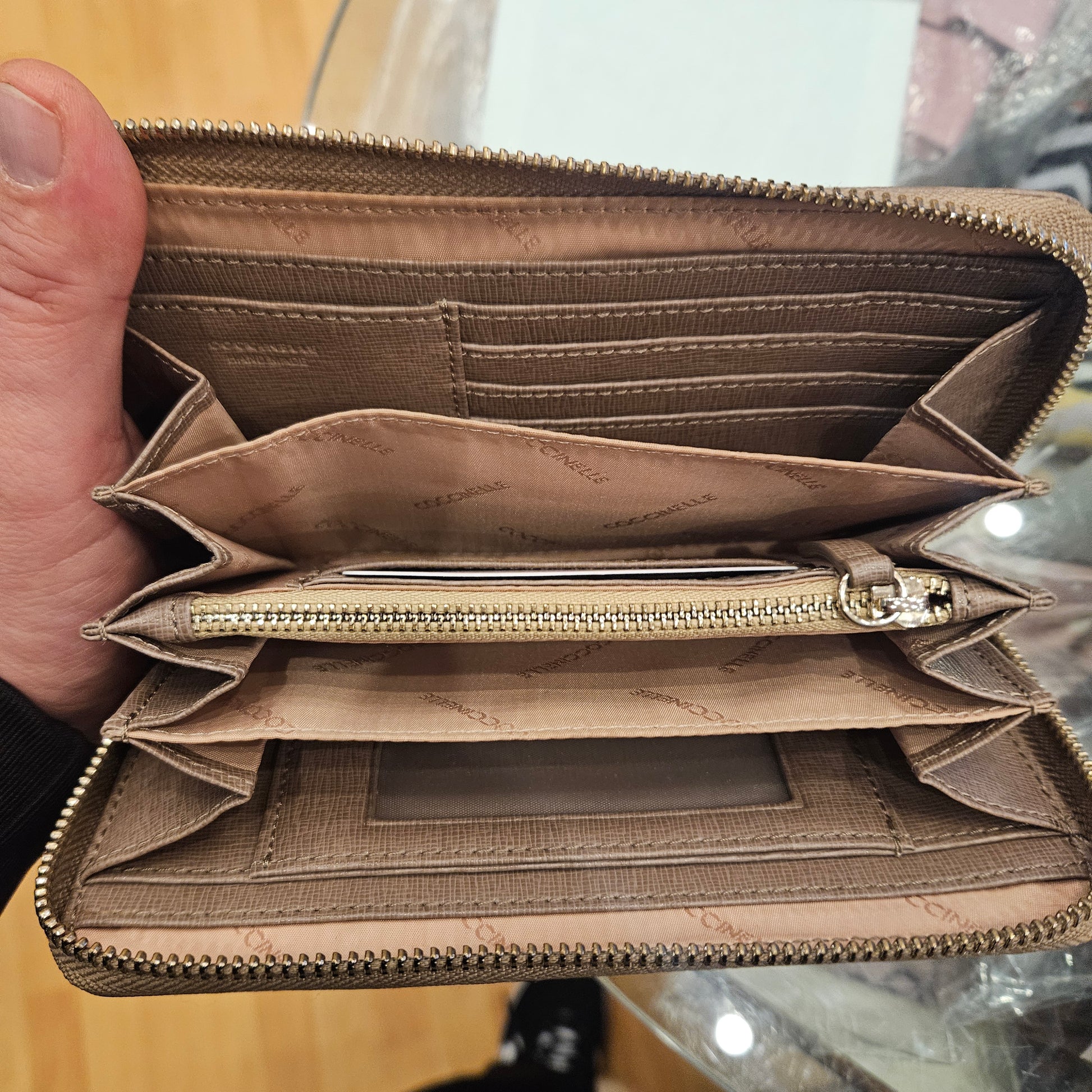 Portafoglio Coccinelle in pelle, colorazione beige marroncino e dettagli metallici dorati, apertura a fisarmonica con 5 scomparti.