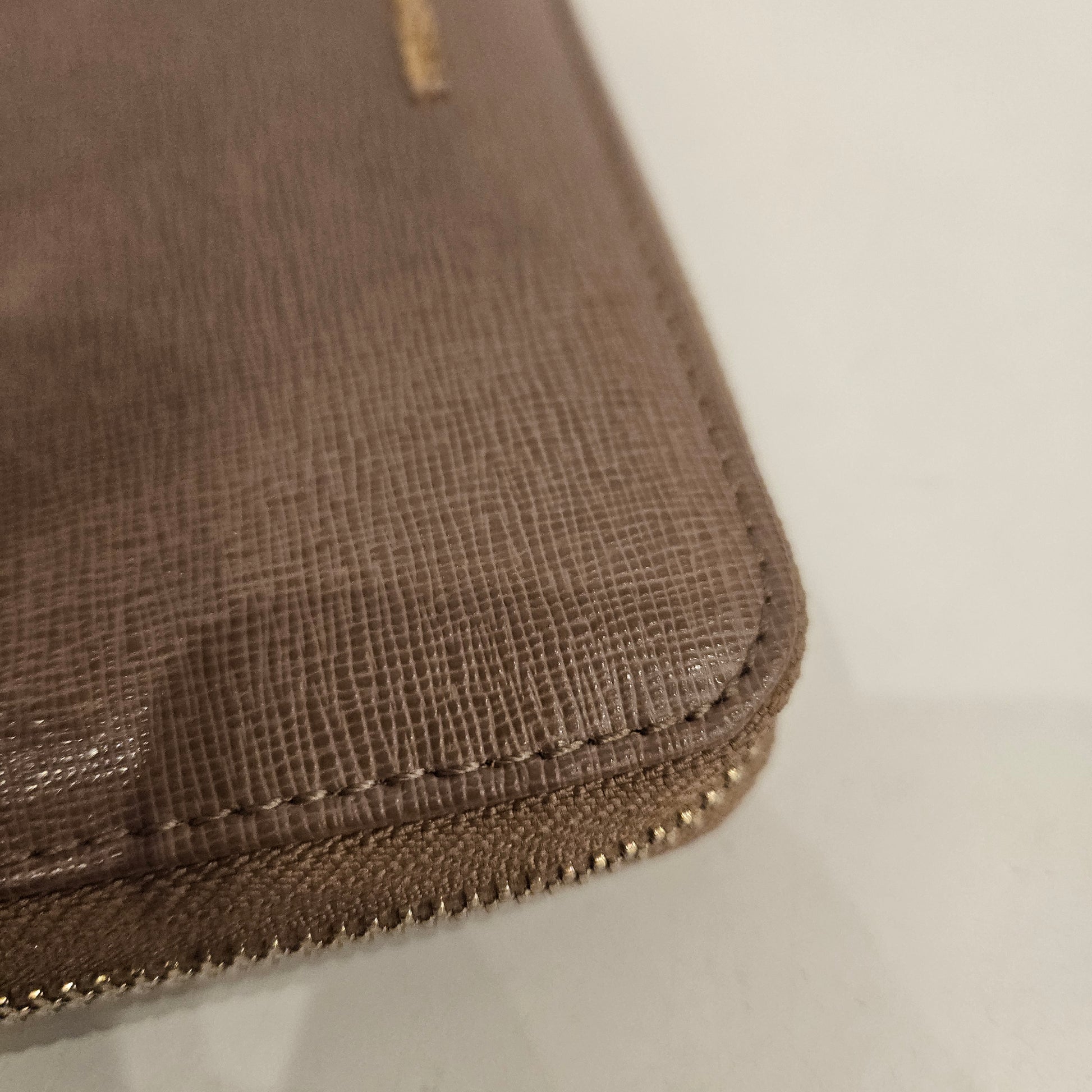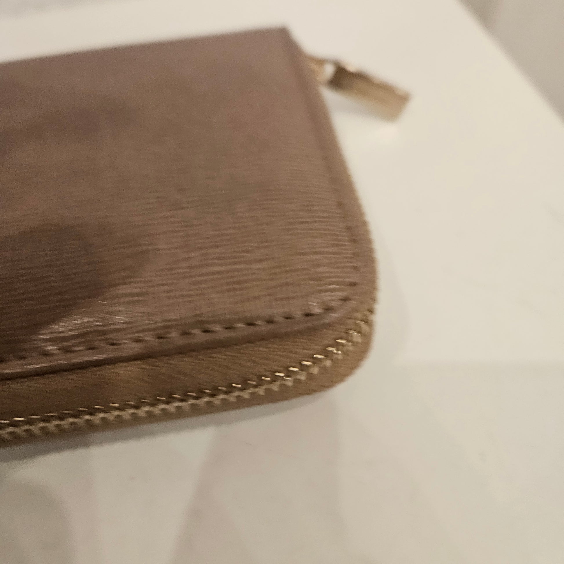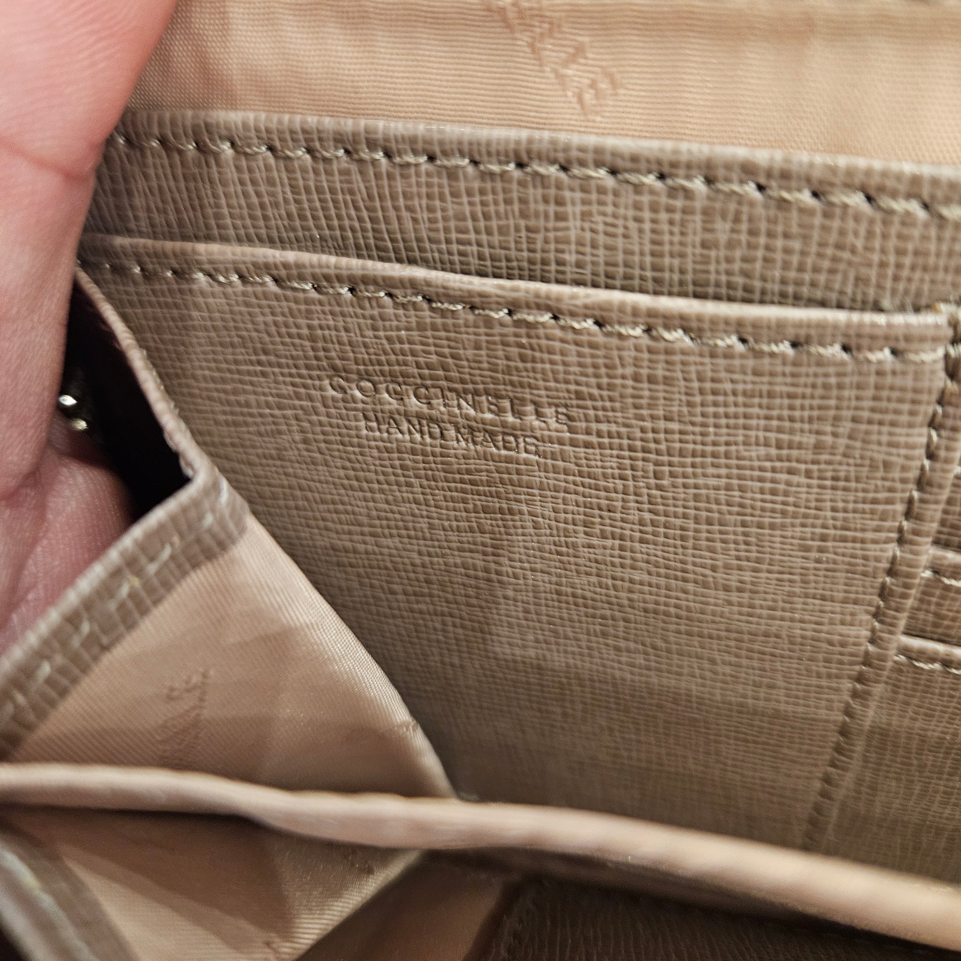 Portafoglio Coccinelle in pelle, colorazione beige marroncino e dettagli metallici dorati, apertura a fisarmonica con 5 scomparti.