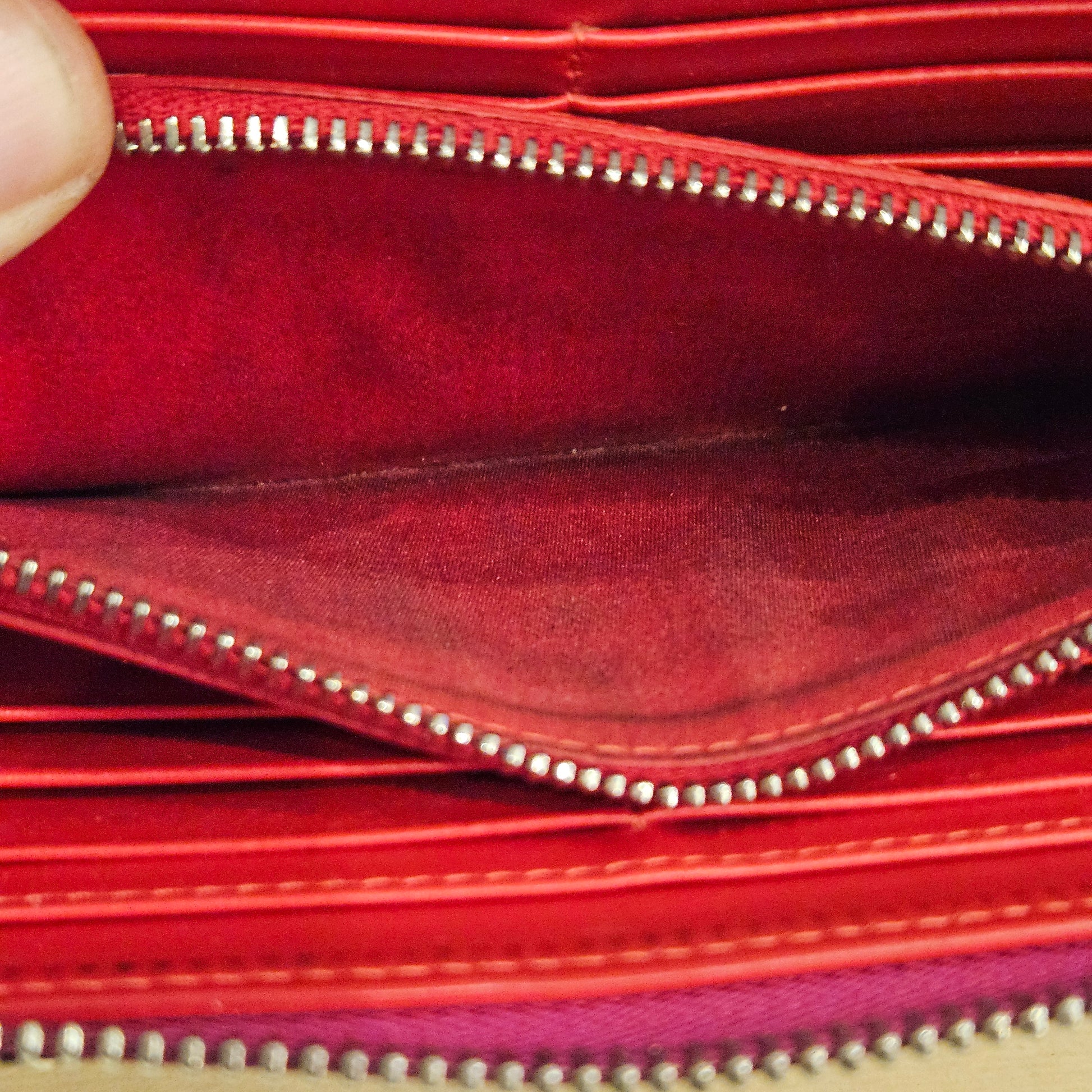 Portafoglio Louboutin in pelle colorazione viola e borchie dalla bellissima sfumatura oro/argento/nero, interno in pelle rossa 2 scomparti con porta tessere e porta monete con chiusura zip